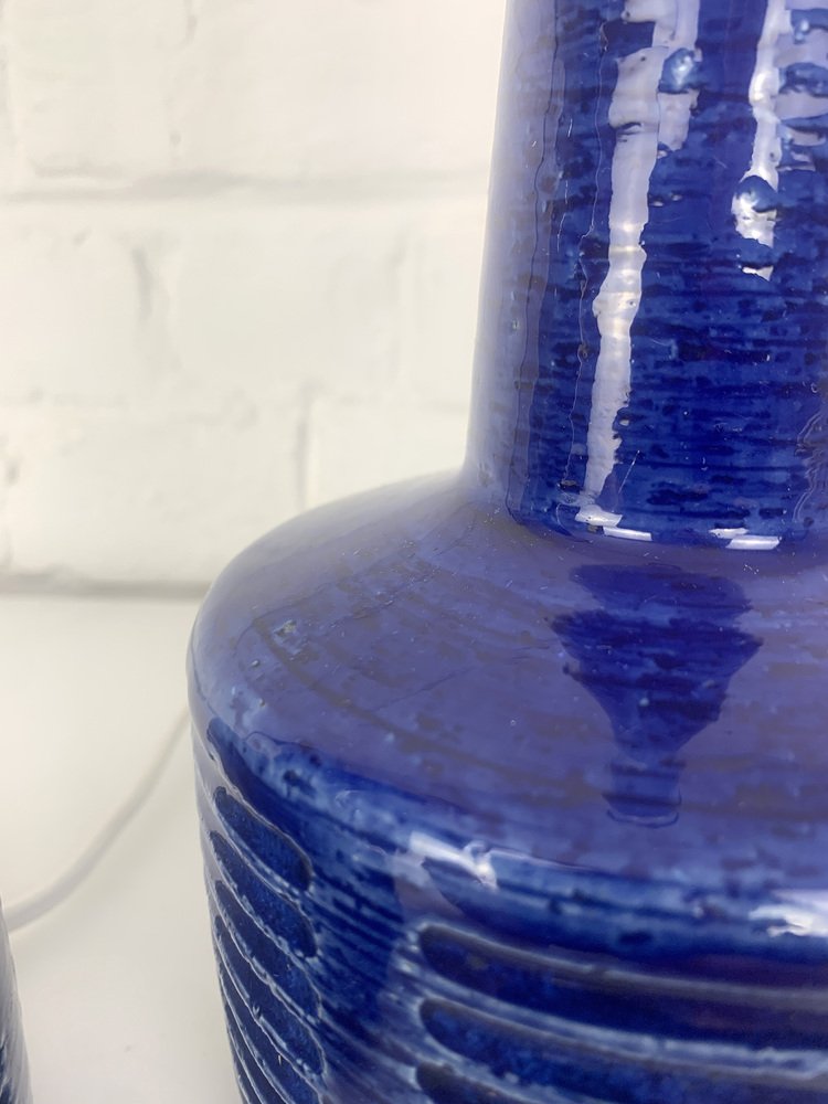 The lamp bases are finished with a blue glaze and an impressed pattern. The chamotte clay gives a natural and living surface. Both are signed under the base (PLS for Per Linnemann-Schmidt).
