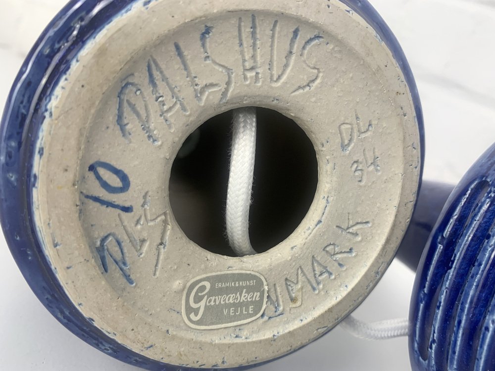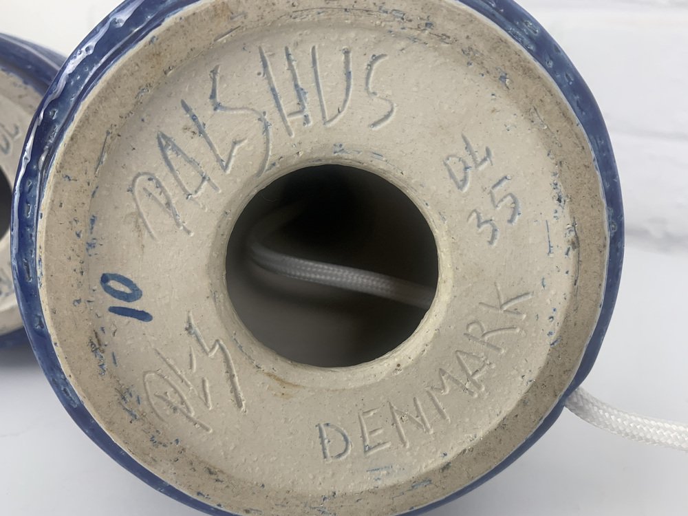 Las bases de las lámparas están acabadas con un esmalte azul y un dibujo impreso. La arcilla chamota proporciona una superficie natural y viva. Ambas están firmadas bajo la base (PLS por Per Linnemann-Schmidt).