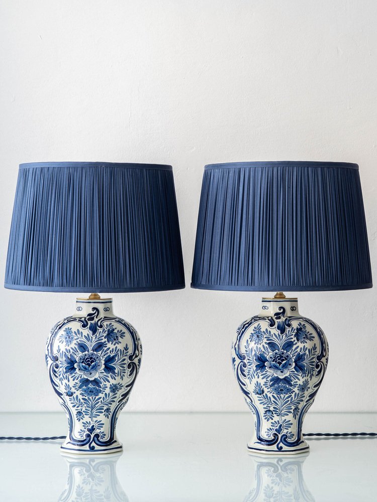 The lamps are completed with new pleated silk lampshades in a deep blue—tailored, crisp, and intentionally classic. Converted using non-invasive methods to preserve the ceramic forms; the pair is ready to place and use immediately.