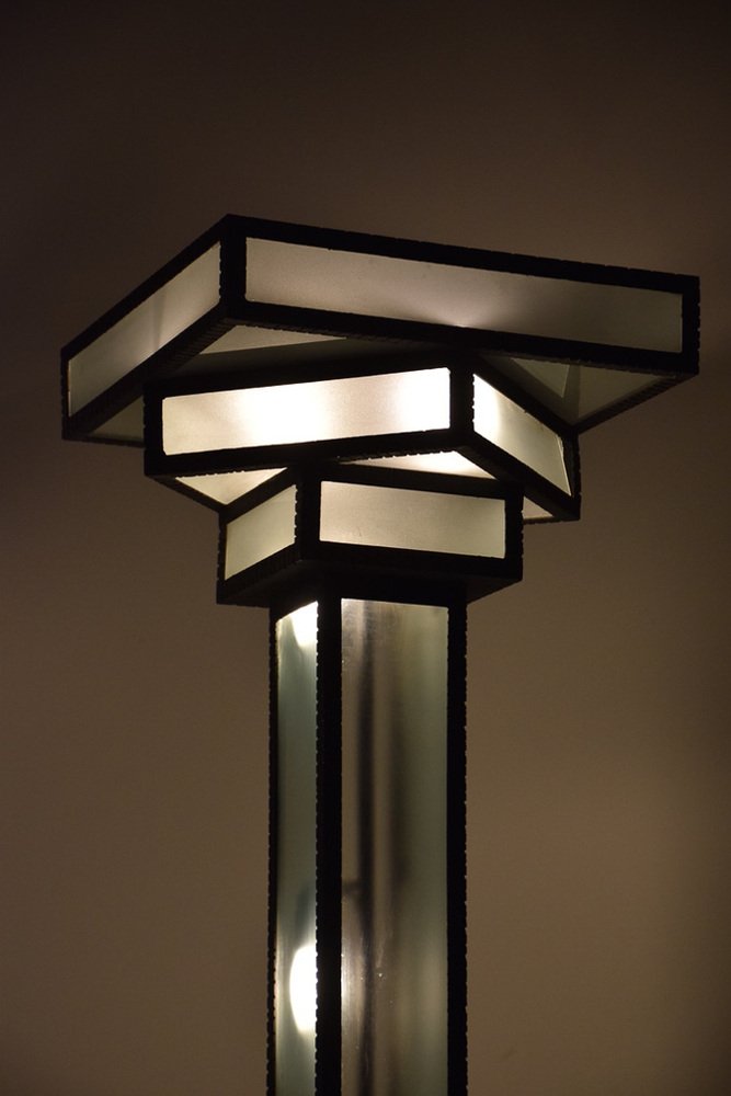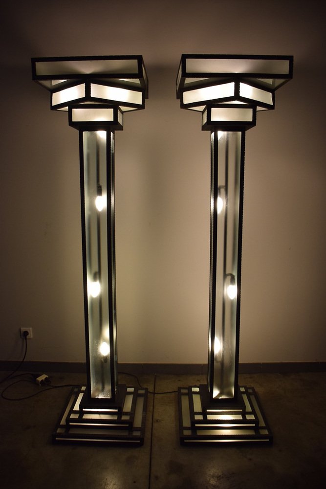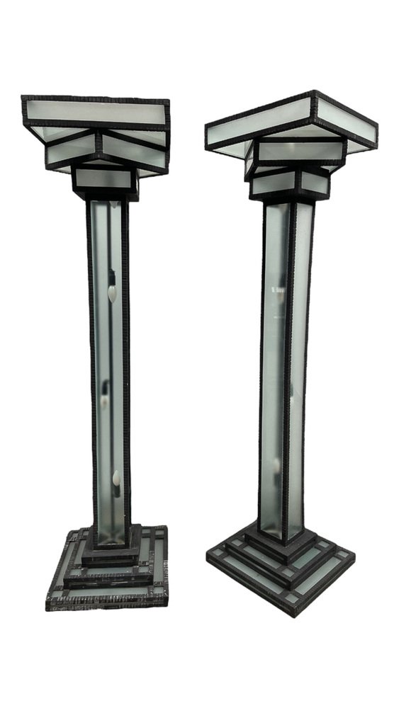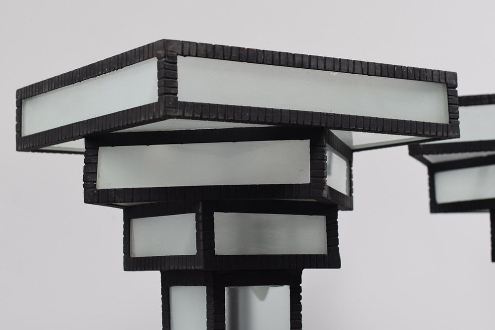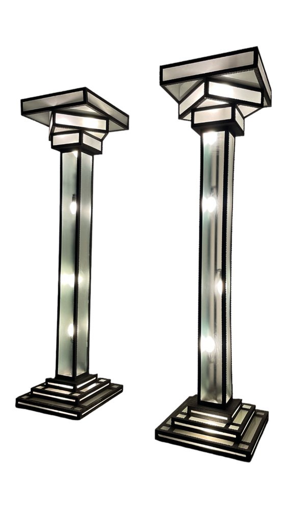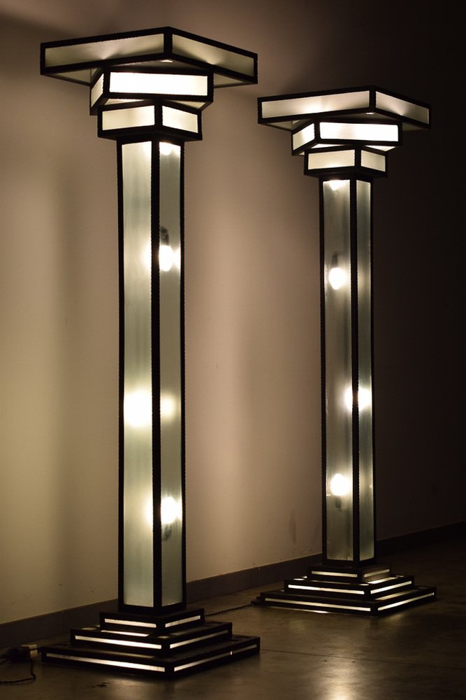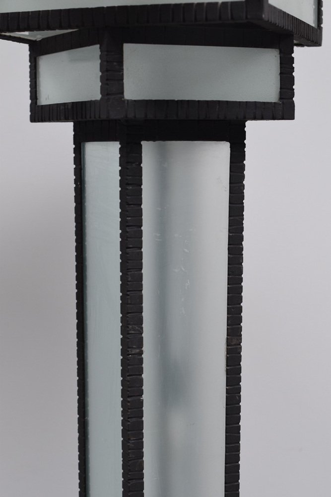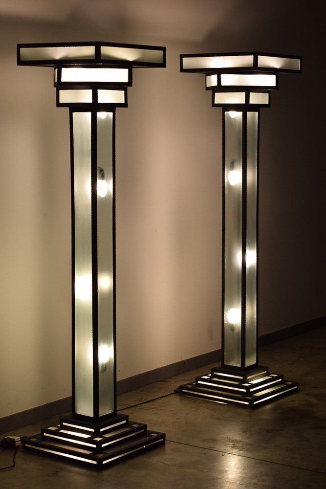 Lámparas de pie Art Déco grandes de hotel de hierro martillado y vidrio, Francia, años 30. Juego de 2