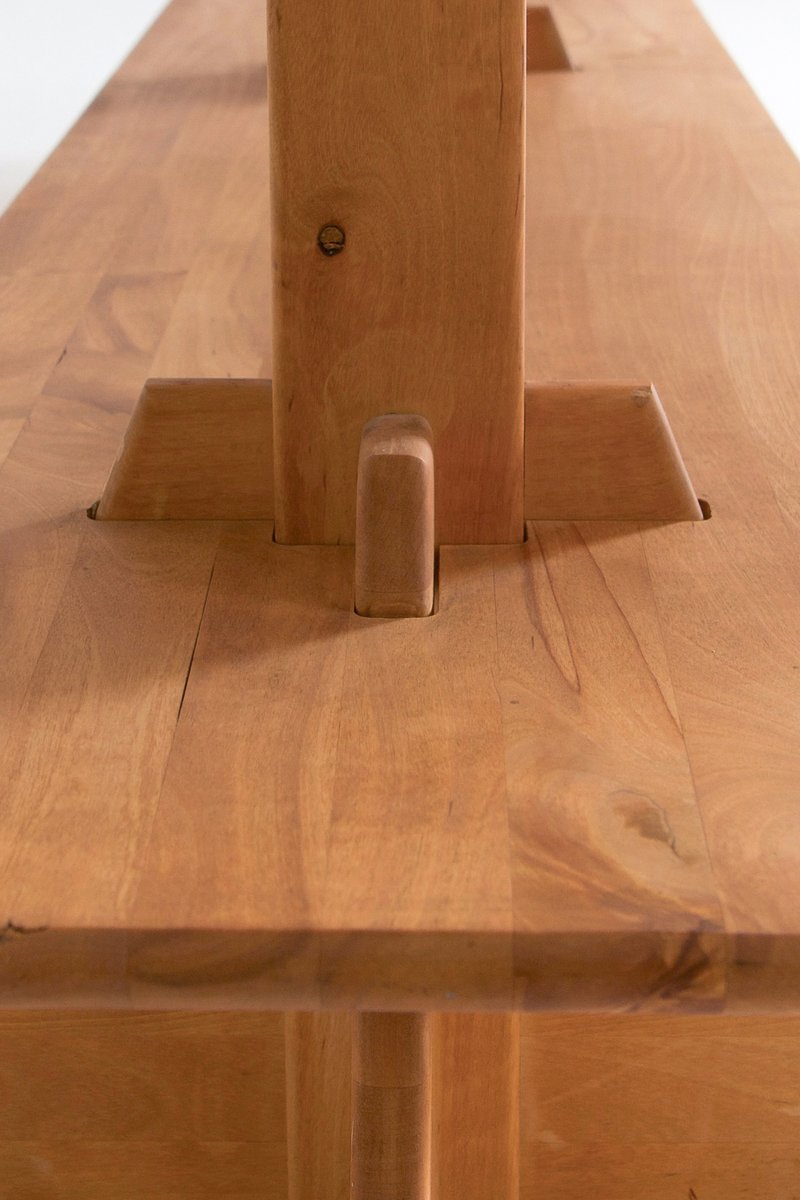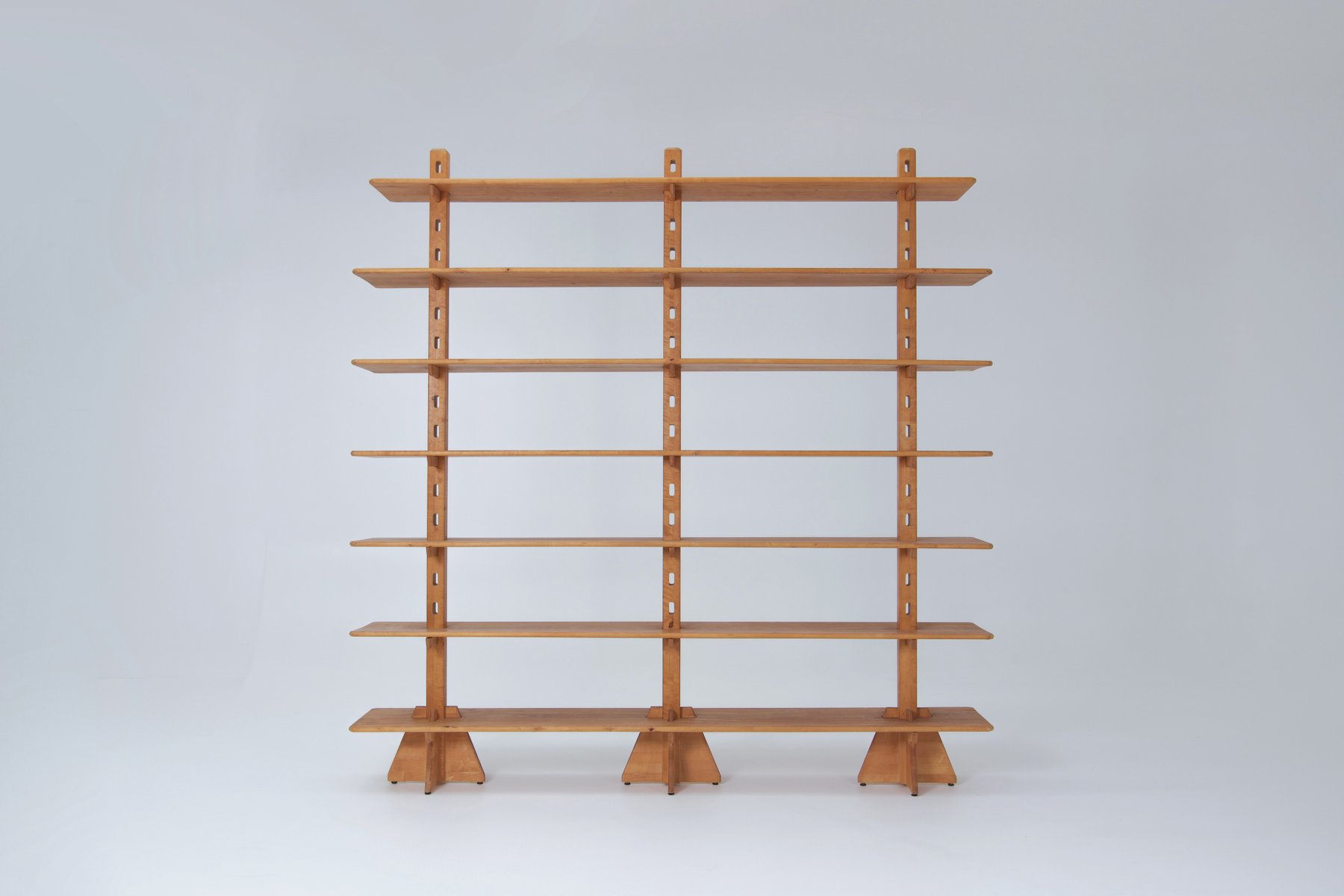The bookshelf is made from elm wood. It consists of 7 shelves, held together by 3 pillars. By repositioning the connectors underneath the shelves, their height can be modified.