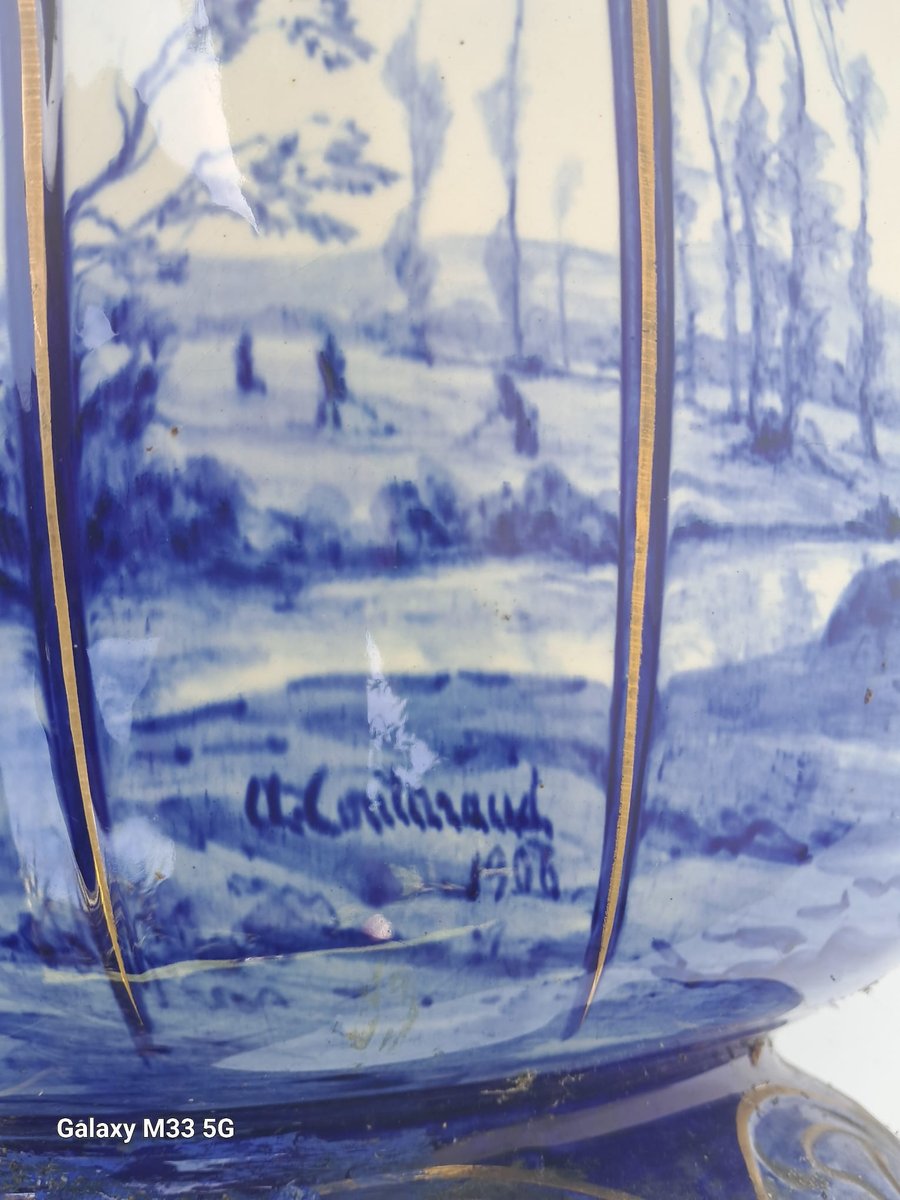 Preciosa vasija de cerámica azul y blanca fechada en 1906 y firmada por A. Couturaud.