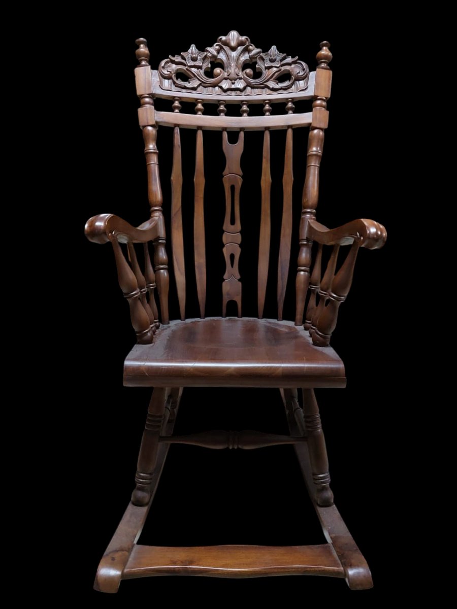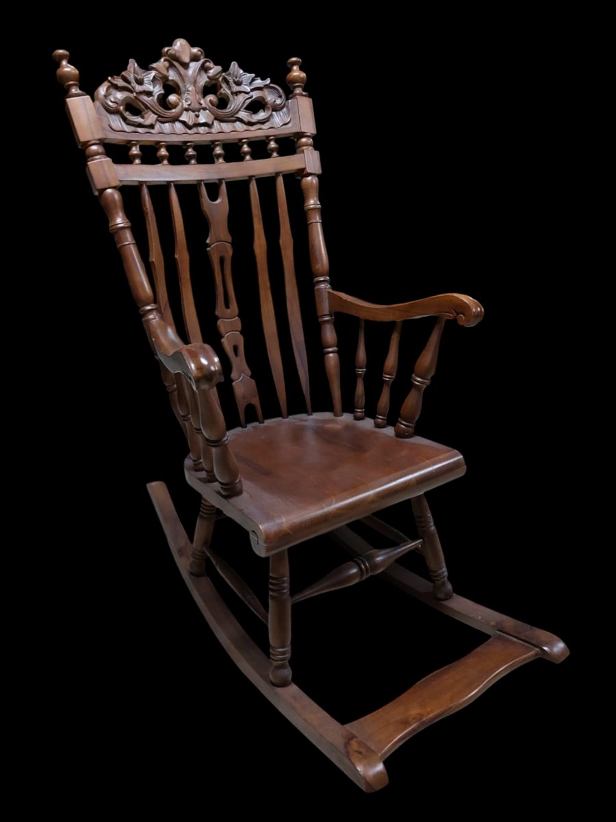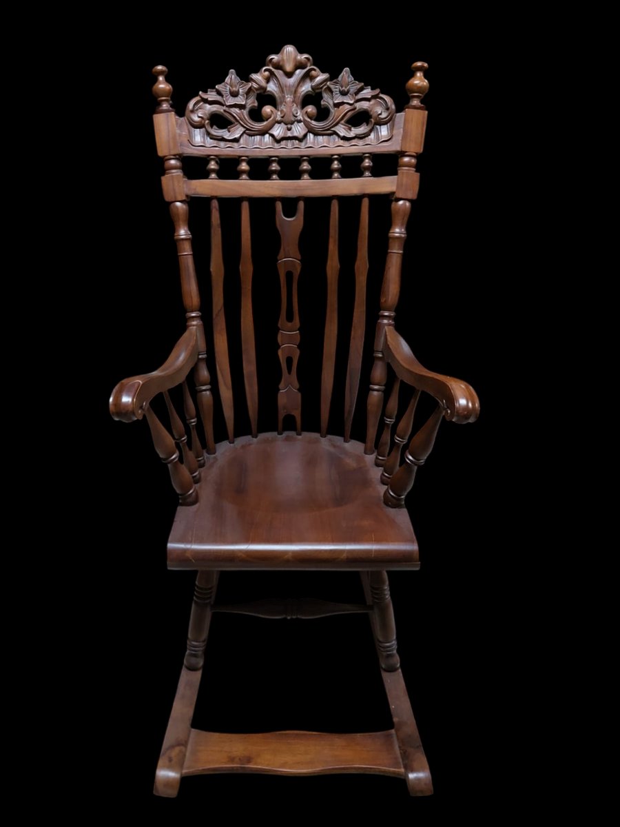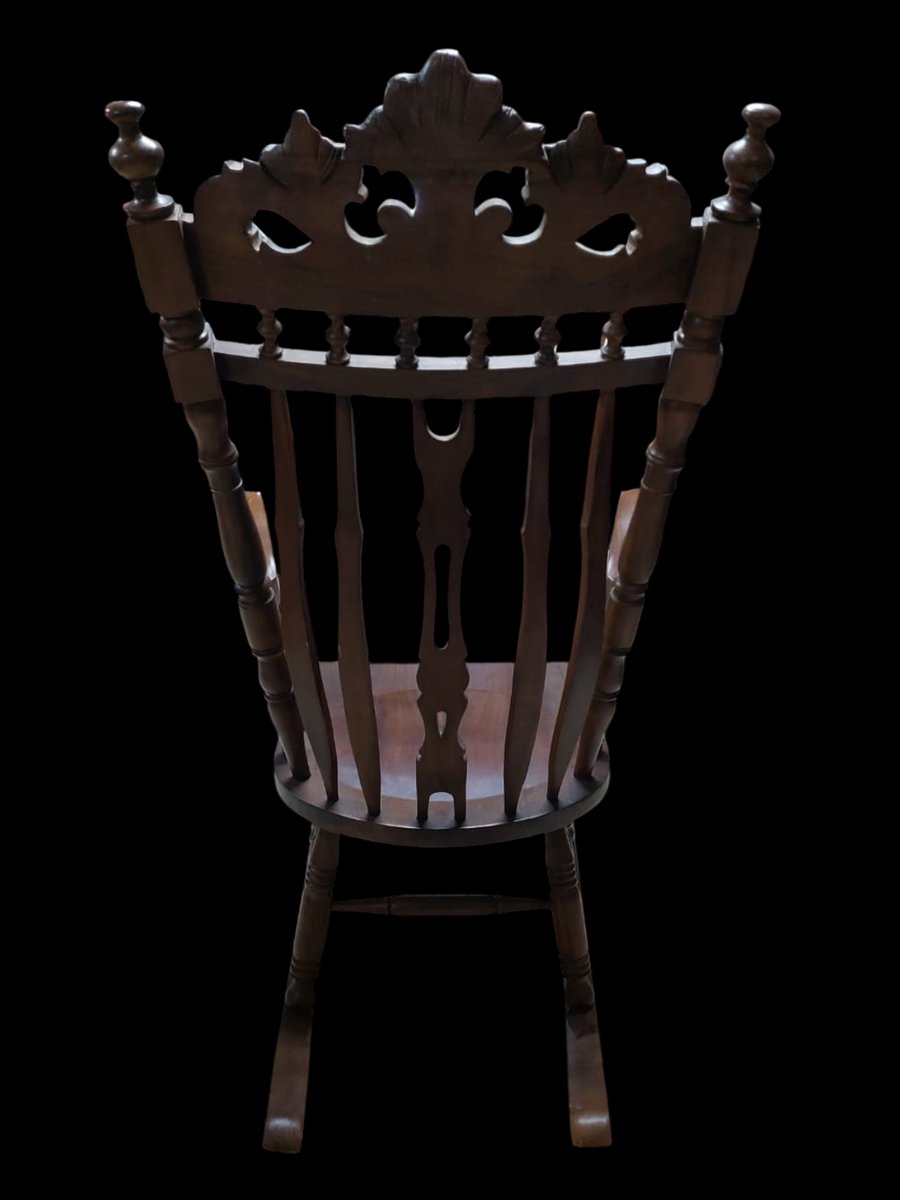 El respaldo: Presenta una estructura de varillas torneadas con un elemento central contorneado que garantiza la comodidad y el apoyo, típico de las sillas de alta gama de la época. Los reposabrazos: Anchos y contorneados con extremos rizados, sostenidos por columnas torneadas que combinan con el motivo de la base. El armazón mecedora: Las largas guías curvas están conectadas por travesaños reforzados con elementos torneados en forma de «bulbo», lo que garantiza un movimiento suave y una estabilidad impecable.
