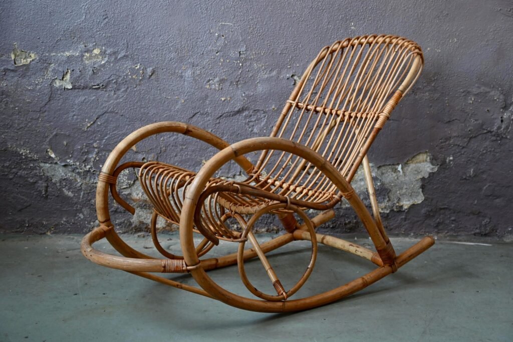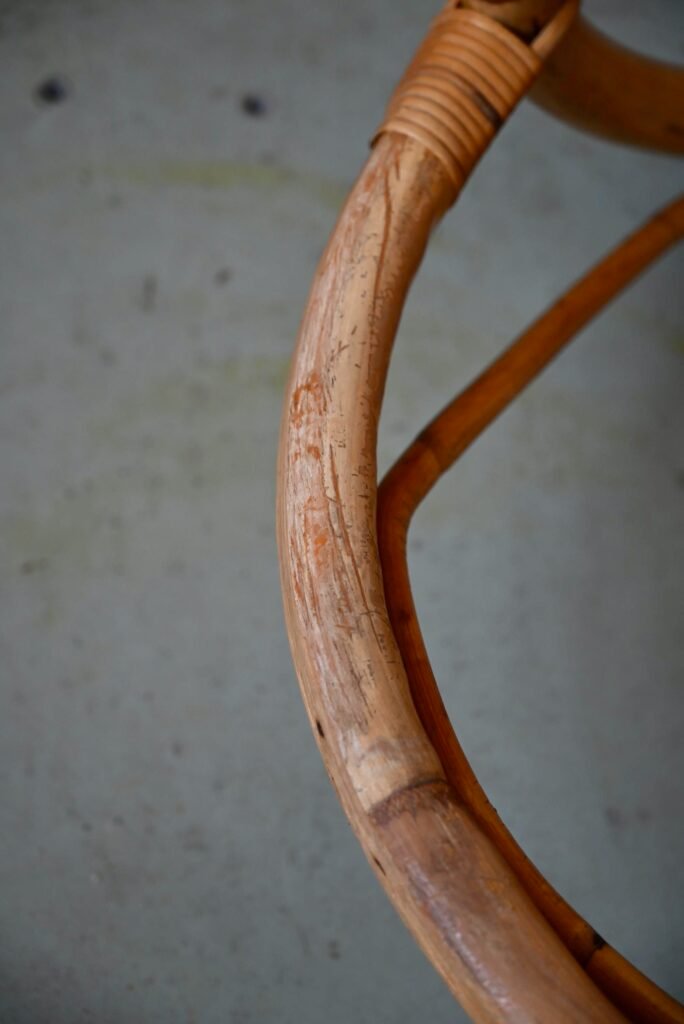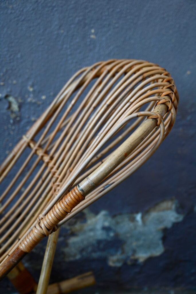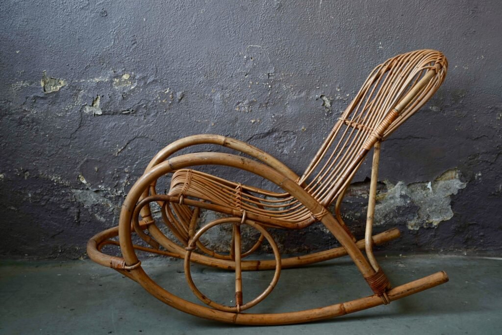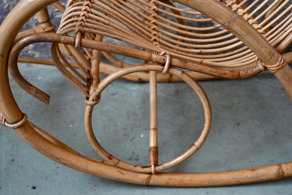 The rattan rocking chair dates from the 60s and is in very good condition. The tilt is perfect. We are fans of the rattan work on the base and the return of the strands forming a “cushion” at the top of the backrest.