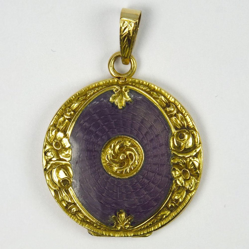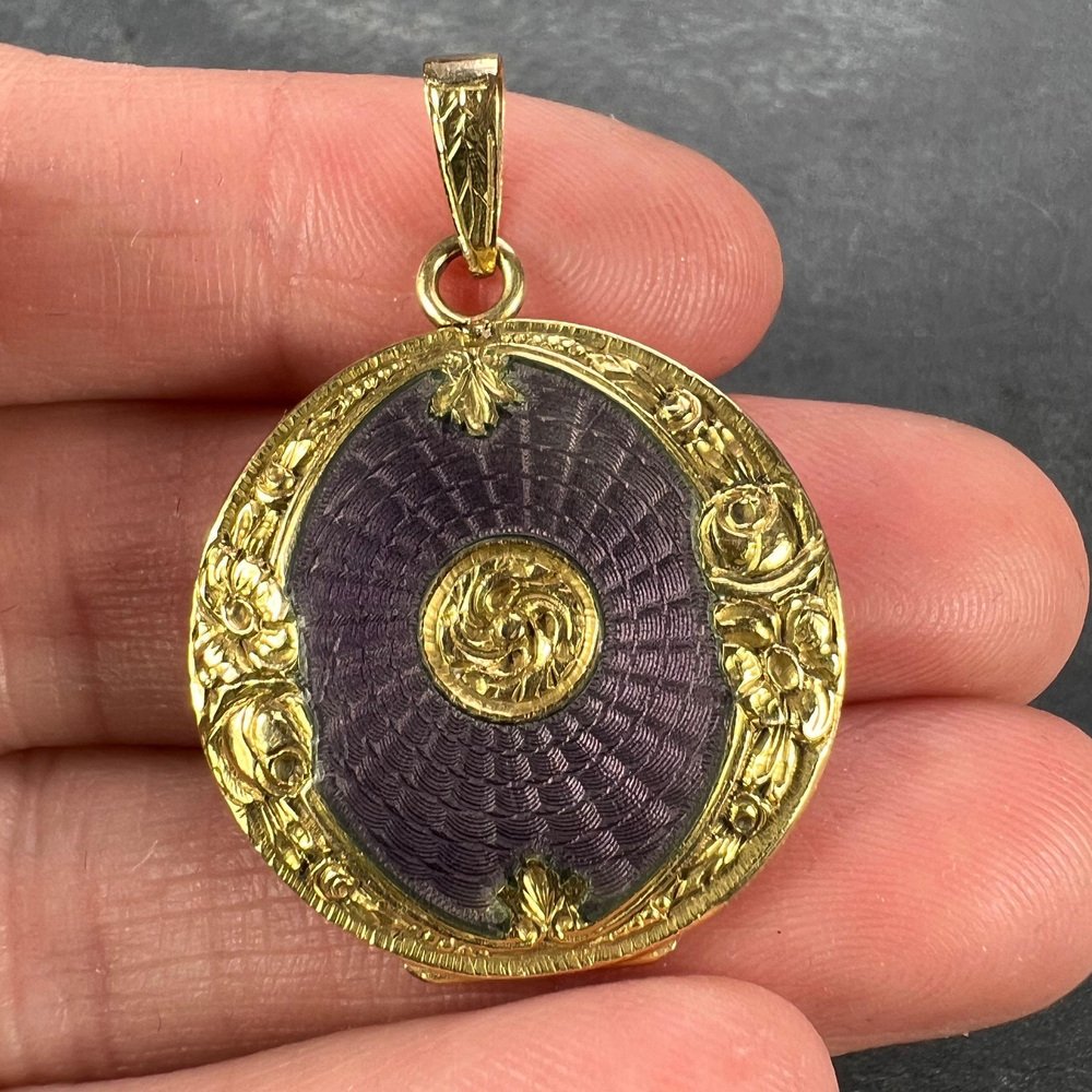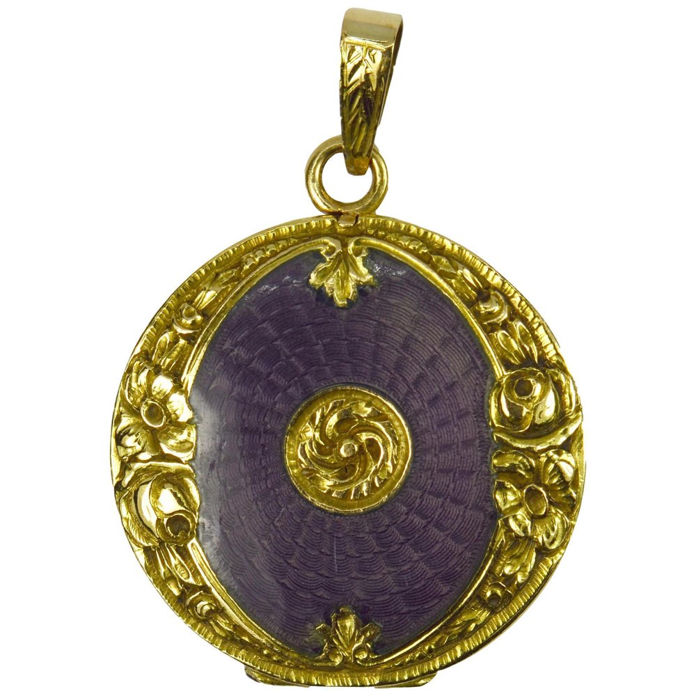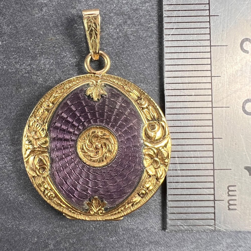 Medallón colgante de oro amarillo de 18 k esmaltado morado, década de 1890