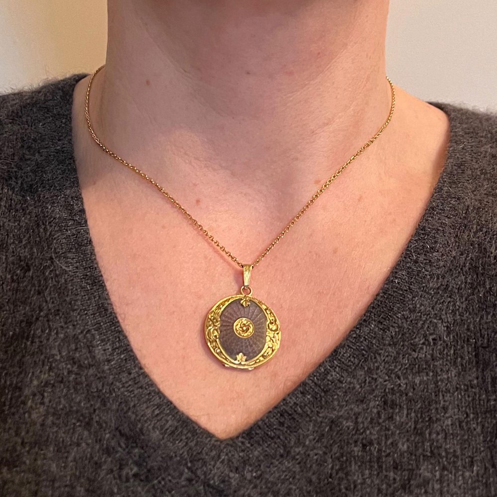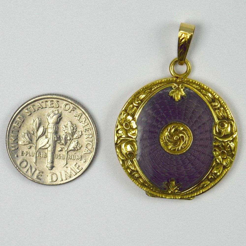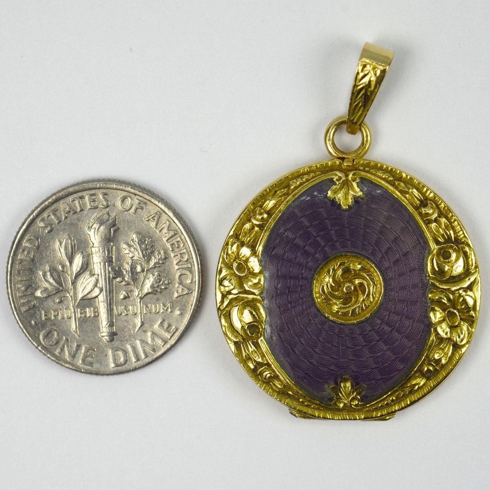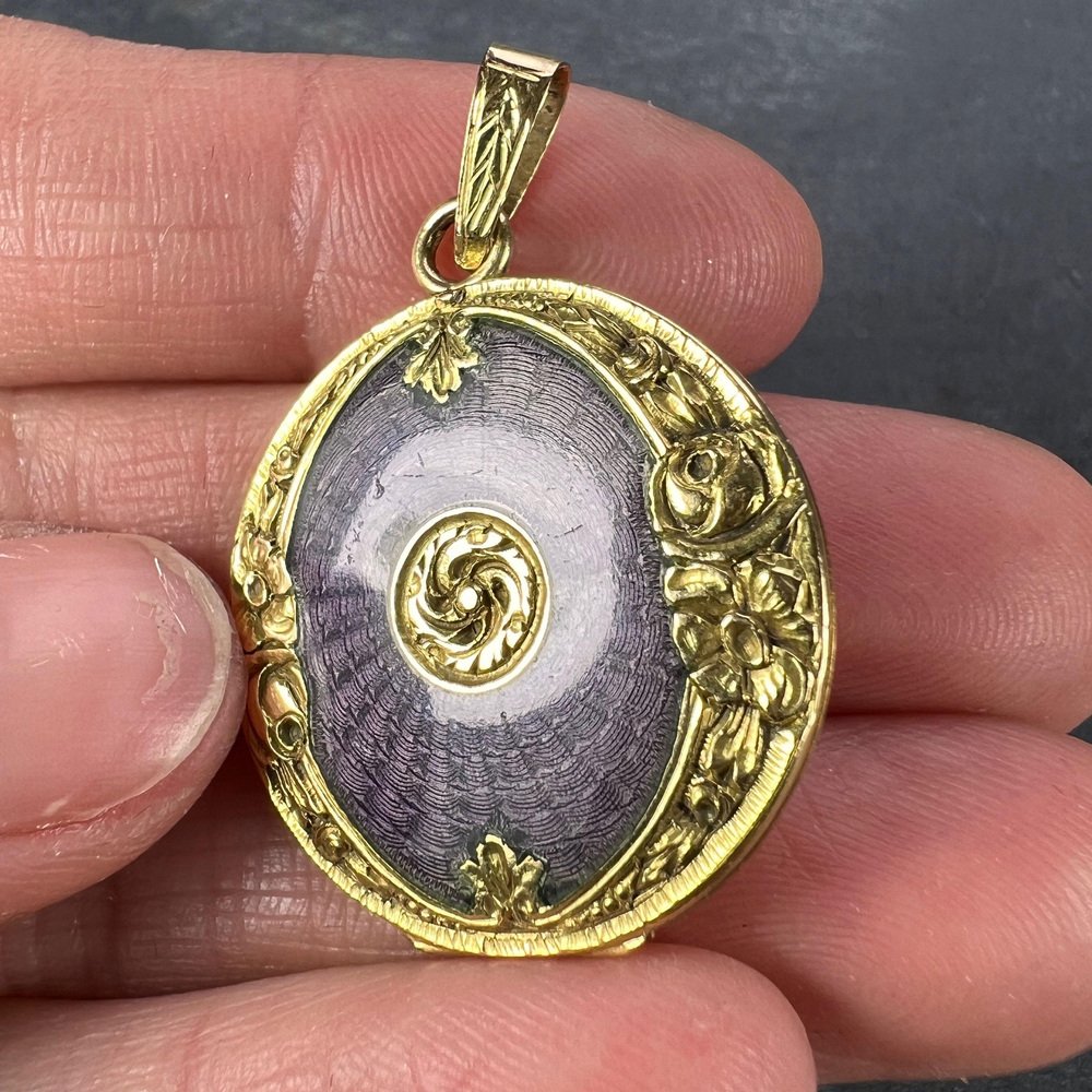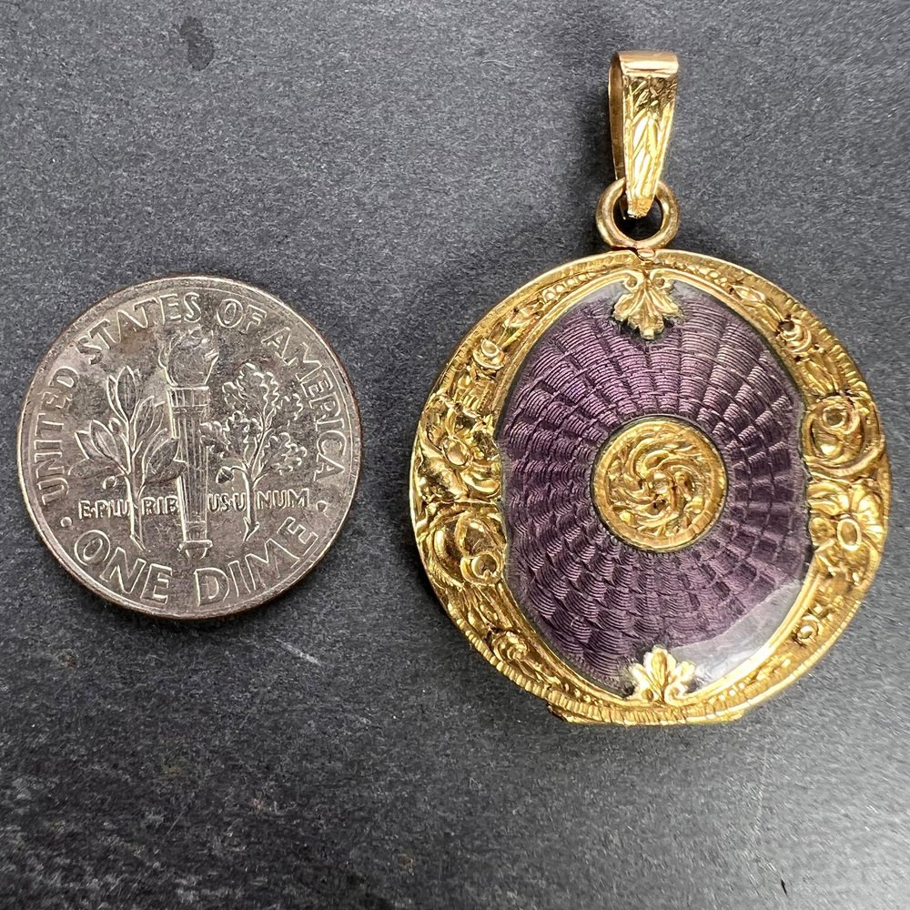 Medallón colgante de oro amarillo de 18 k esmaltado morado, década de 1890