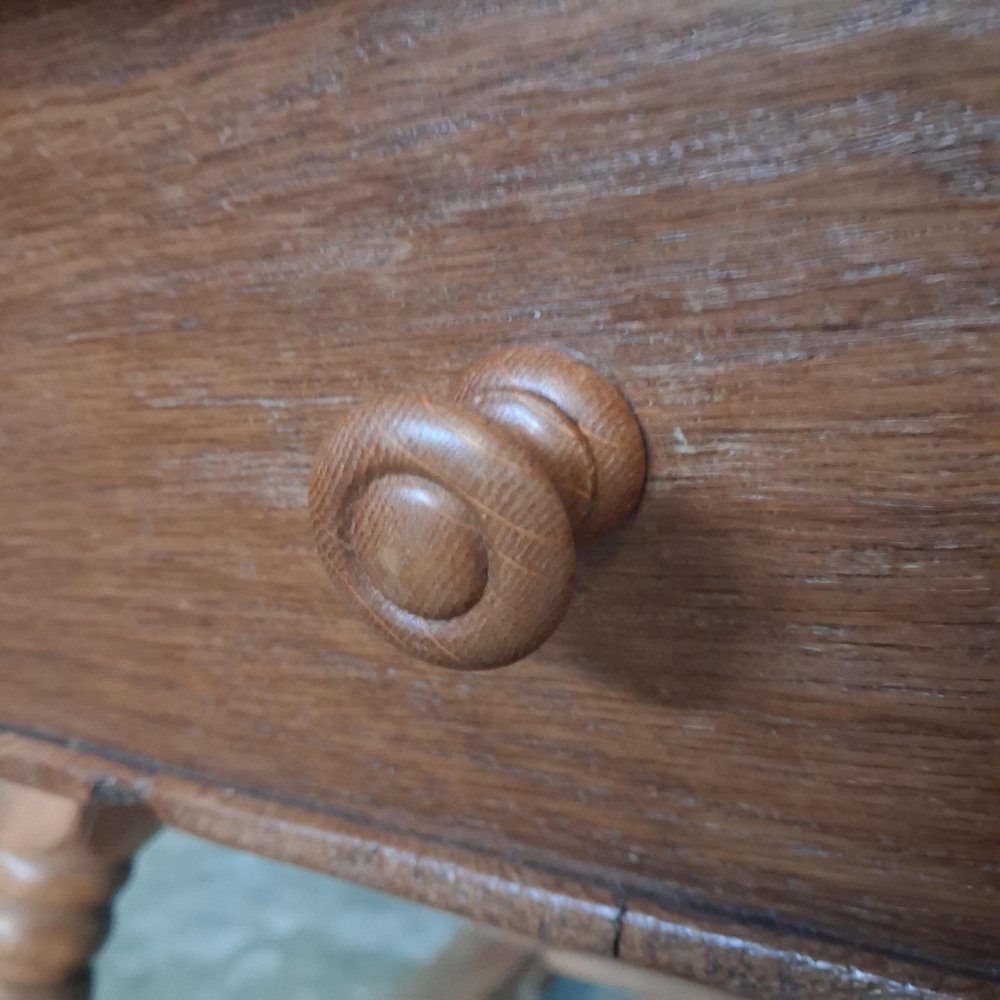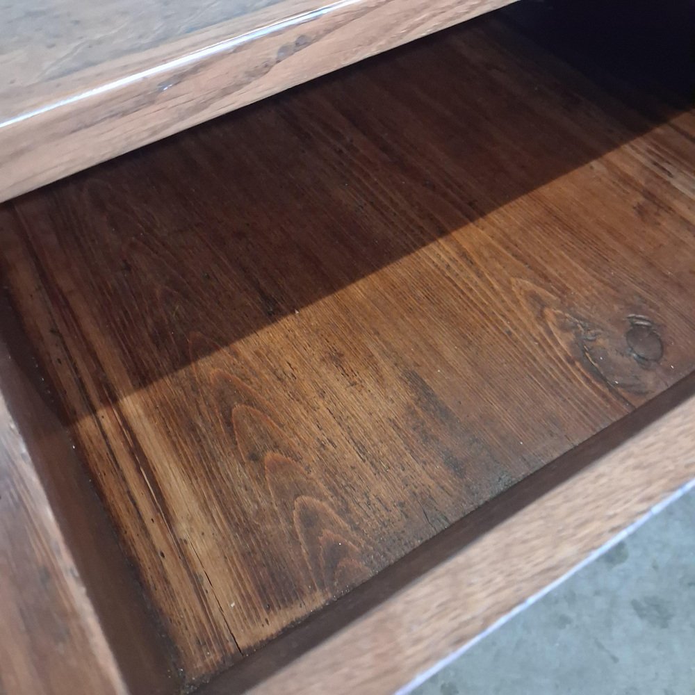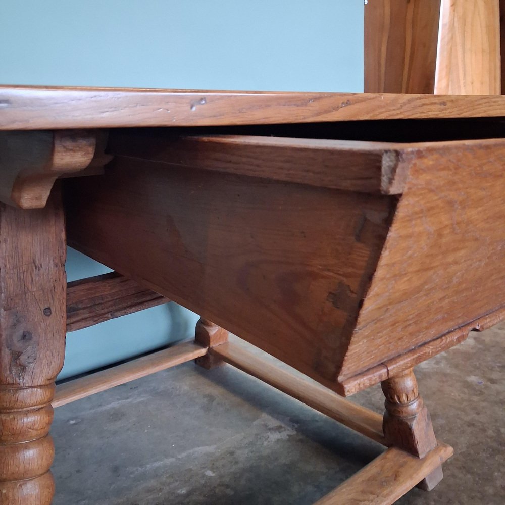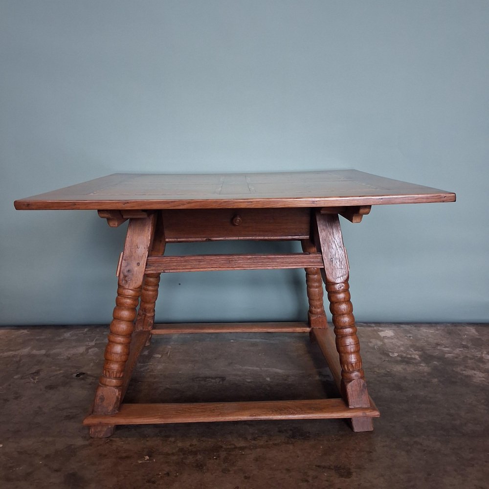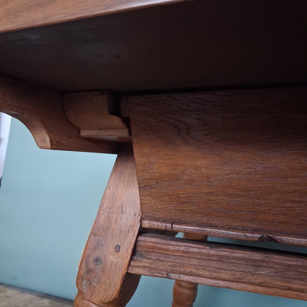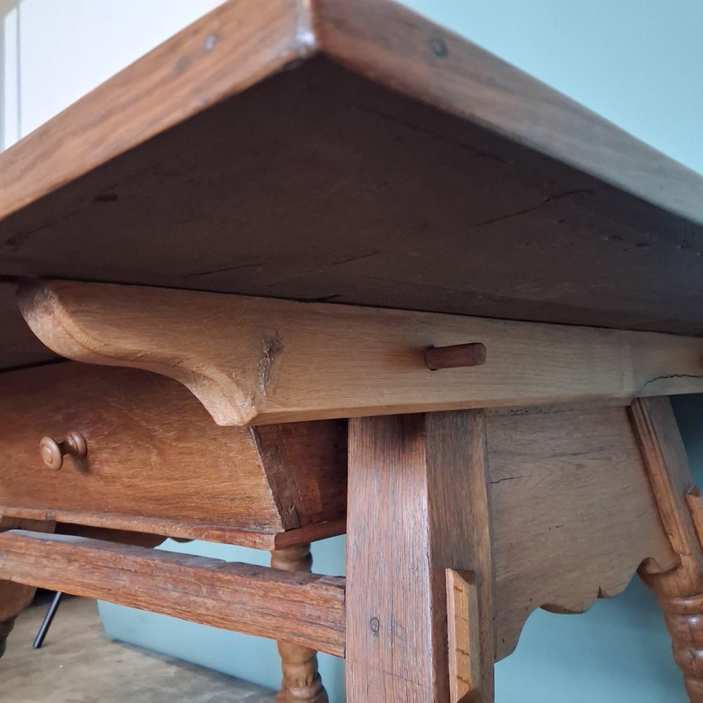 Sostenida por patas torneadas y un marco sólido, la mesa es estable y adecuada para el uso diario. Detalles Época: finales del siglo XVIII / principios del XIX Origen: Europa Central Material: roble macizo Incrustaciones: arce y nogal Cajón: doble cara, cajón completo Estado: buen estado antiguo con desgaste debido a la edad Construcción: estable y funcional