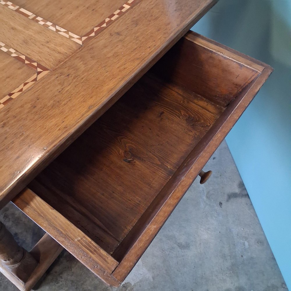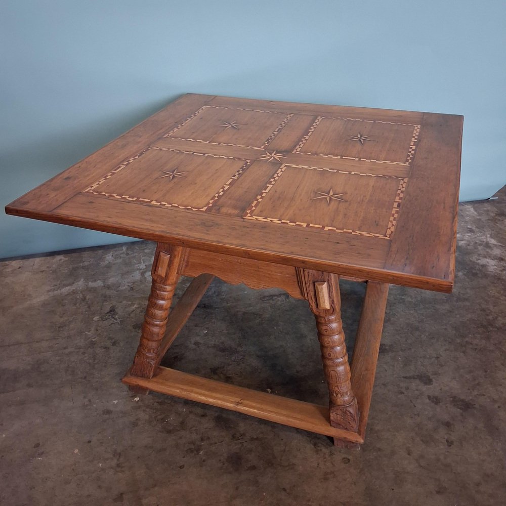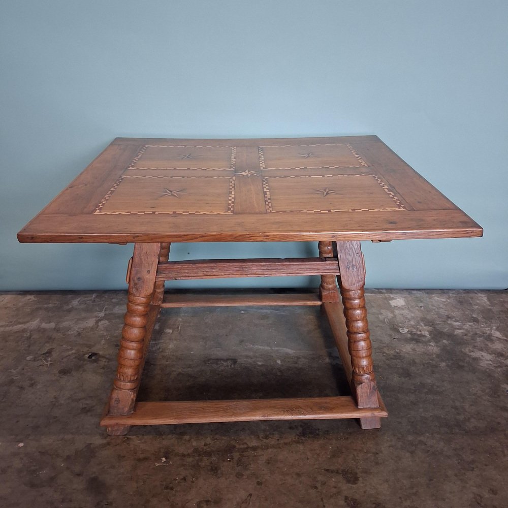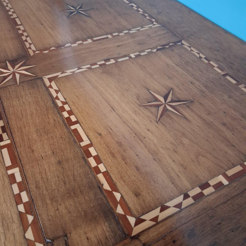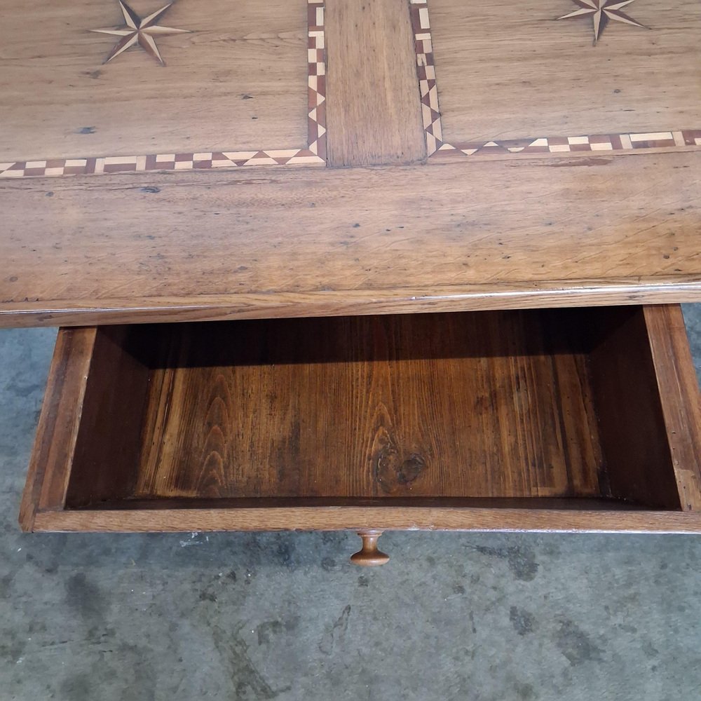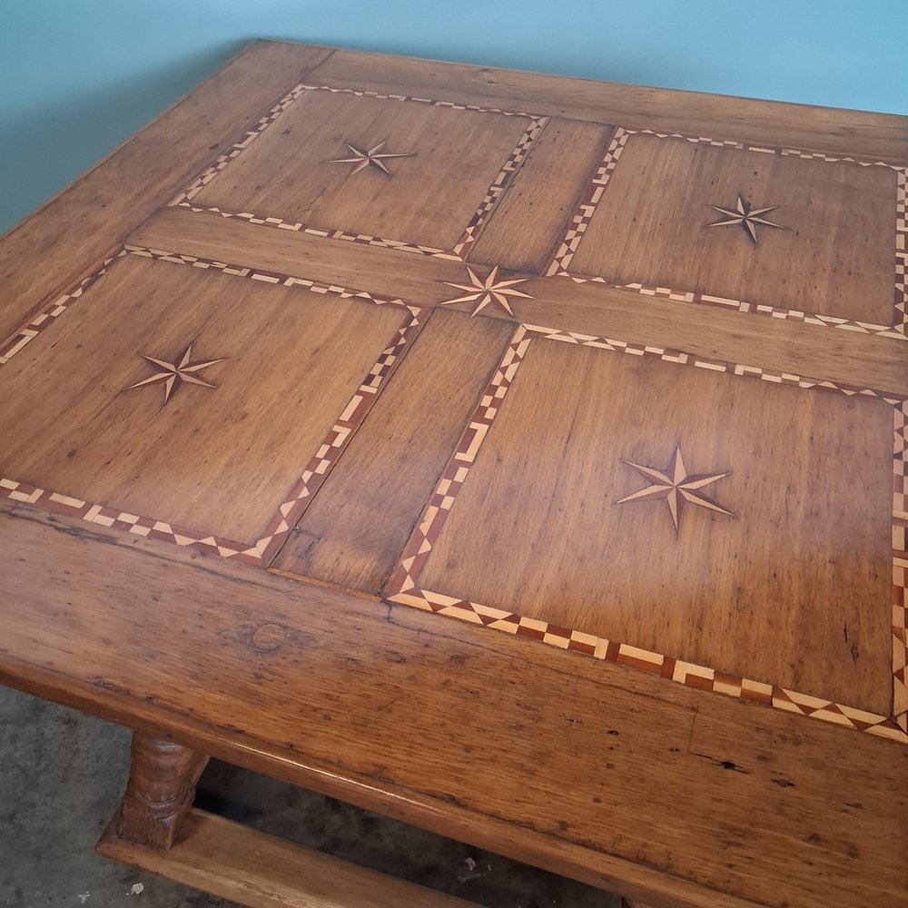 Esta mesa antigua data de finales del siglo XVIII y principios del XIX y está fabricada en roble macizo. El tablero está decorado con incrustaciones de estrellas y bandas geométricas finamente ejecutadas, lo que crea una estructura visual sólida y elegante.