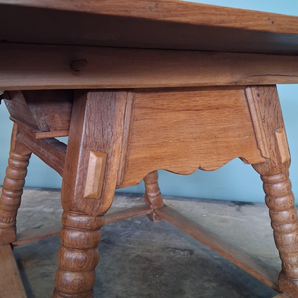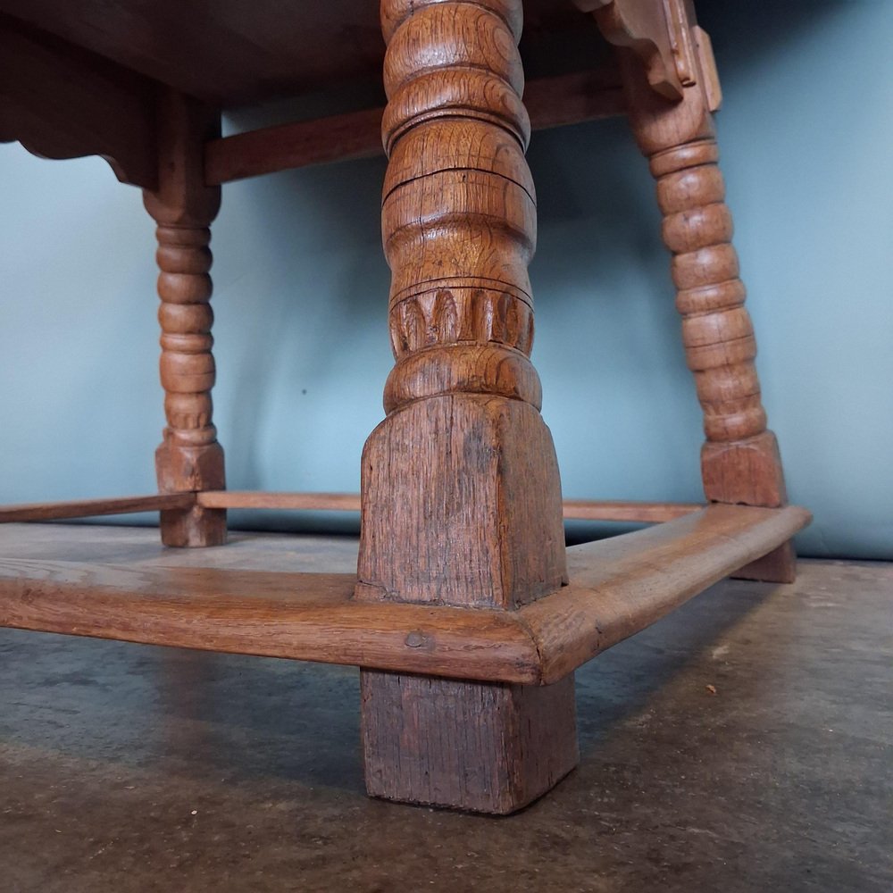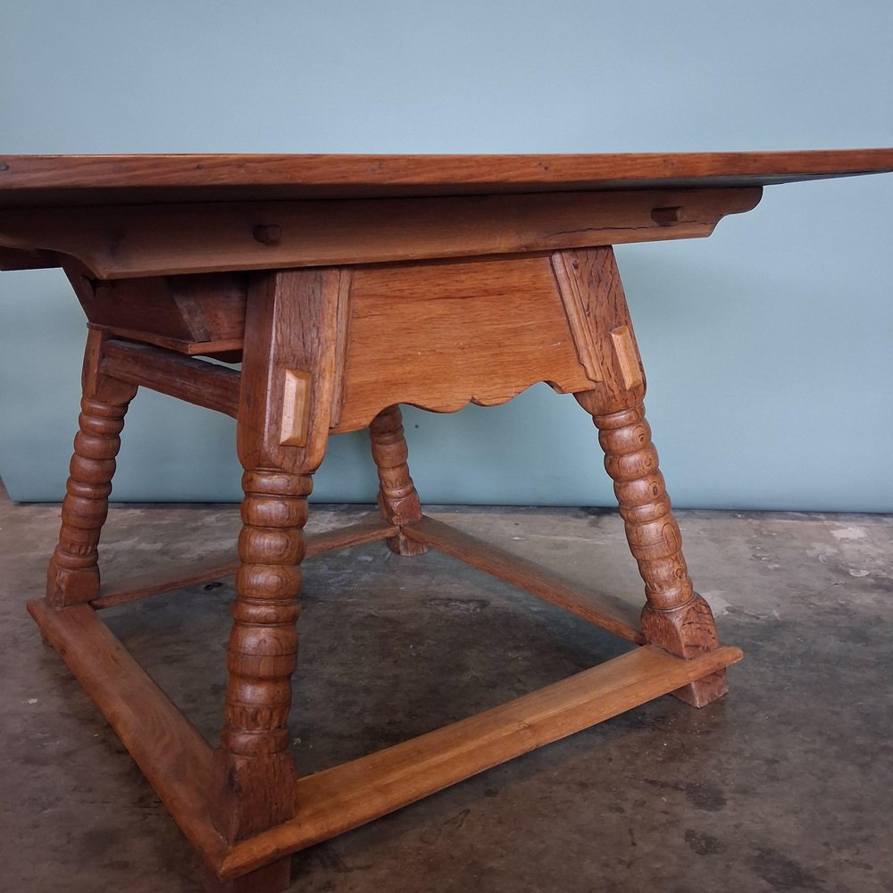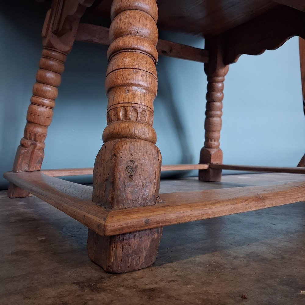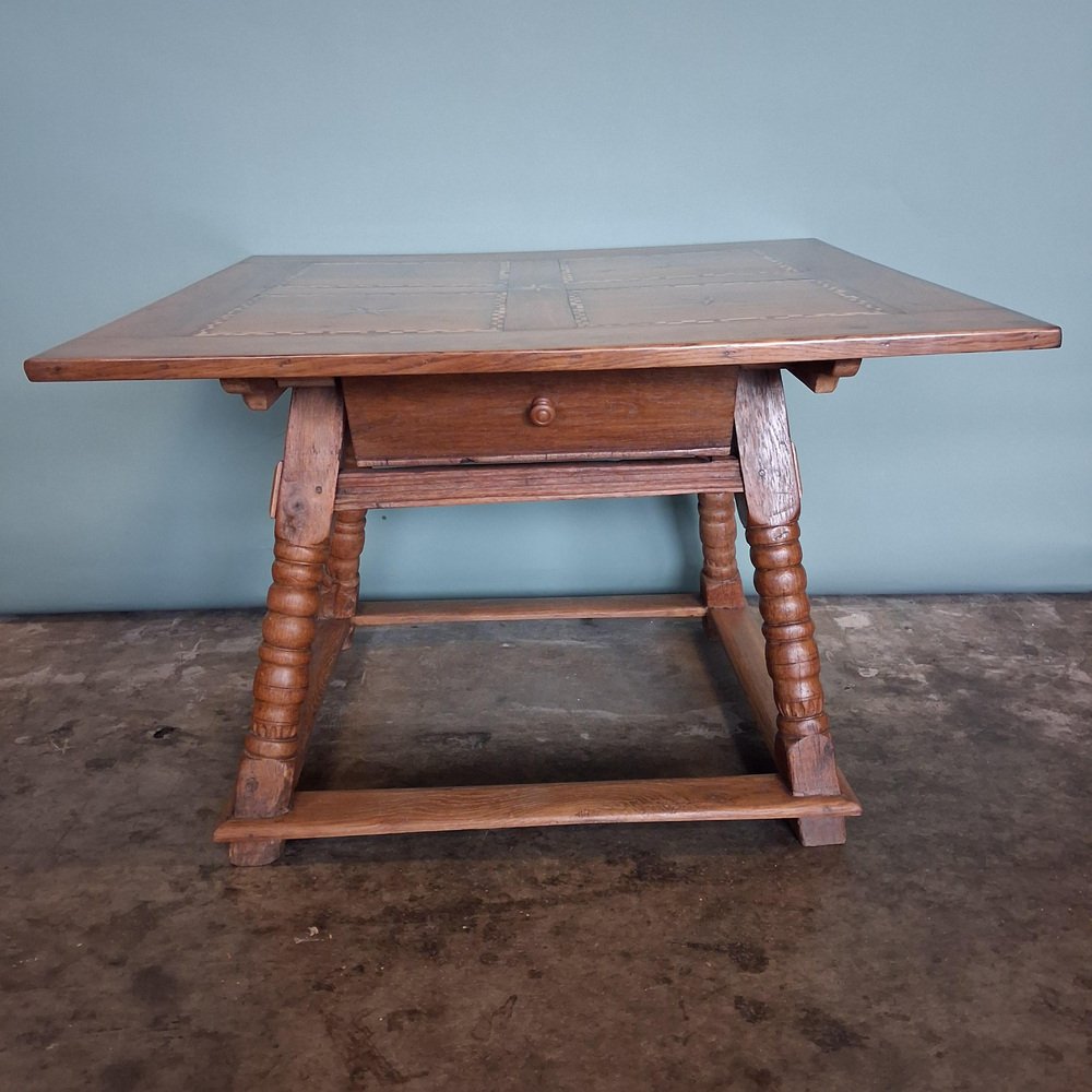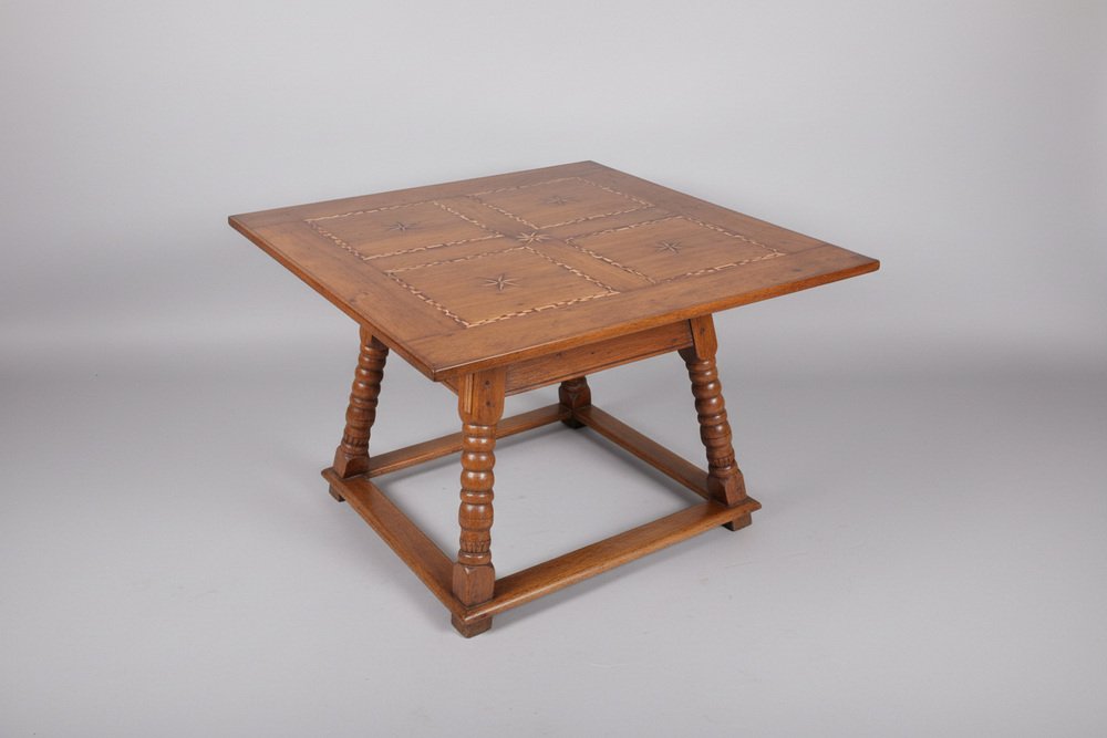 Esta mesa antigua data de finales del siglo XVIII y principios del XIX y está fabricada en roble macizo. El tablero está decorado con incrustaciones de estrellas y bandas geométricas finamente ejecutadas, lo que crea una estructura visual sólida y elegante.