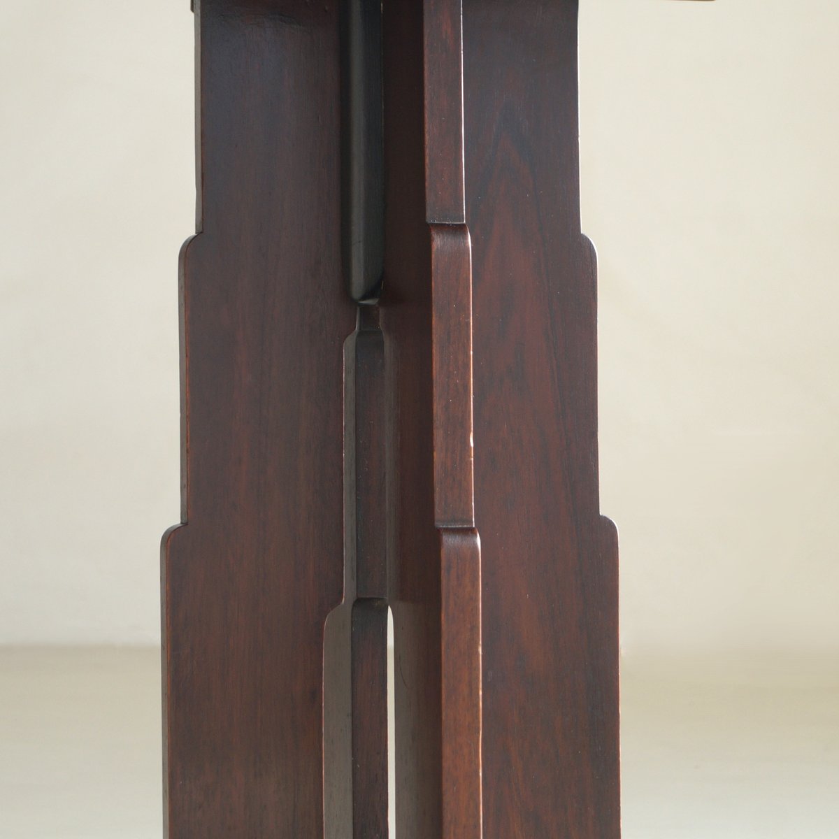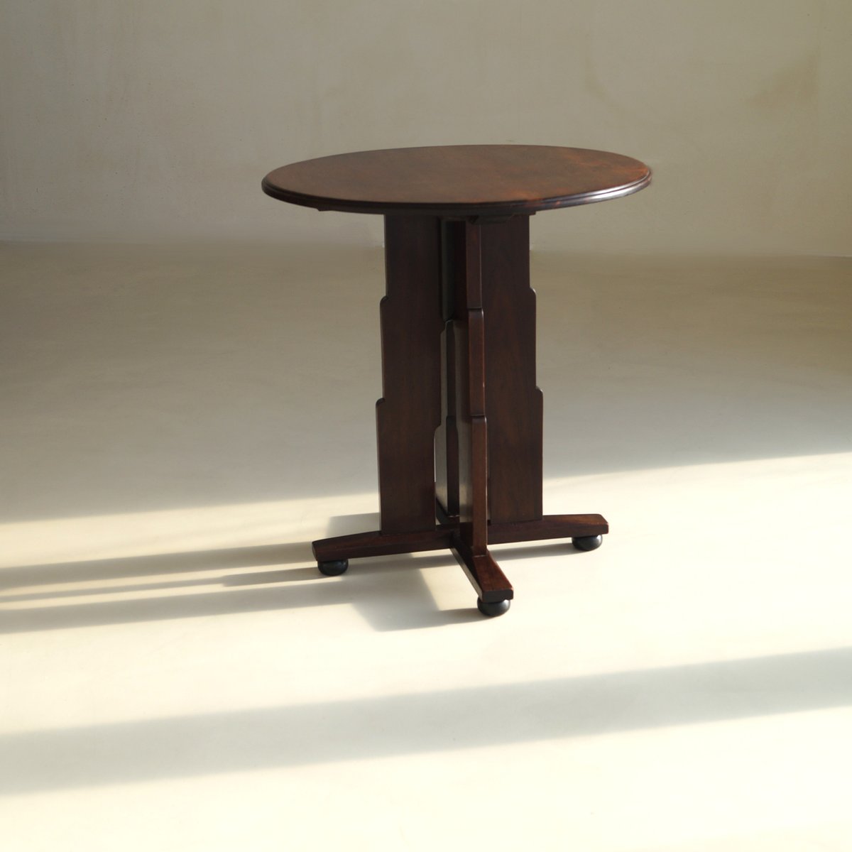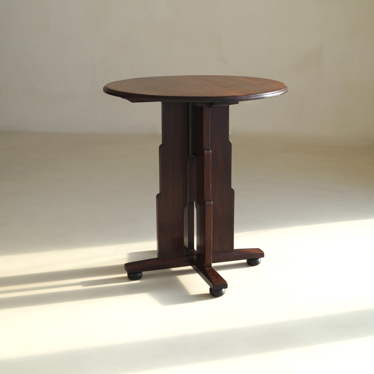 Excepcional y rara mesa auxiliar escultural de la Escuela de Ámsterdam, realizada en caoba maciza y que data de principios de la década de 1920. Esta pieza es un ejemplo llamativo del lenguaje arquitectónico del mobiliario que define el movimiento de la Escuela de Ámsterdam, donde la masa, el ritmo y la artesanía convergen en una forma expresiva.