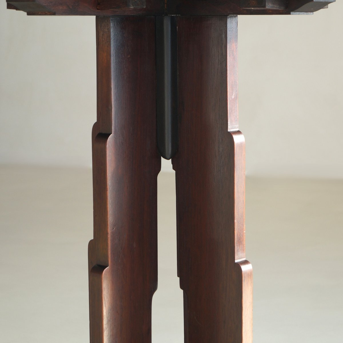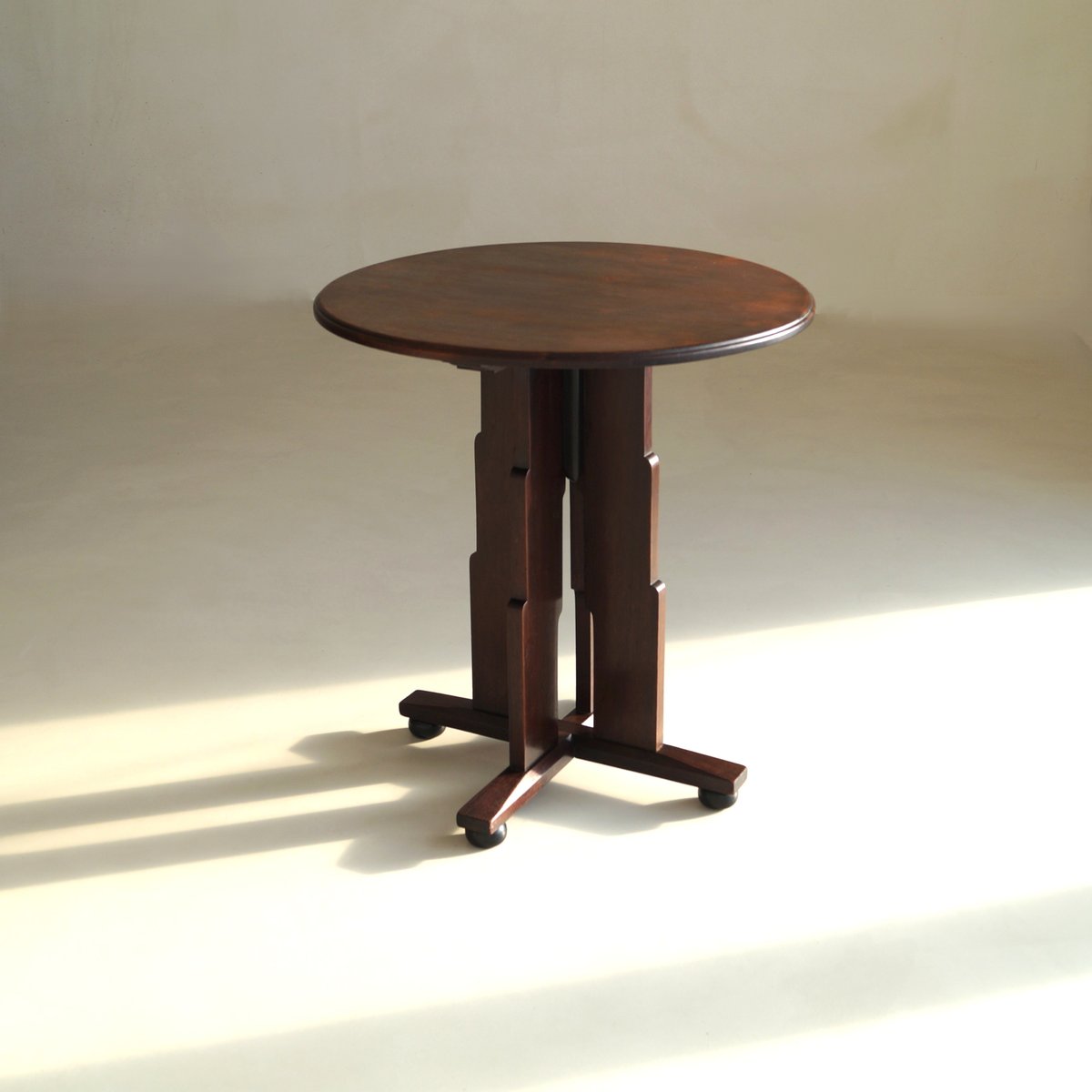 The table features a round, slightly beveled top resting on a powerful architectural base composed of four vertical, stepped supports. These uprights are rhythmically notched, creating a dynamic interplay of light and shadow that strongly recalls Amsterdam School brick façades and bridge architecture. The supports are joined by a cross-shaped stretcher, providing both visual tension and excellent structural stability.