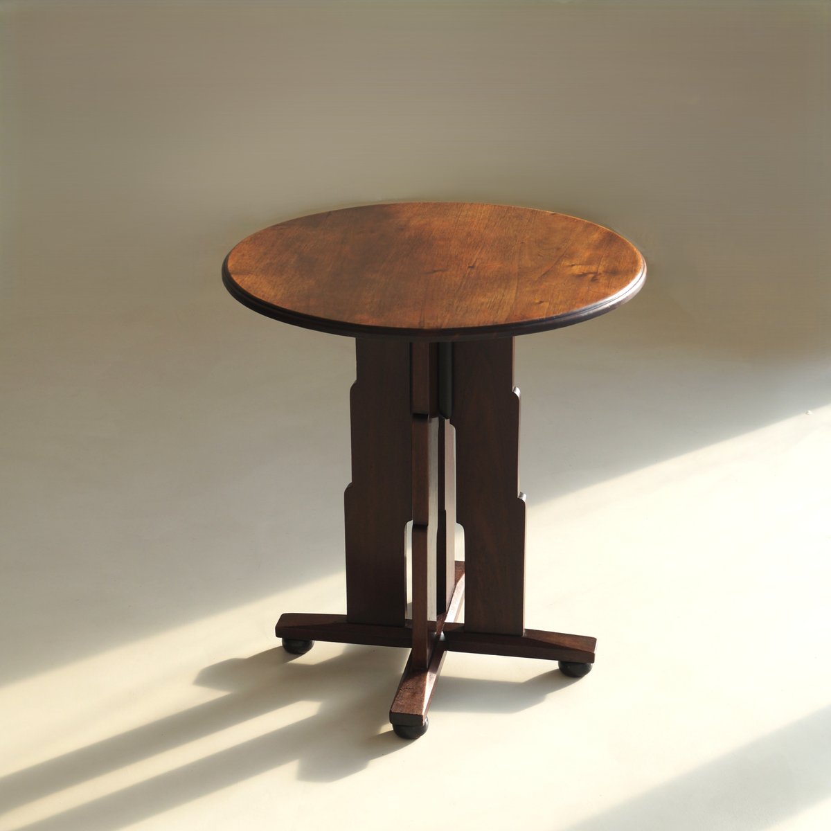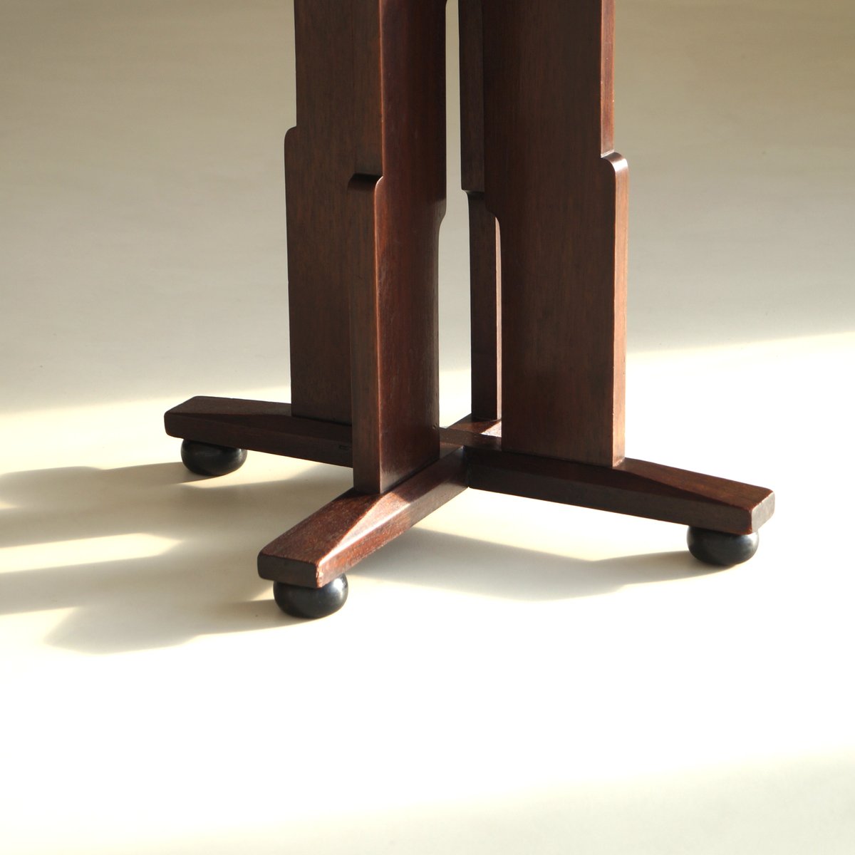 La mesa presenta un tablero redondo, ligeramente biselado, que descansa sobre una potente base arquitectónica compuesta por cuatro soportes verticales escalonados. Estos montantes están rítmicamente entallados, creando un dinámico juego de luces y sombras que recuerda fuertemente a las fachadas de ladrillo y la arquitectura de los puentes de la Escuela de Ámsterdam. Los soportes están unidos por un travesaño en forma de cruz, que proporciona tanto tensión visual como una excelente estabilidad estructural.