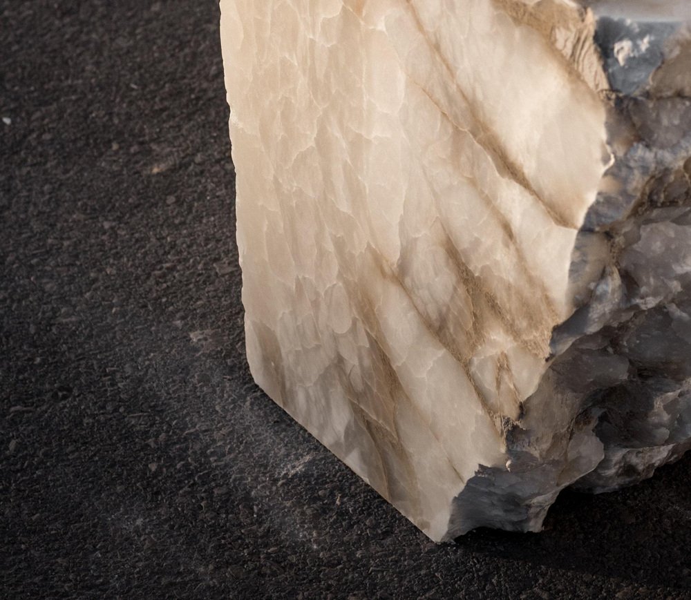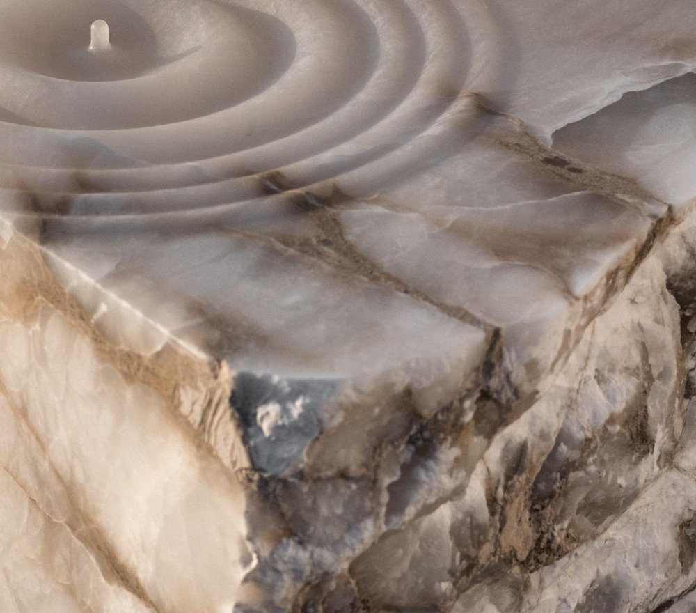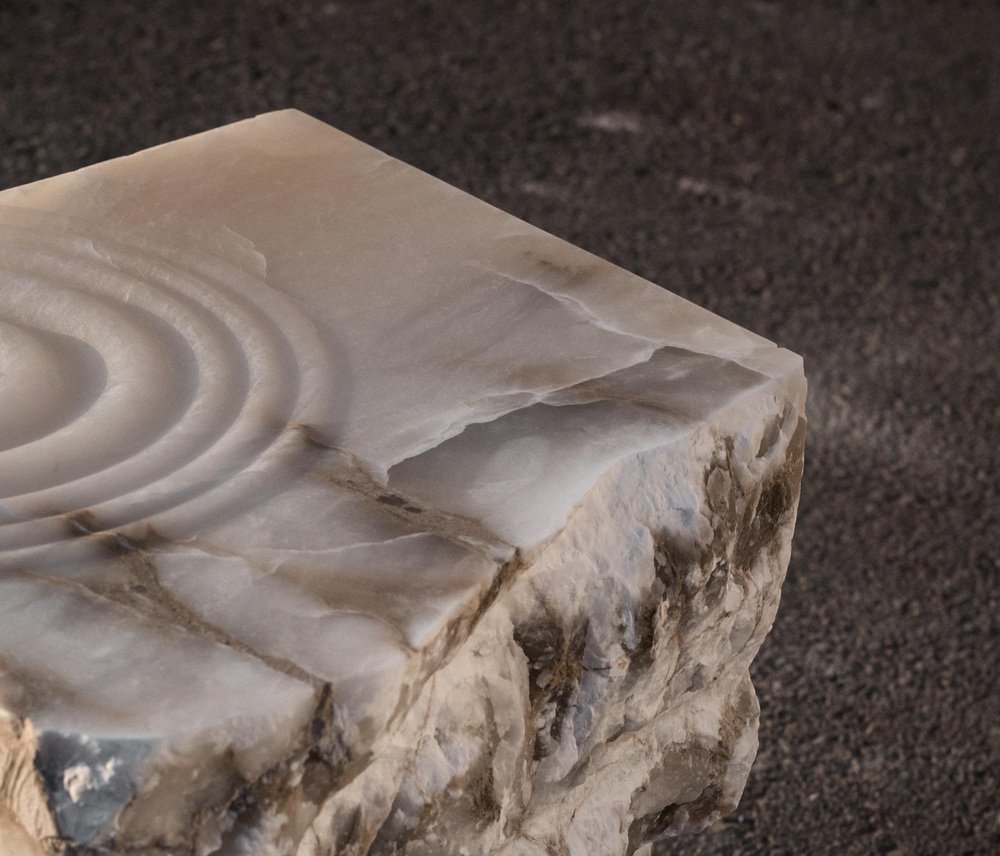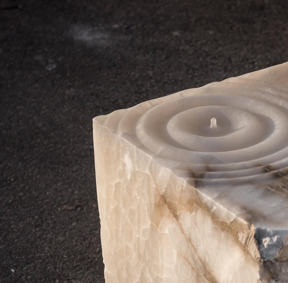 Mesa auxiliar Aqua Fossil Drop Sculpture en alabastro de Amarist Studio Pieza única Dimensiones: 50 cm de profundidad x 50 cm de ancho x 55 cm de altura. Materiales: alabastro. La mesa auxiliar Aqua Fossil de Amarist Studio está tallada en un único bloque de alabastro, moldeado para petrificar el movimiento natural del agua en una gota escultórica. La superficie de la pieza captura un momento suspendido, en el que la fluidez se congela y se transforma en materia. Al tratar la piedra como un material plástico y moldeable, el proceso de tallado revela el agua como un elemento fundamental dentro de la composición molecular del alabastro. La forma resultante presenta la piedra como un cuerpo líquido, que oscila entre la solidez y el movimiento. Cada bloque se selecciona manualmente en la cantera, lo que refuerza el carácter singular de la pieza y su conexión directa con el origen geológico del material.