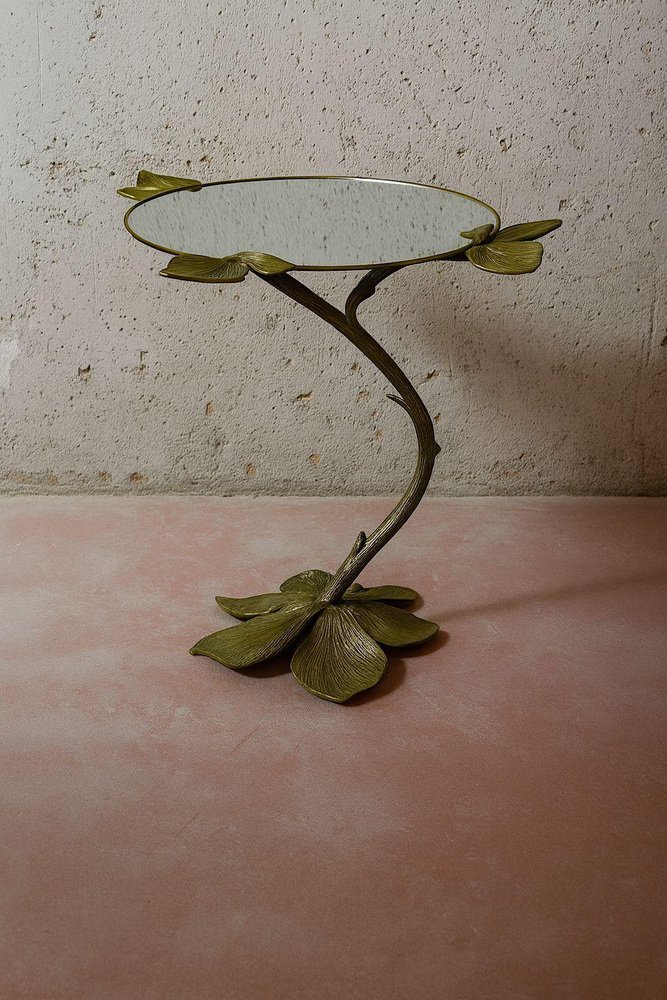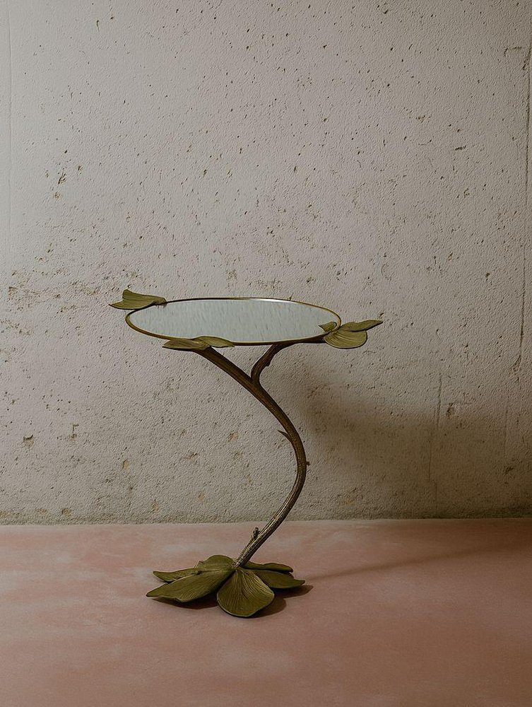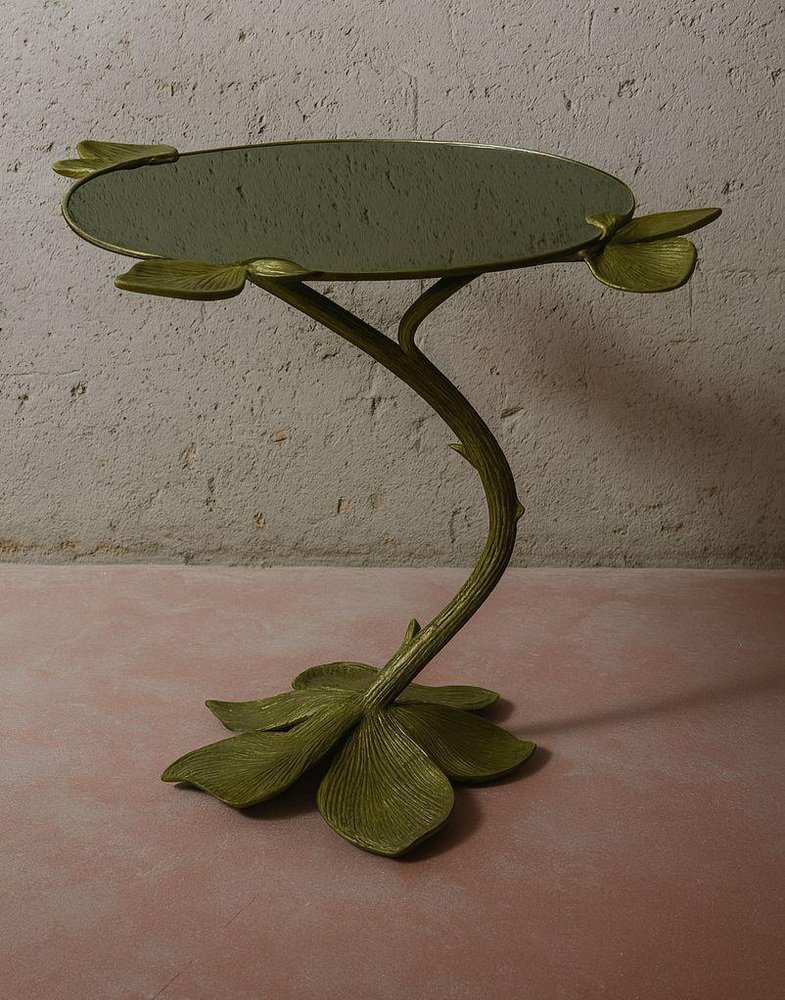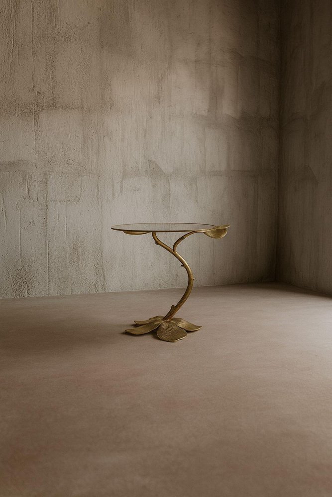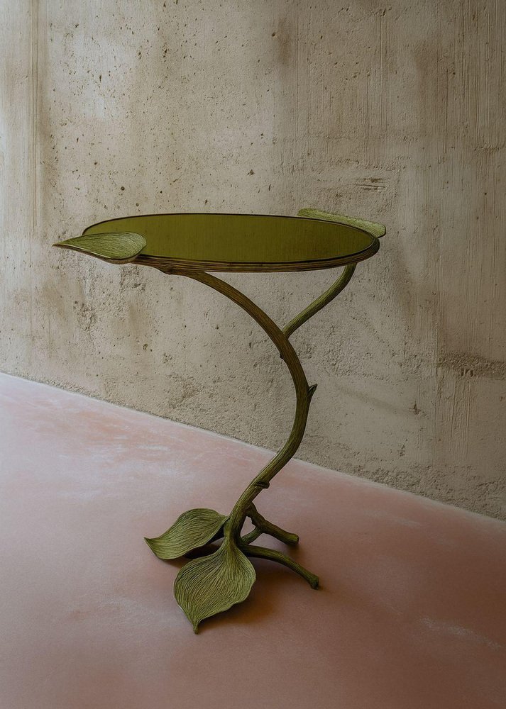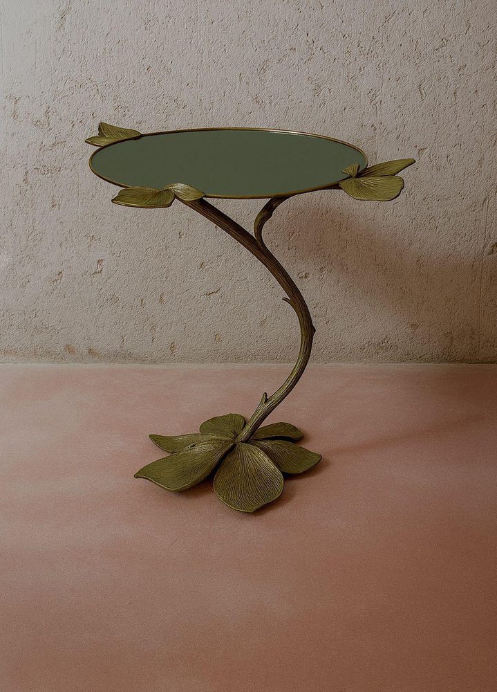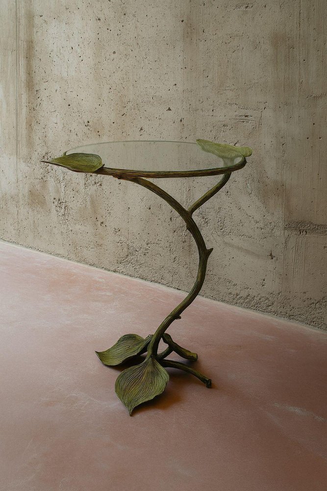 Autunno Side Table in Bronze & Glass by Marsica Fossati Dimensions: D 50 x W 50 x H 55 cm. Materials: Bronze and glass. Handcrafted in Italy. A sculptural table where nature meets resilience. Its bronze base rises like a withered branch, stripped of life yet adorned with a few enduring leaves. Though it seems fragile, the branch holds its strength with quiet determination, gracefully supporting the irregular round glass top. A reminder that even what appears lifeless can still endure with power and elegance. Marsica Fossati is an Italian designer and artist known for her eclectic creativity and meticulous attention to detail. She’s always inspired by the natural and mysticworld. Her practice has always been guided by a strong sensitivity to the relationship between form, material, and space, an approach that naturally extends into her artistic vision.