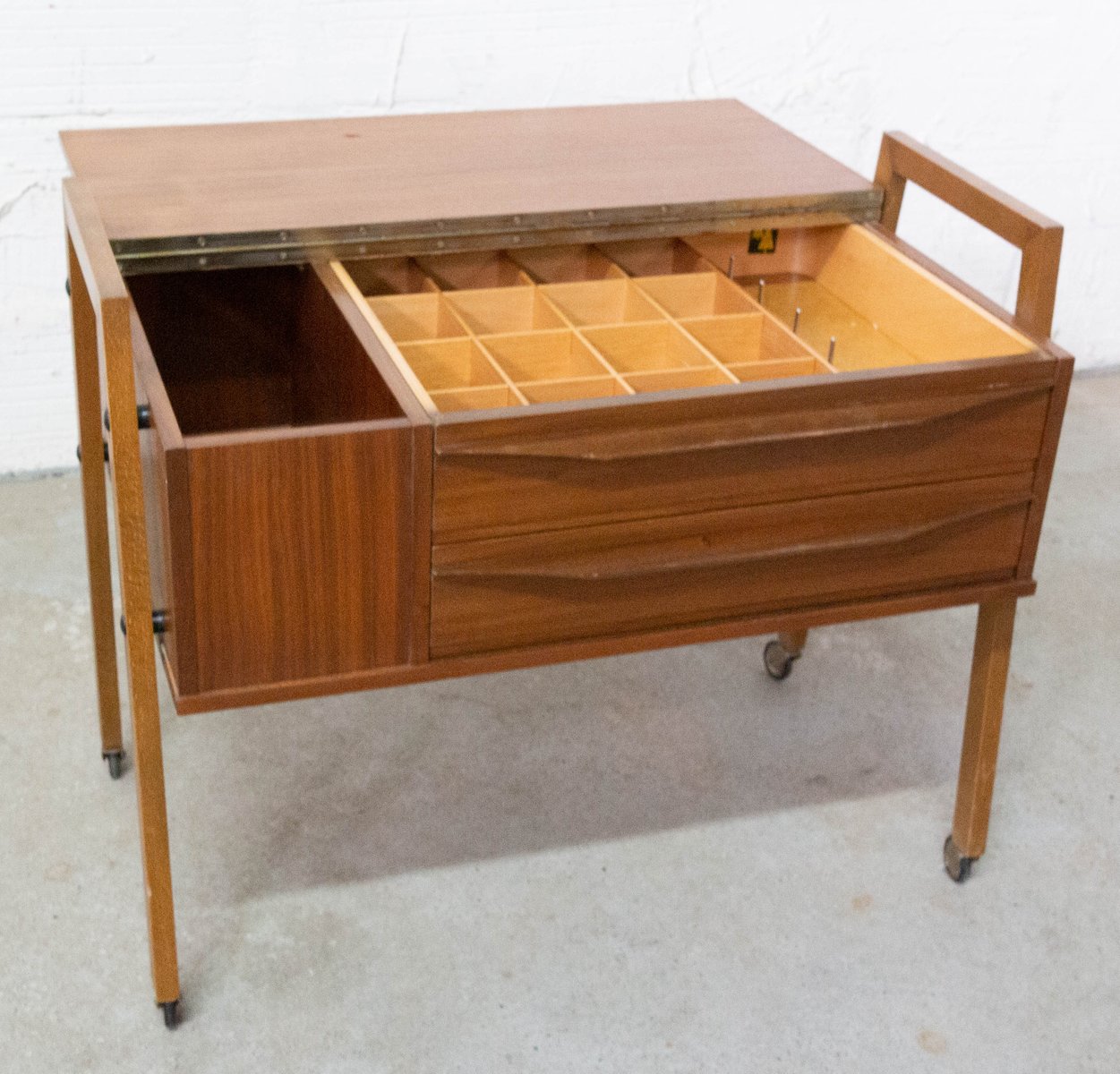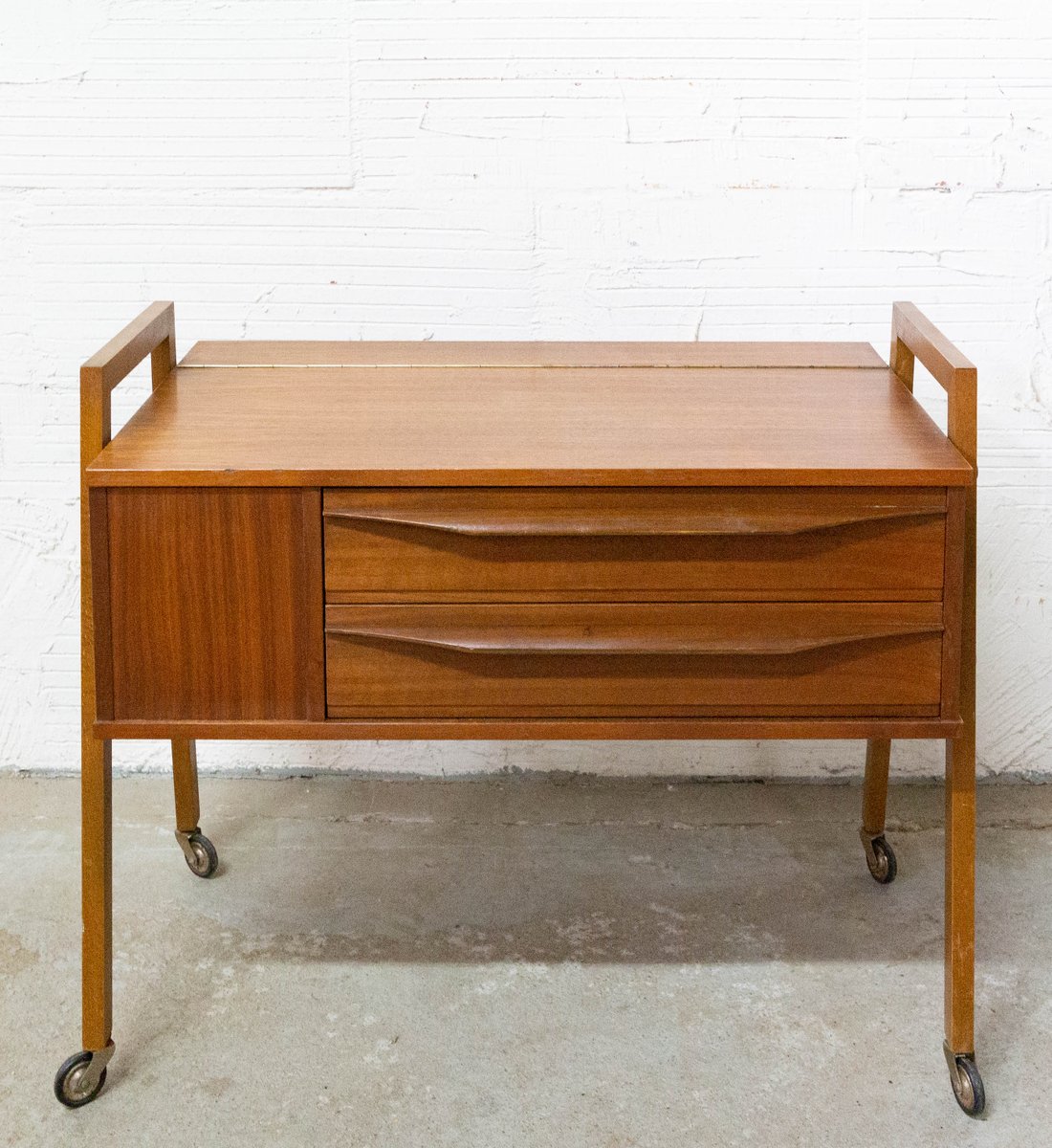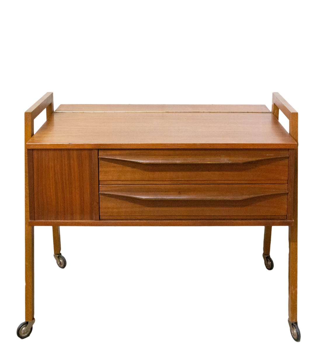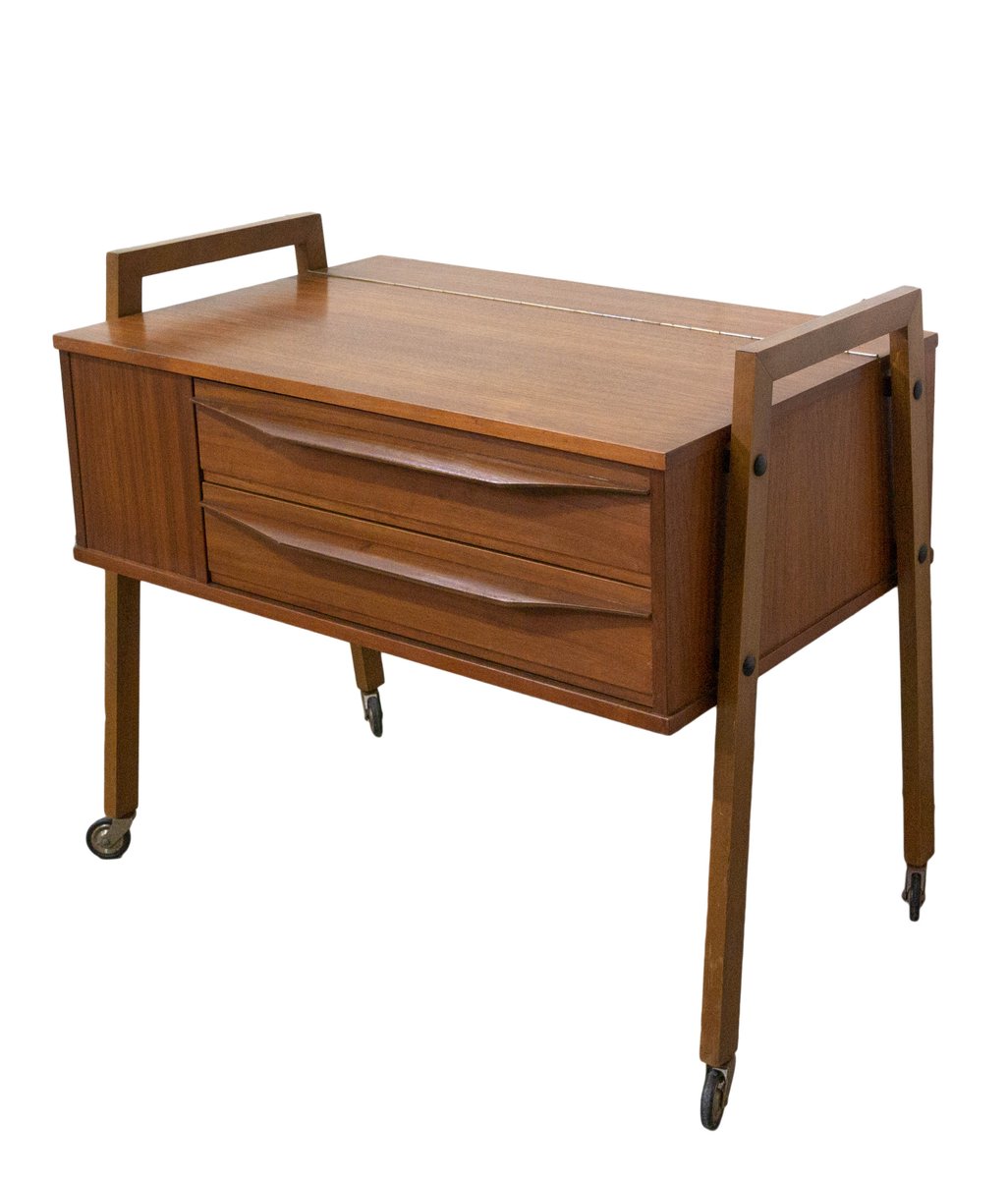 Mesa auxiliar escandinava Mid-Century de teca con ruedas