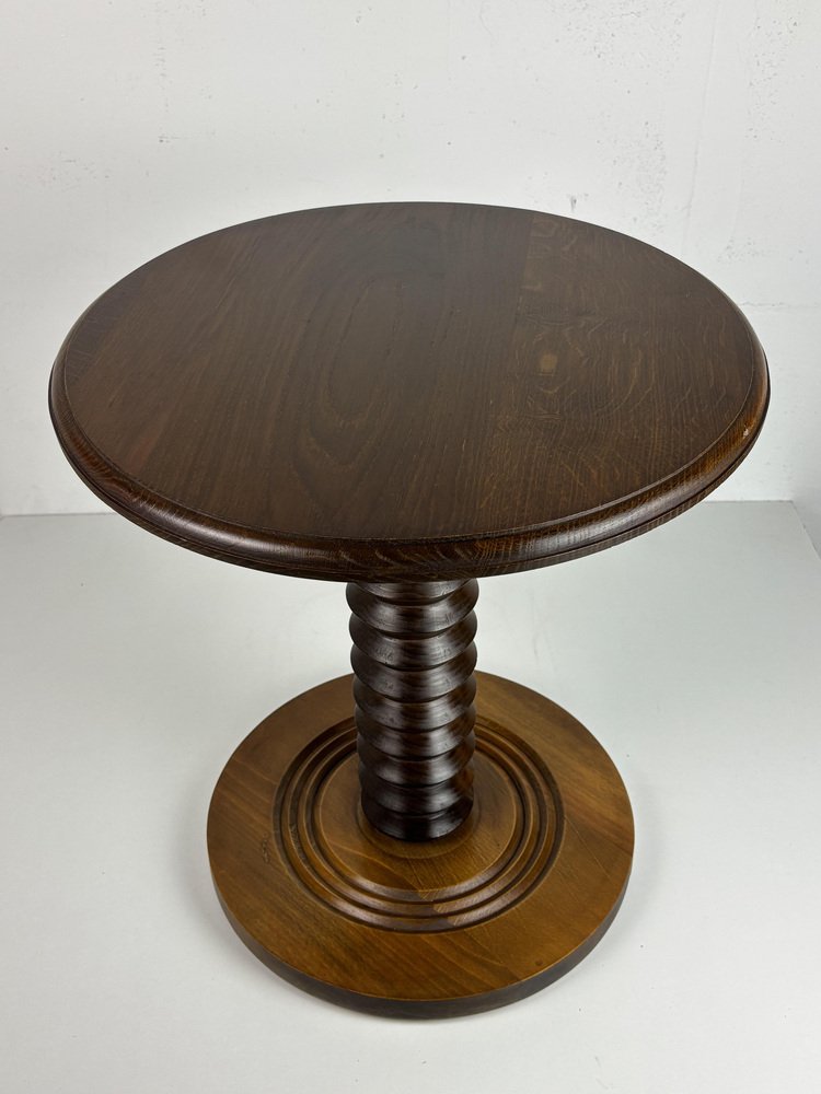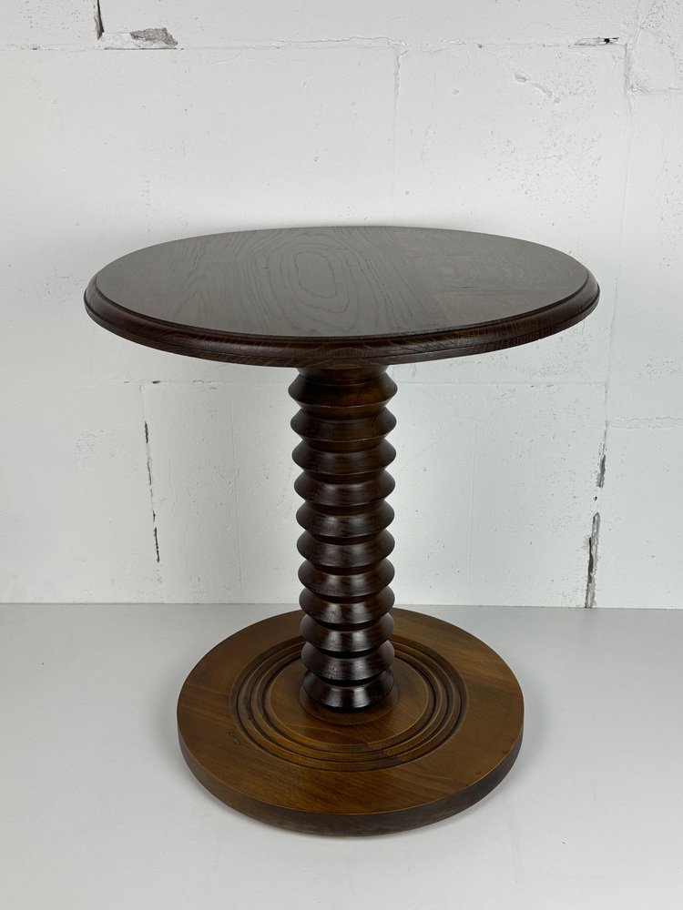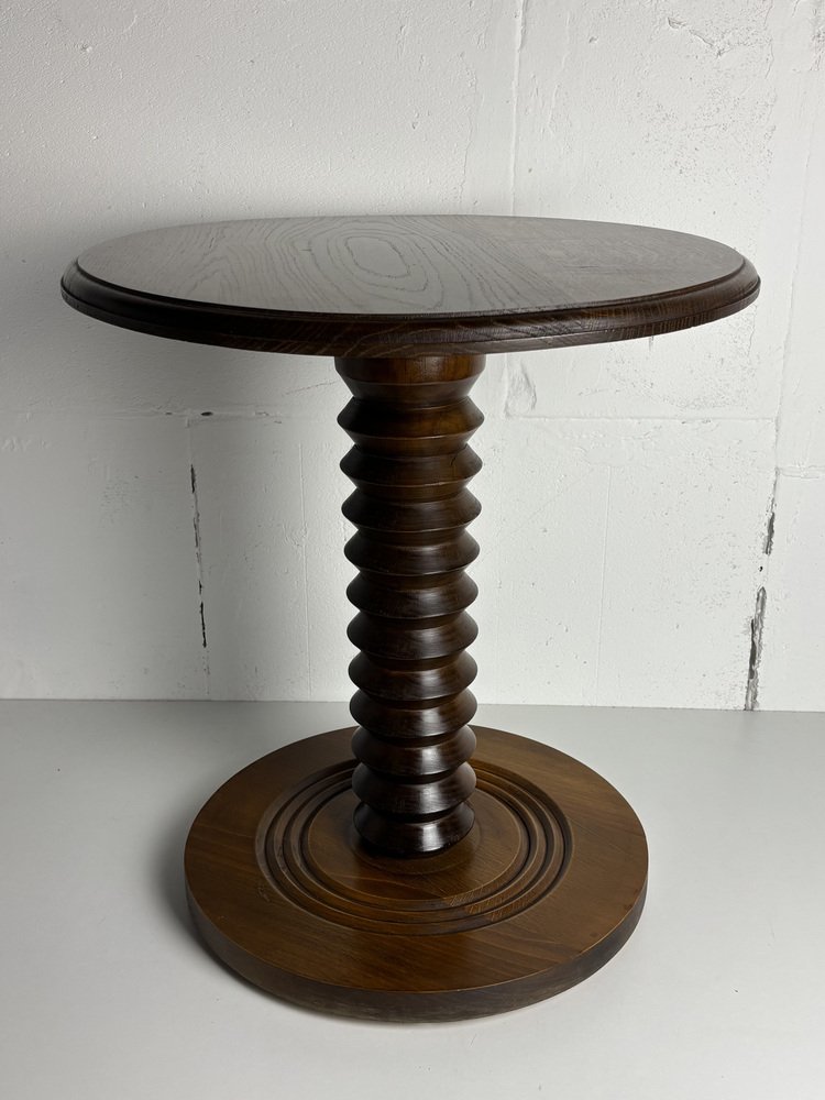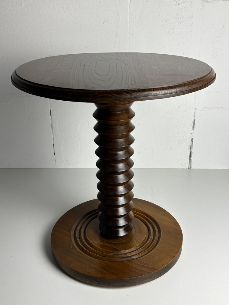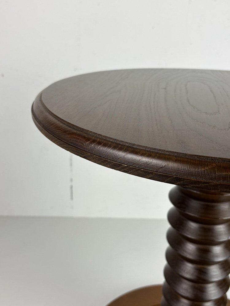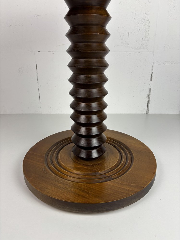 Mesa auxiliar francesa brutalista de madera torneada al estilo de Charles Dudouyt, años 50
