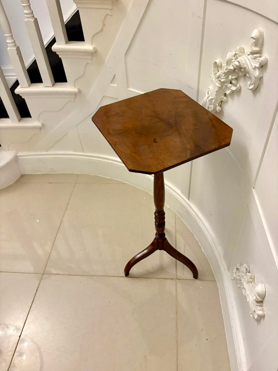 Refinada mesa auxiliar georgiana trípode de caoba de elegantes proporciones que presenta un tablero cuadrado con esquinas inclinadas, un detalle atractivo y poco común que añade sofisticación a su forma limpia y arquitectónica. El tablero presenta una pátina cálida y bien desarrollada que resalta la calidad de la caoba de la época.