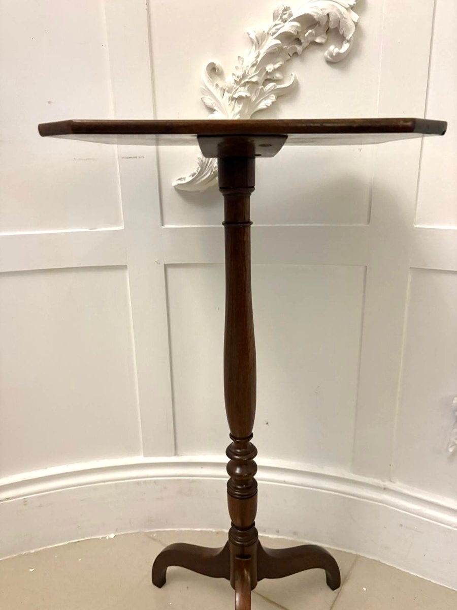 La columna torneada es esbelta y está finamente ejecutada con delicados anillos torneados que transicionan con gracia hacia una base trípode bien formada. Cada pata termina en un pie arqueado que crea una elegante silueta típica de la artesanía georgiana de finales del siglo XVIII y principios del XIX.