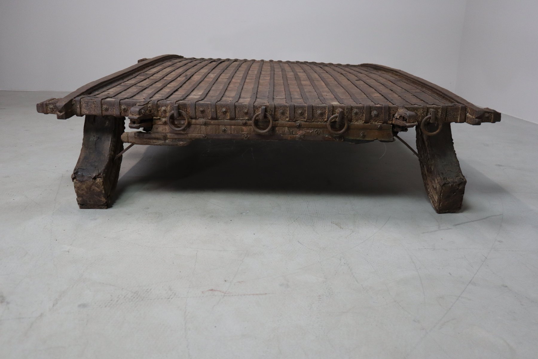 A profoundly textured relic of vernacular Indian craftsmanship, this late 18th–early 19th century bullock cart platform offers not just furniture, but a narrative in solid wood. Formerly the load-bearing base of a working ox cart, it presents as a sculptural, low-slung structure — unpolished, elemental, and deeply honest in materiality.