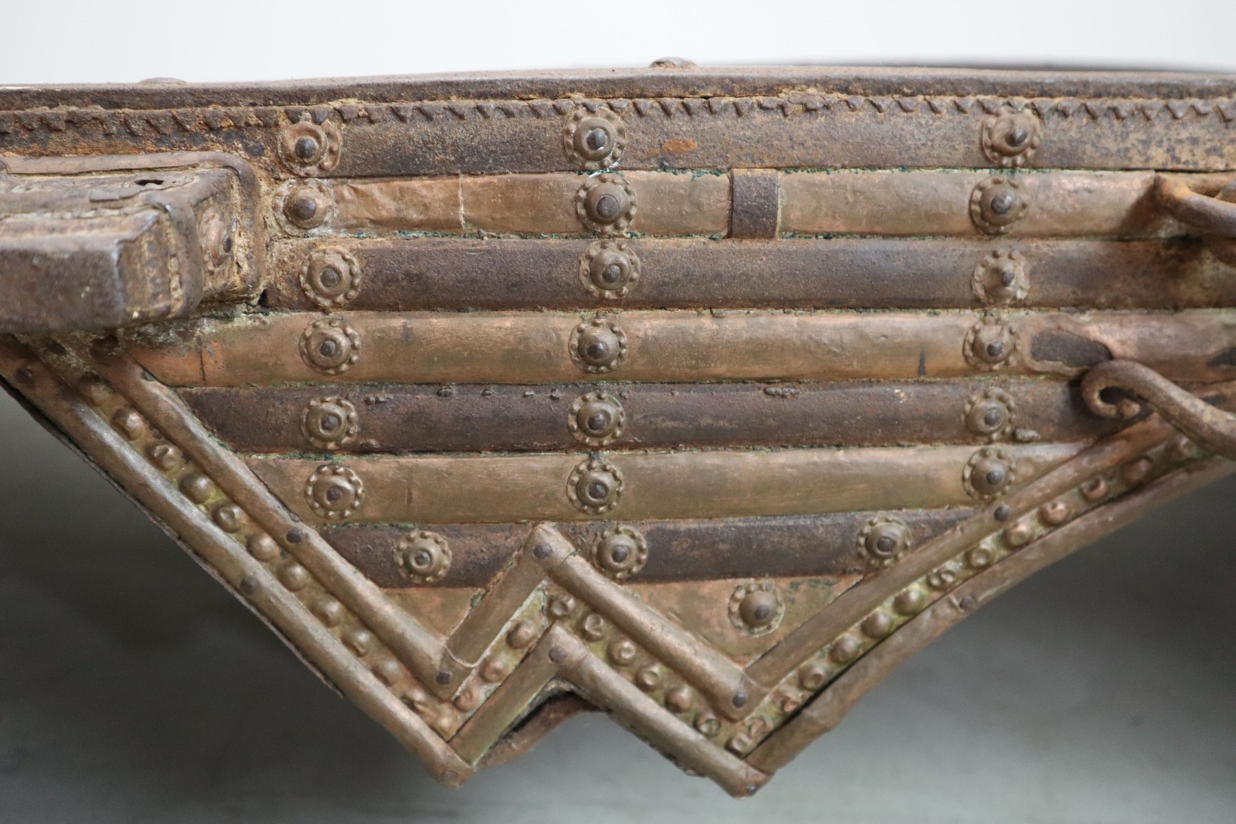 El armazón de madera dura -probablemente de teca o sal- está atado con flejes de hierro forjados a mano y adornado con herrajes de latón originales, cada uno de ellos suavizado por décadas de uso. Las patas, graciosamente arqueadas y talladas a mano, elevan la pieza ligeramente del suelo, imprimiéndole una sensación de elegancia aterrizada.