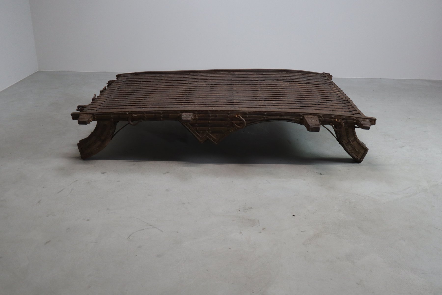 Esta plataforma de carro de bueyes de finales del siglo XVIII-principios del XIX, reliquia de la artesanía india vernácula y profundamente texturada, no es sólo un mueble, sino un relato en madera maciza. Antigua base de carga de un carro de bueyes, se presenta como una estructura escultórica de poca altura, sin pulir, elemental y profundamente honesta en su materialidad.