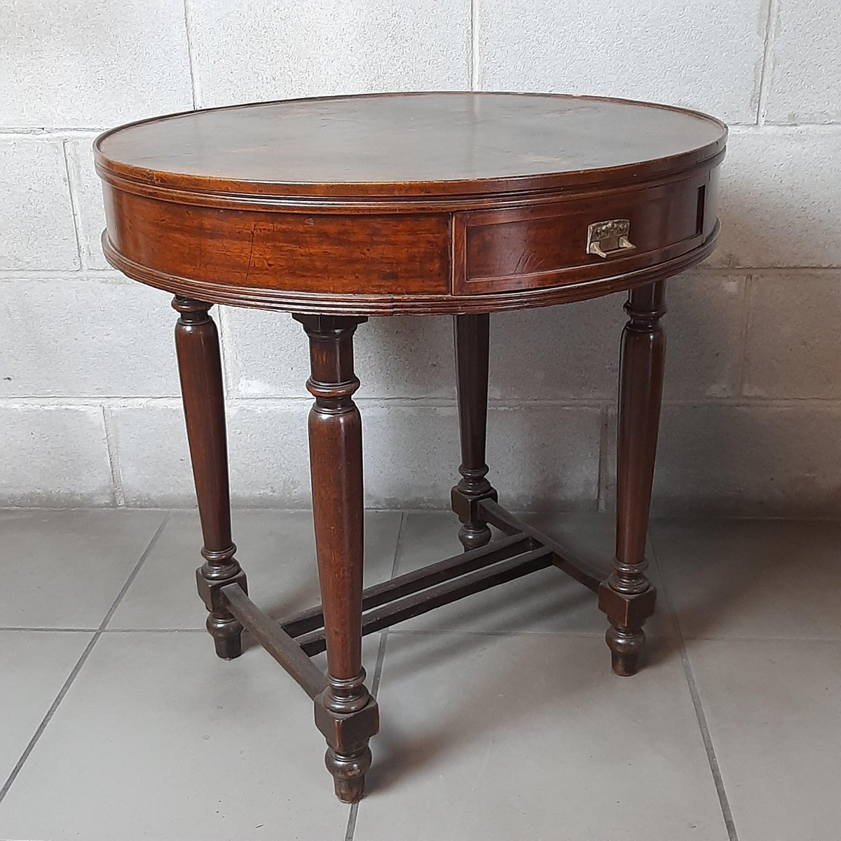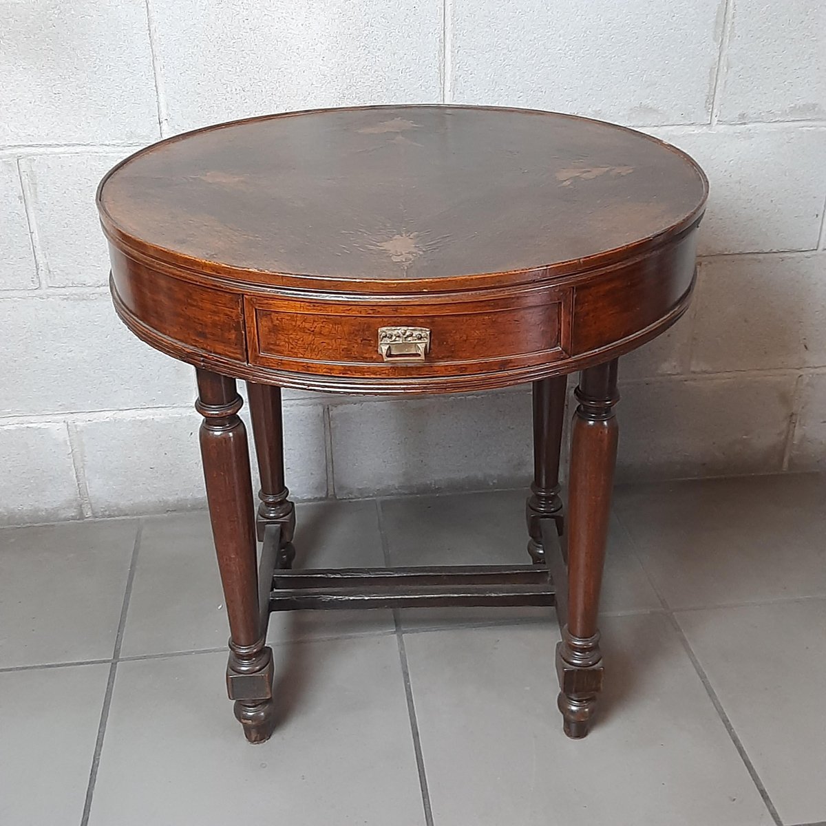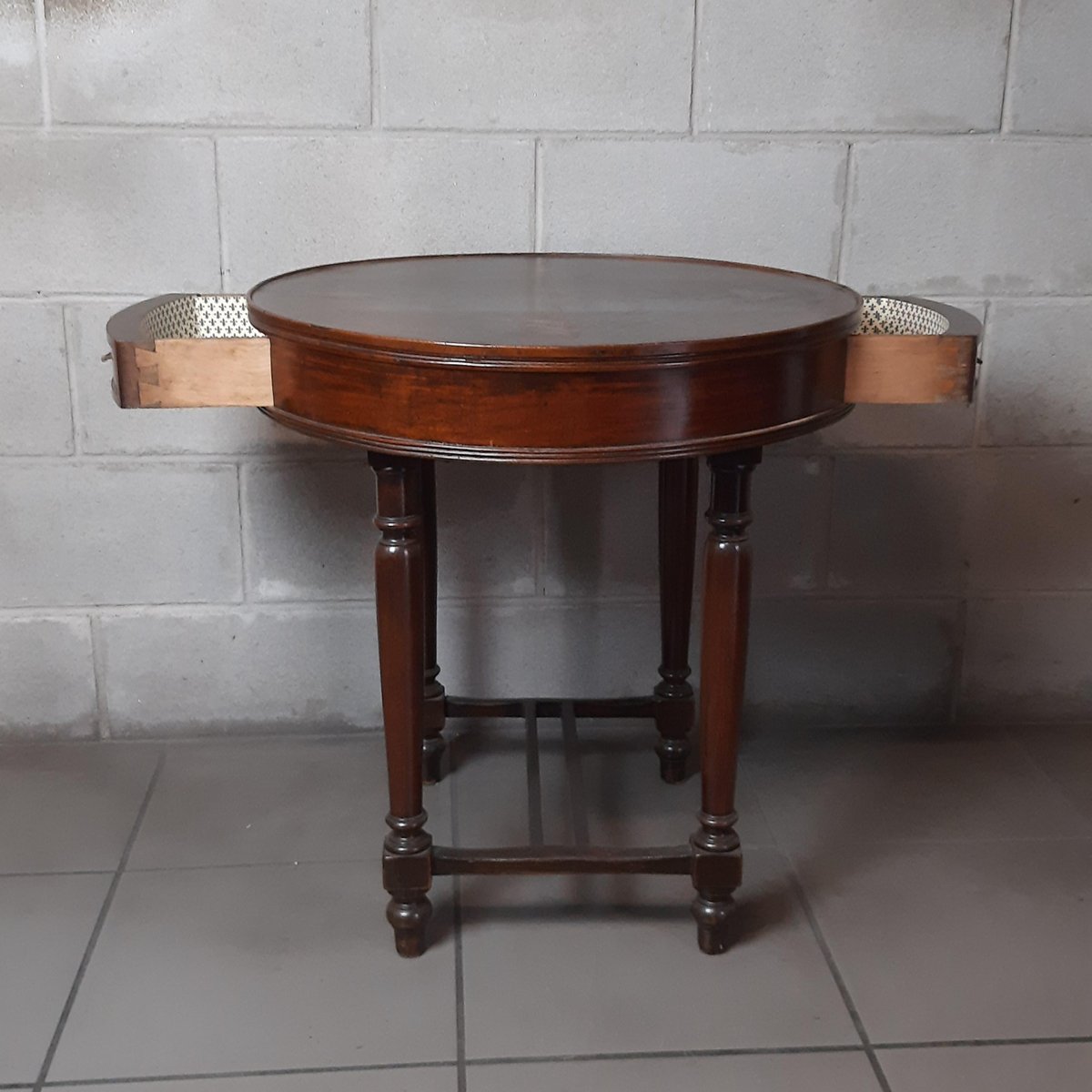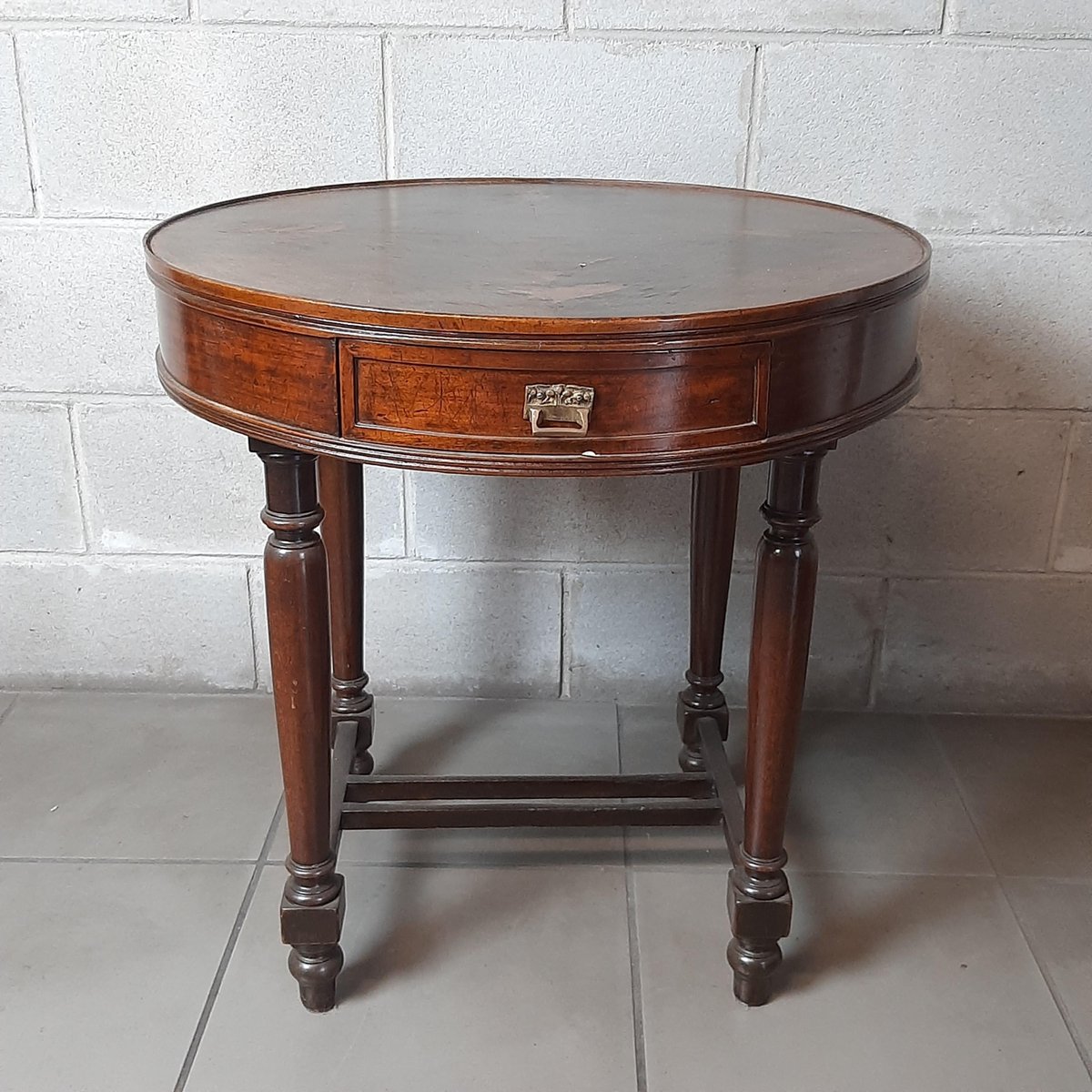 Antigua mesa redonda de madera, completa con dos cajones, excelente fabricación italiana, muy espectacular y rara.