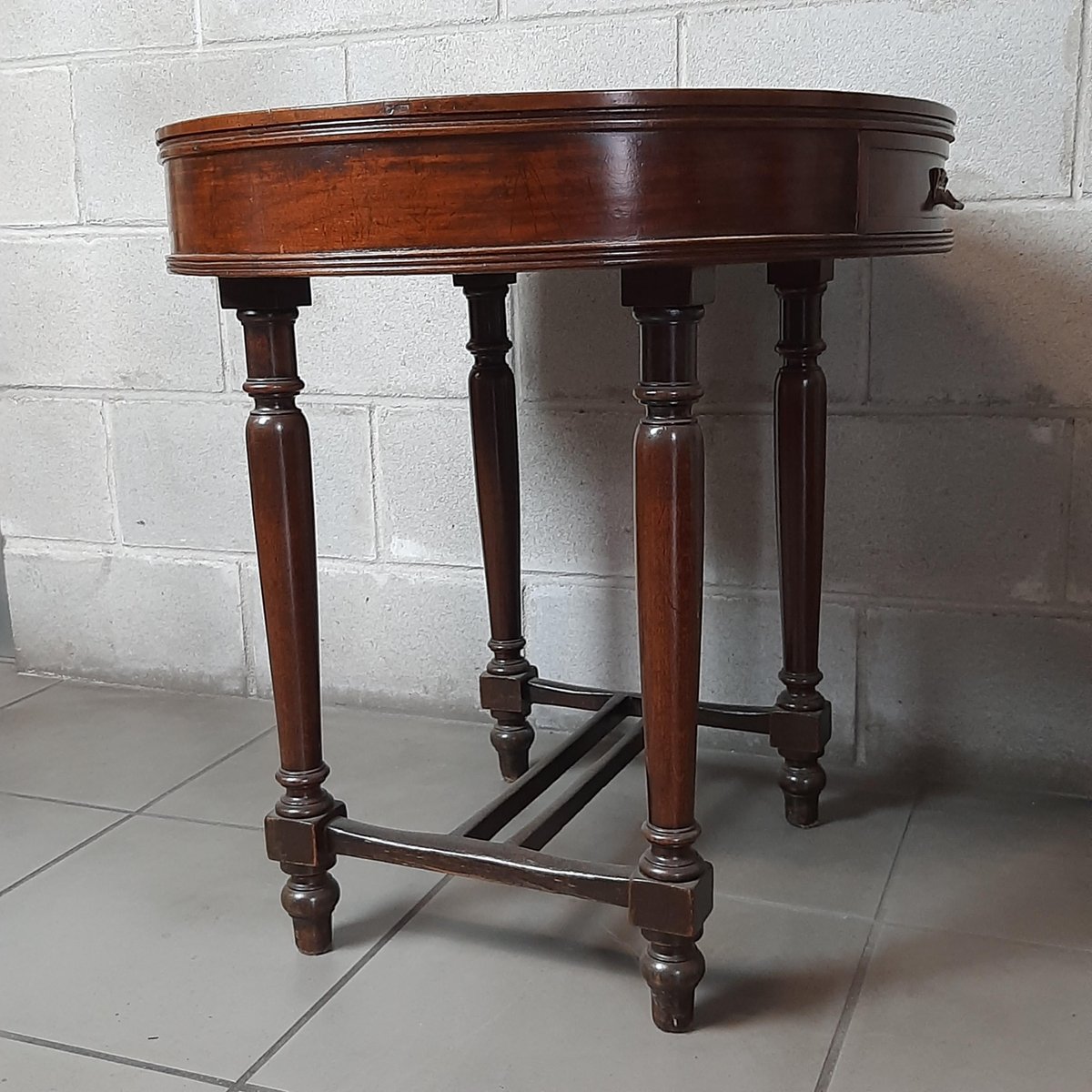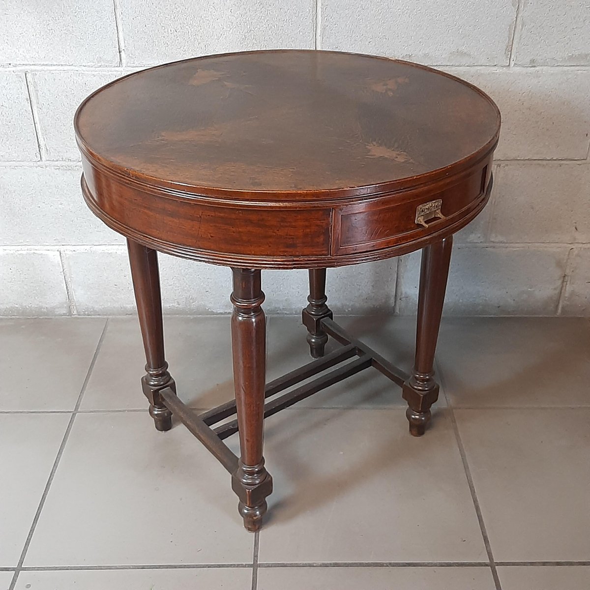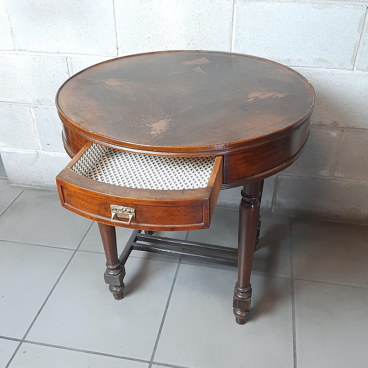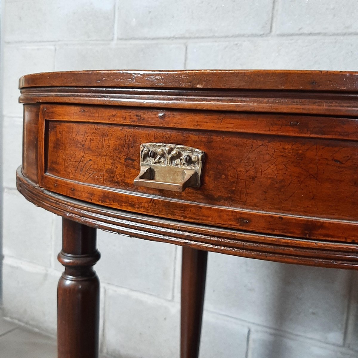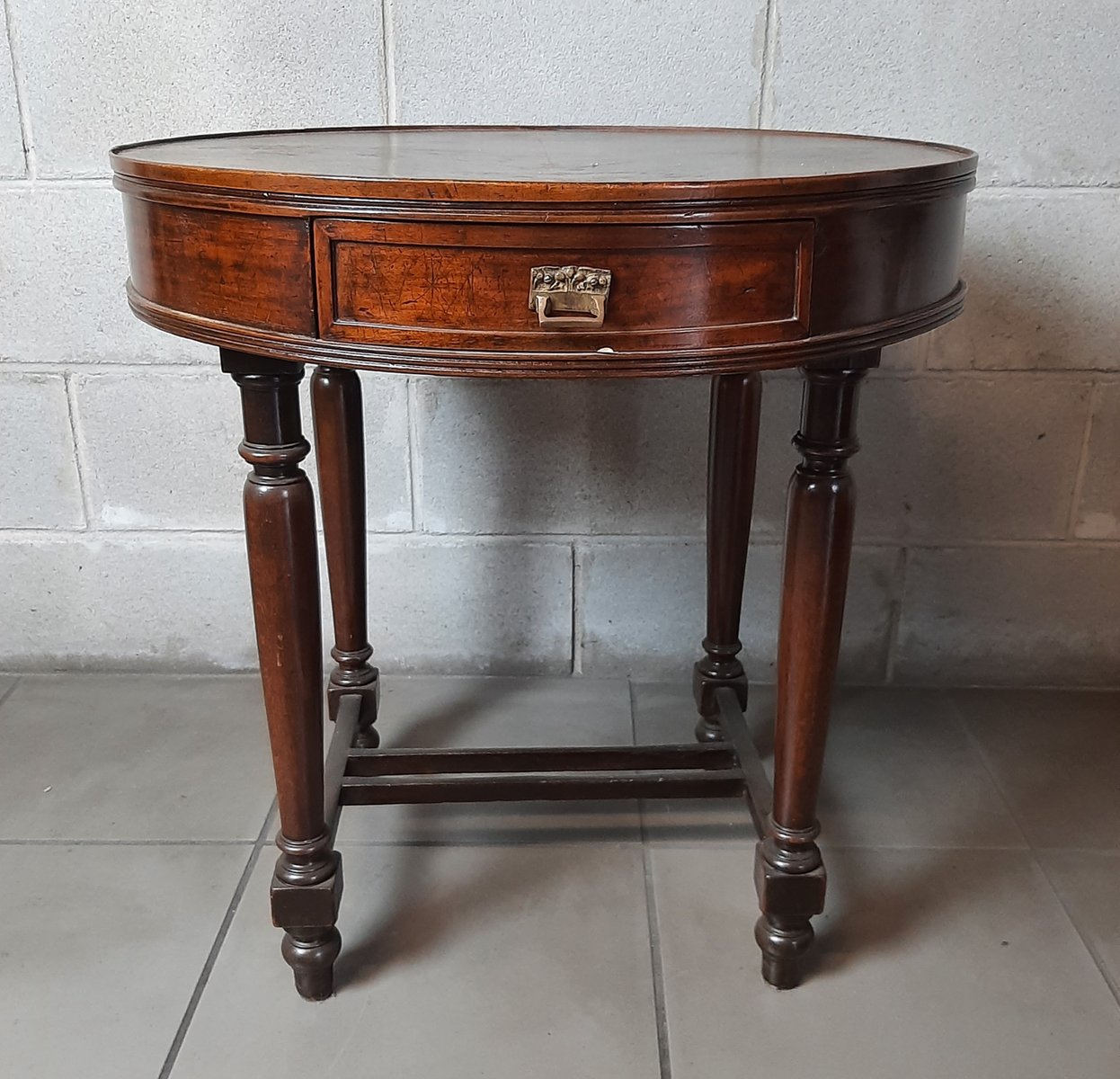 Antigua mesa redonda de madera, completa con dos cajones, excelente fabricación italiana, muy espectacular y rara.