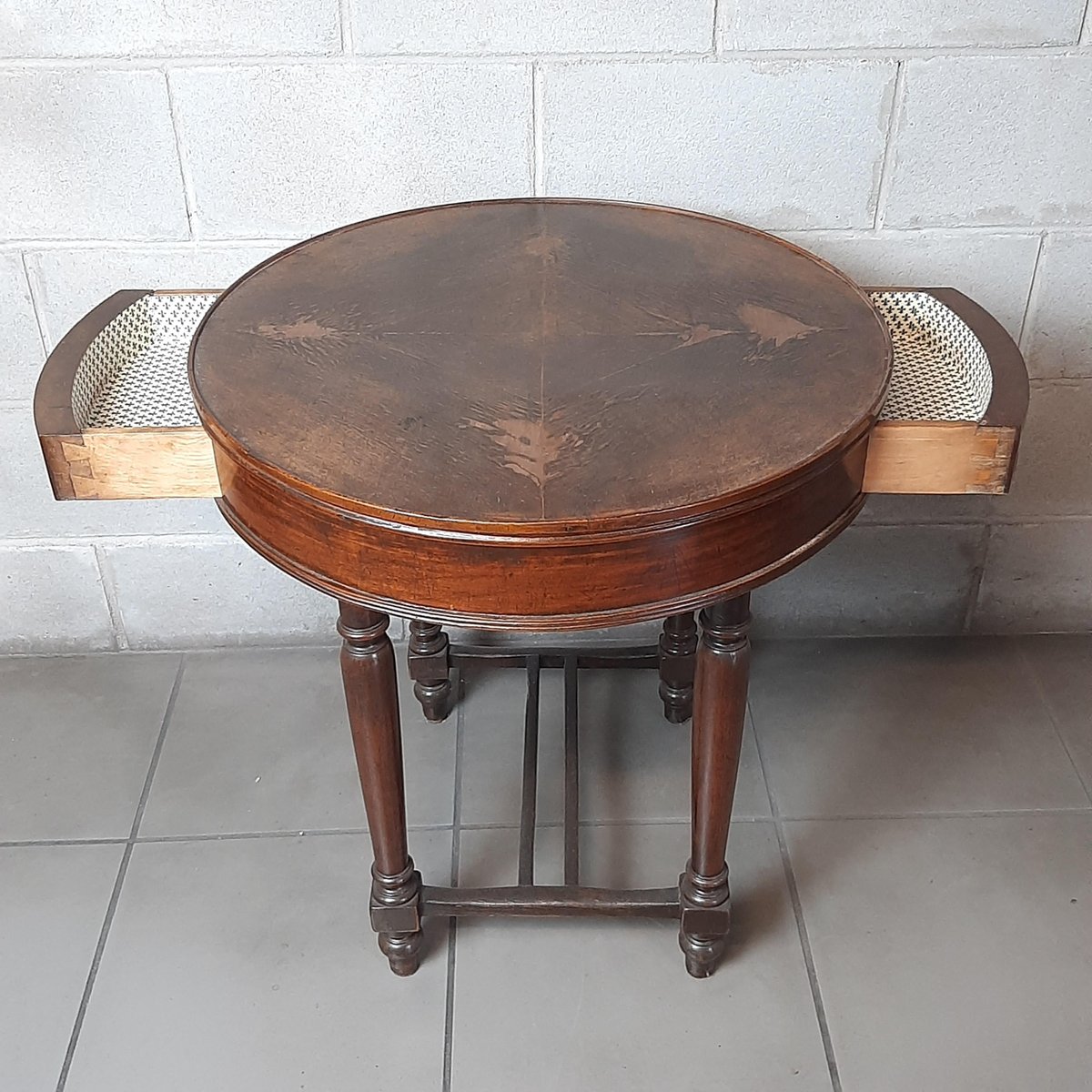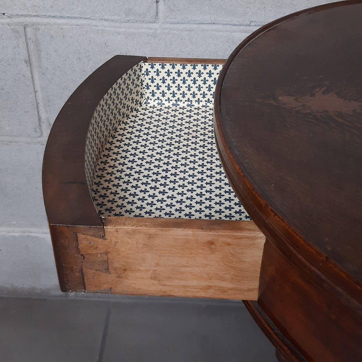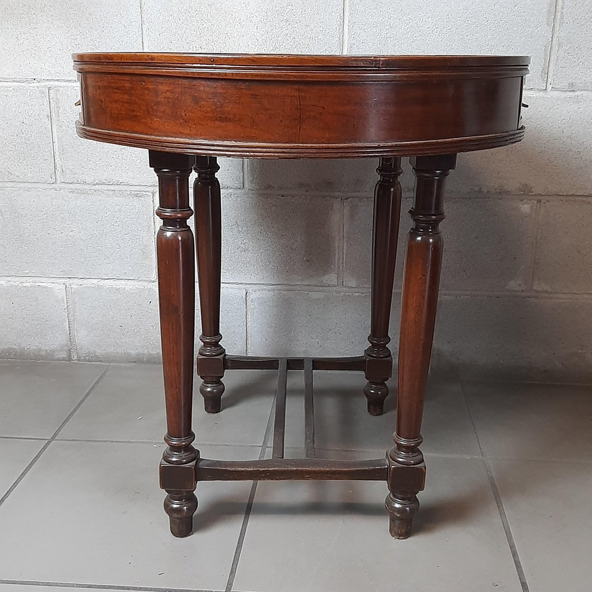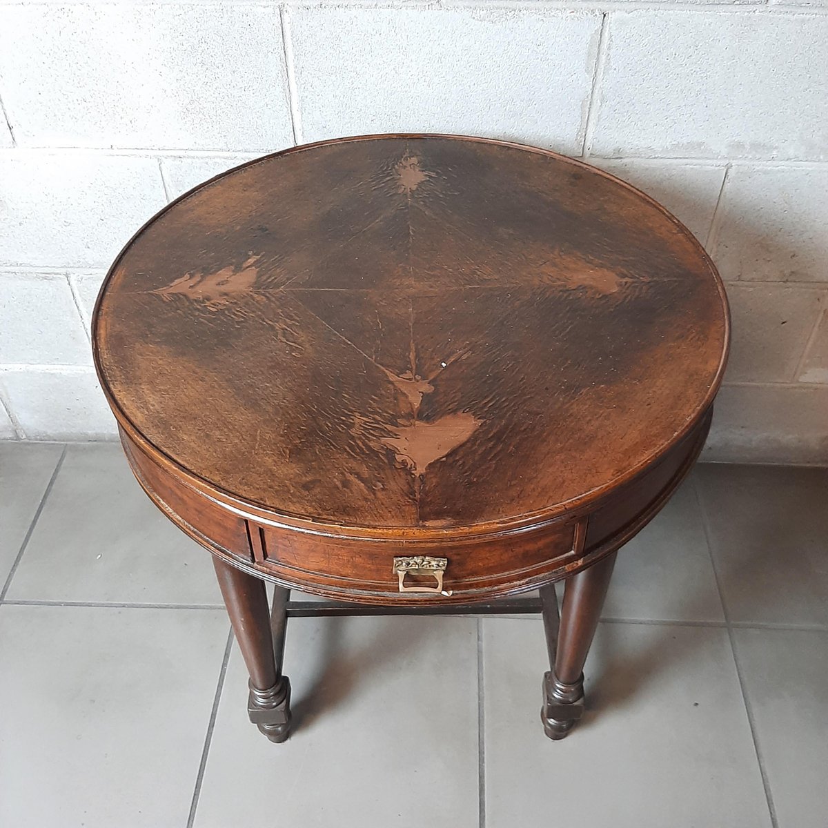 Antigua mesa redonda de madera, completa con dos cajones, excelente fabricación italiana, muy espectacular y rara.