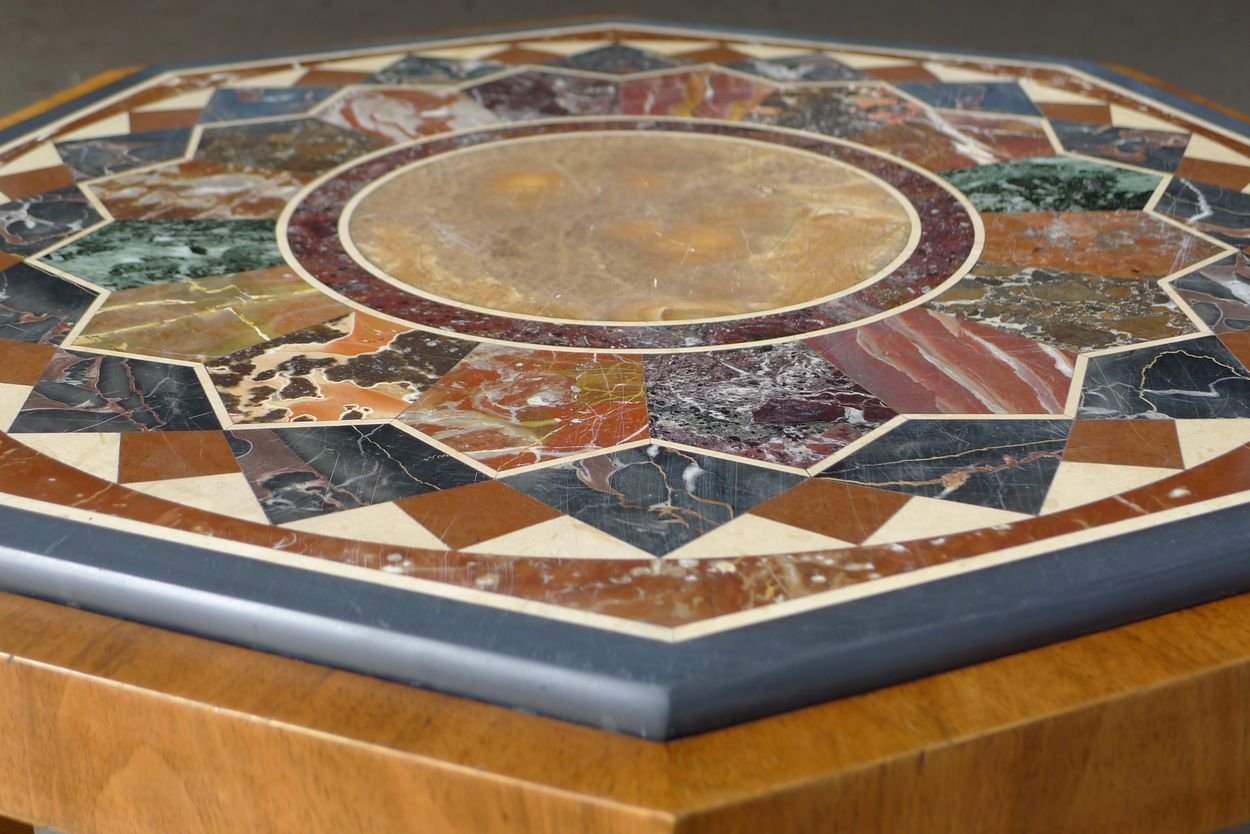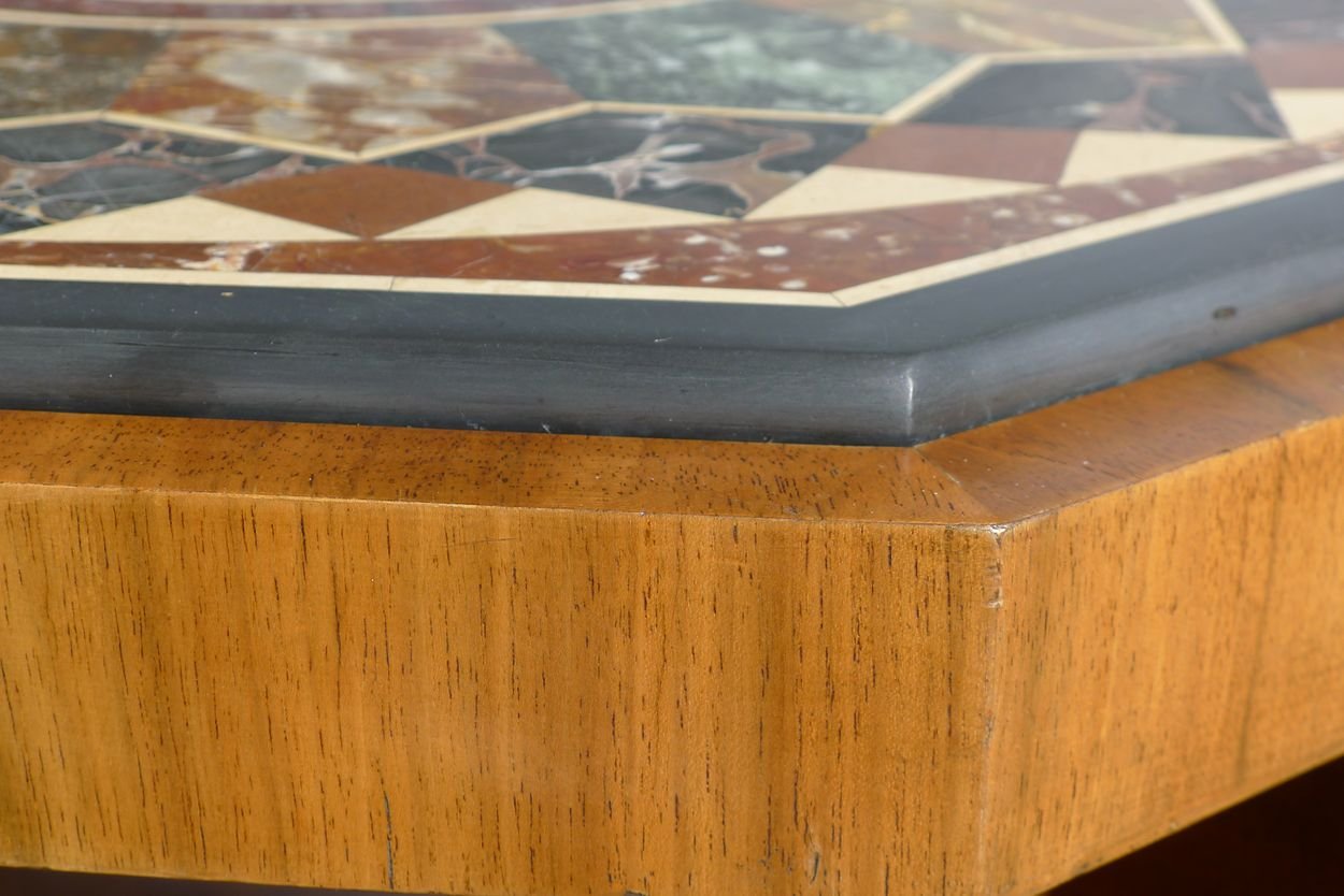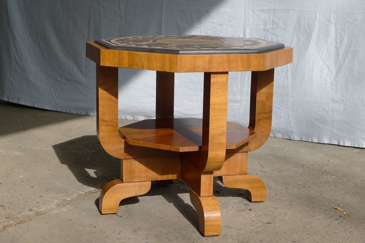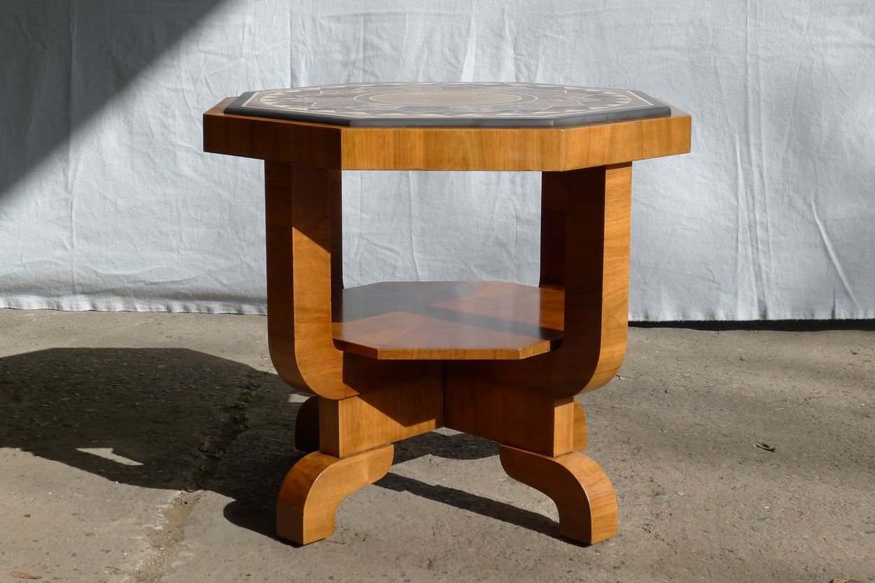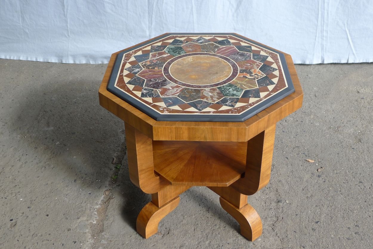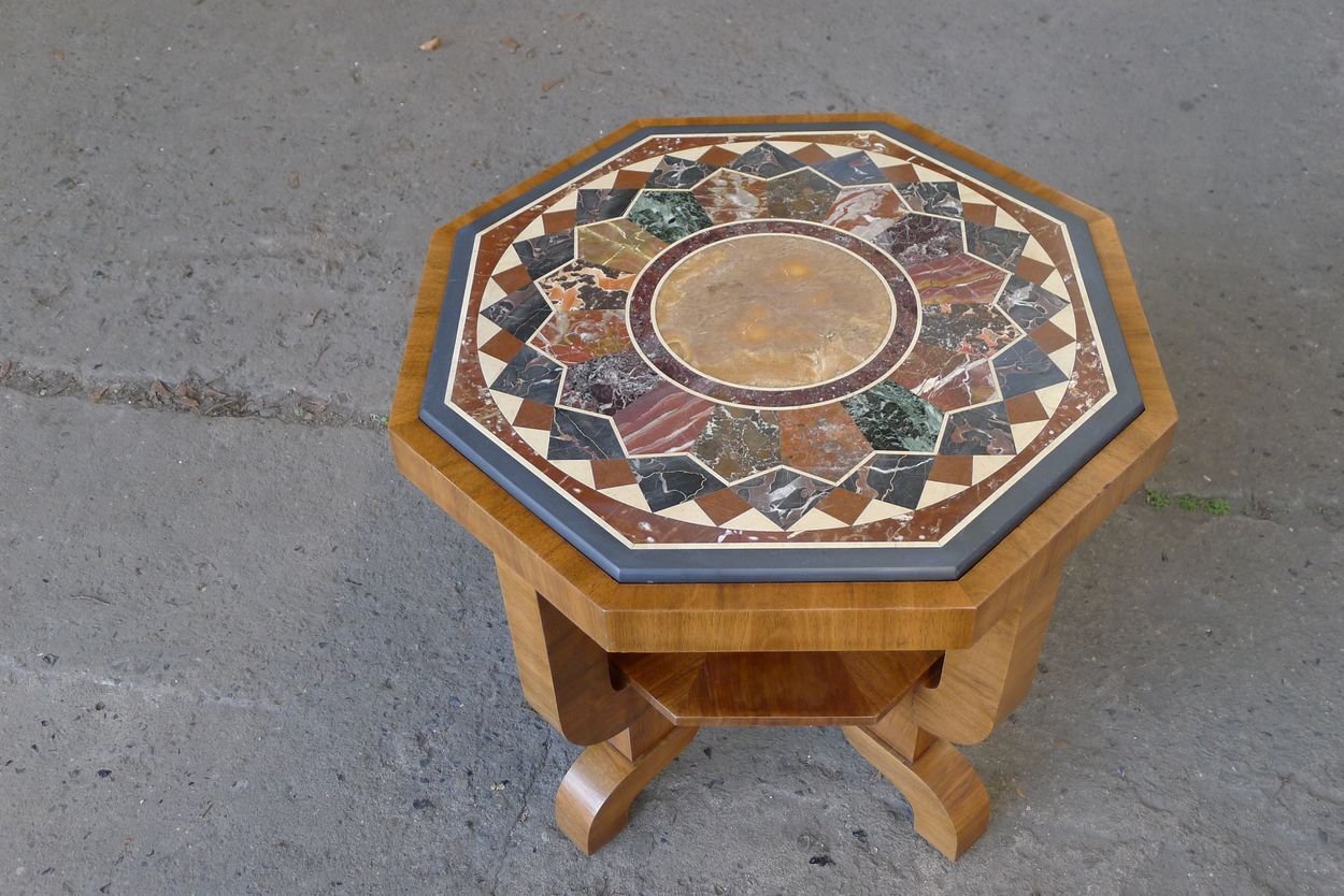 Mesa de centro Art Déco octogonal de nogal y mármol con incrustaciones geométricas, años 20