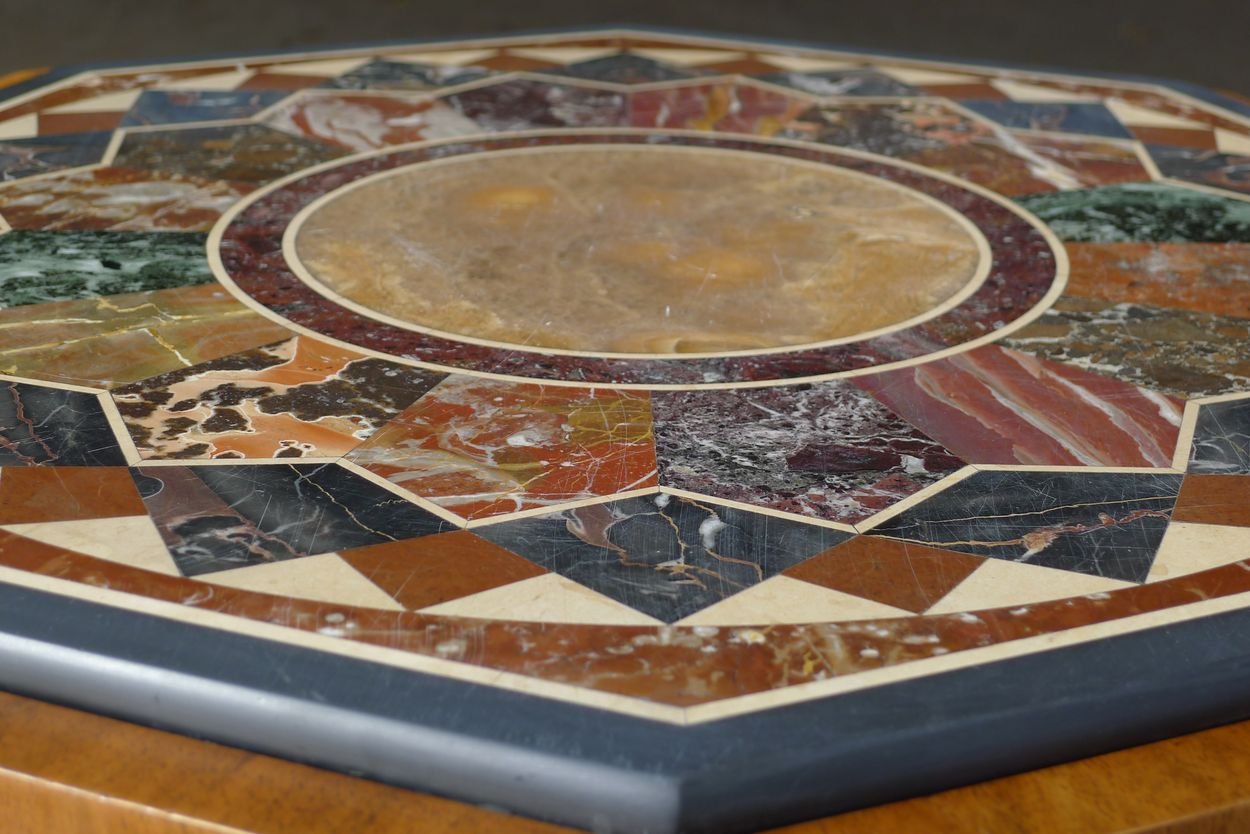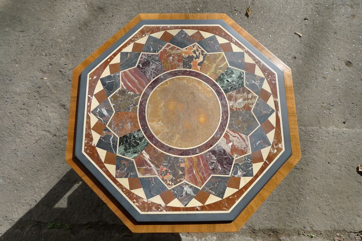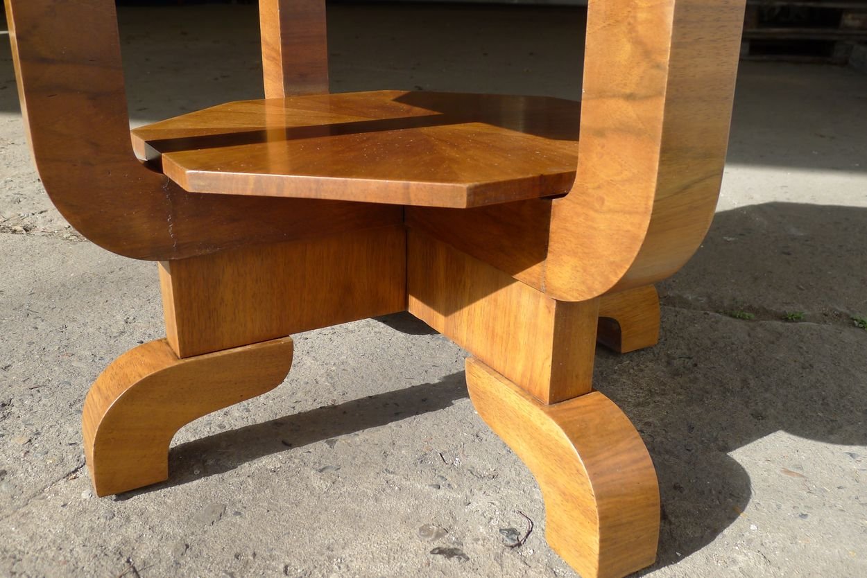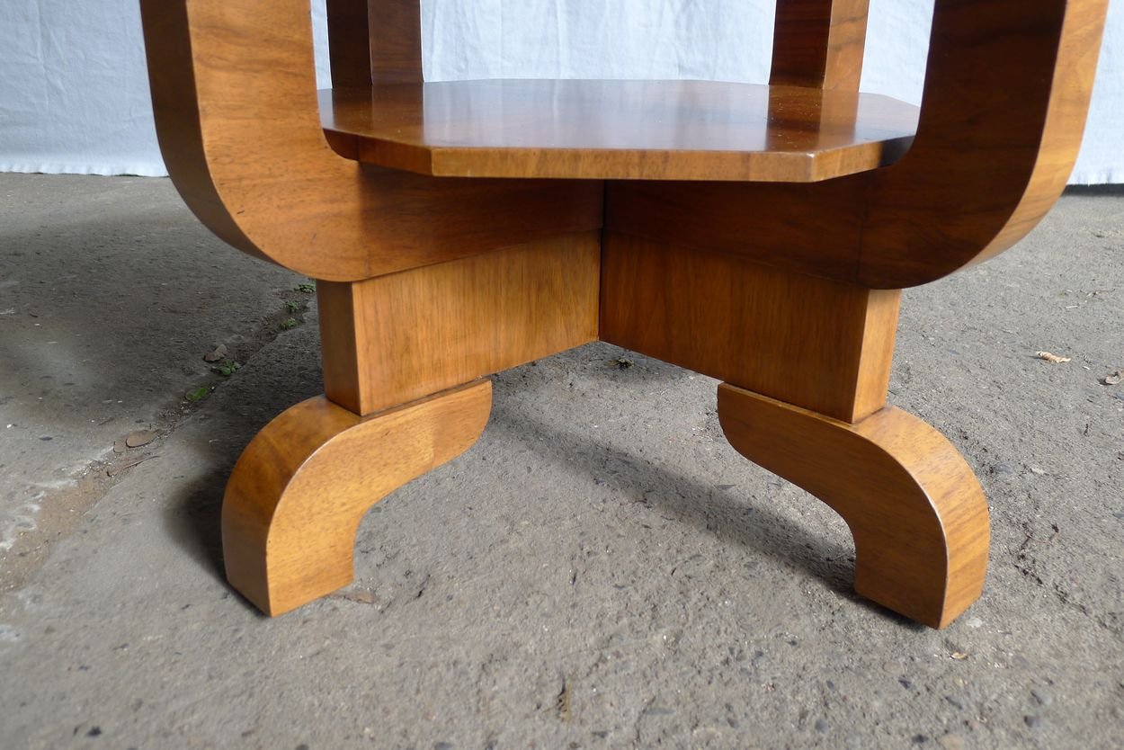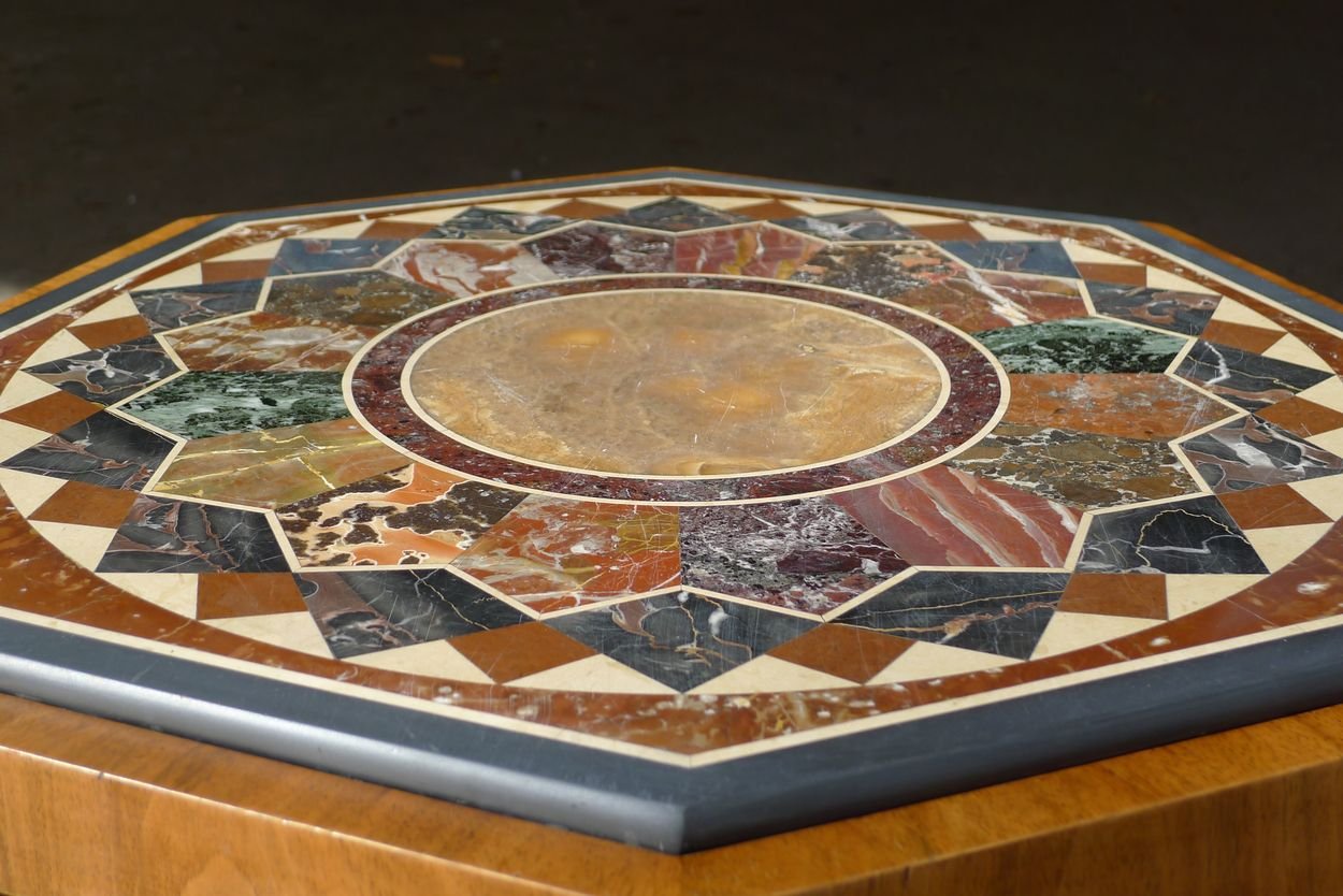 Mesa de centro Art Déco octogonal de nogal y mármol con incrustaciones geométricas, años 20