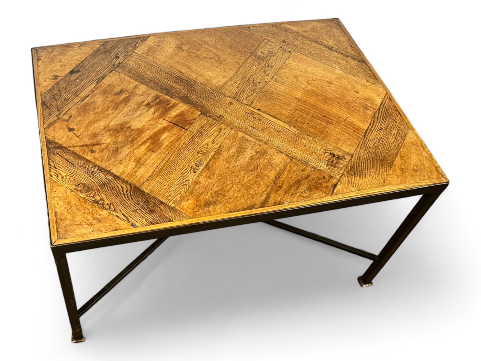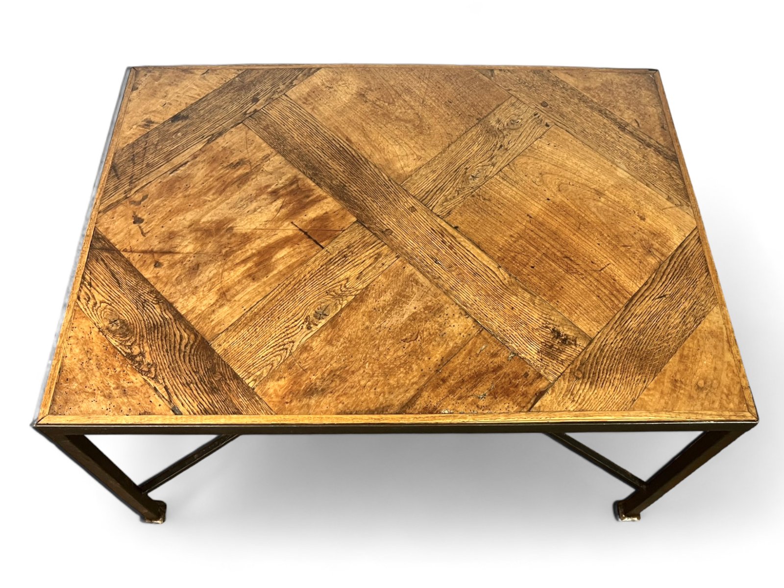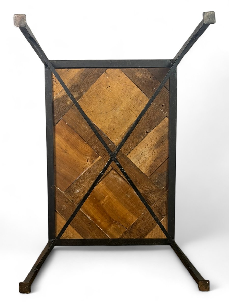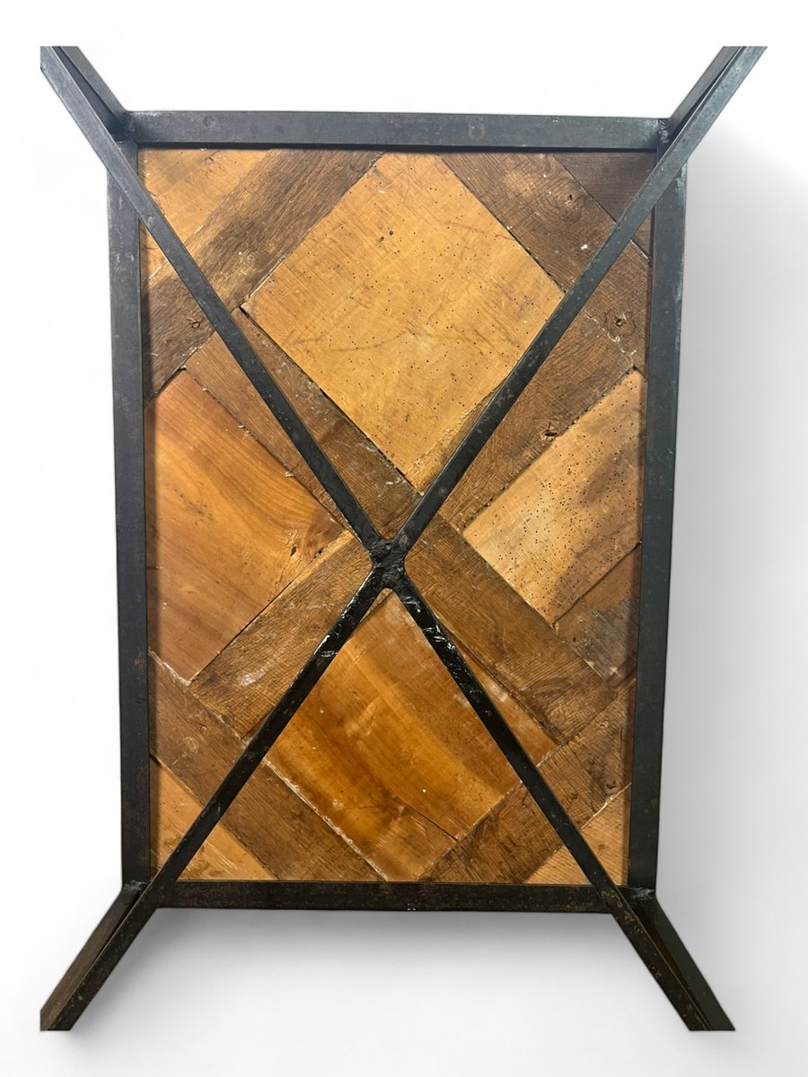 The parquet floor was mounted, in the 20th century, on a black metal wrought iron frame which brings a lot of modernity while leaving an important place and highlighting the elegance and antiquity of the Versailles parquet panel from the 17th century . The panel is made of oak.