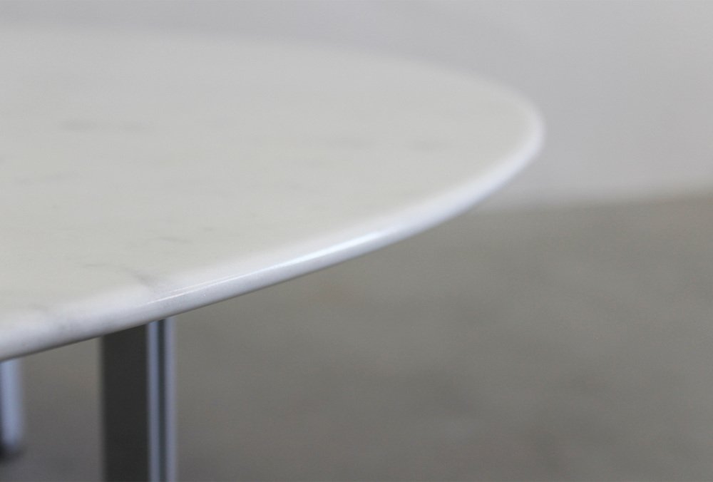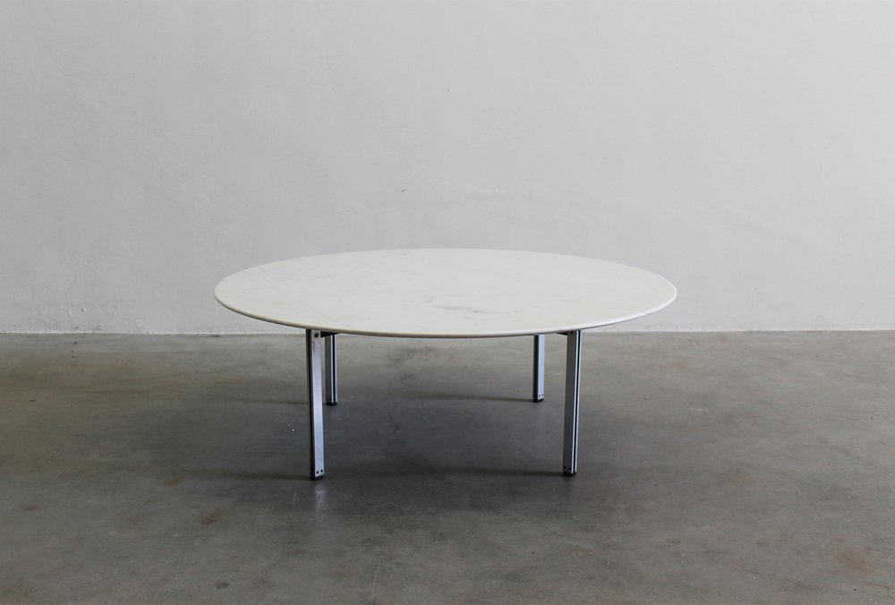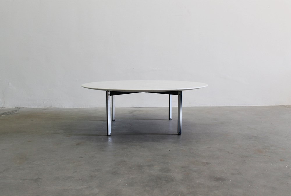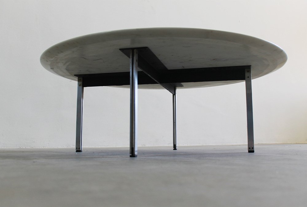 Low table with a round-shaped table top in white marble and four metal legs from the Parallel Bar series, designed by Florence Knoll and manufactured by Knoll International during the 1950s.
