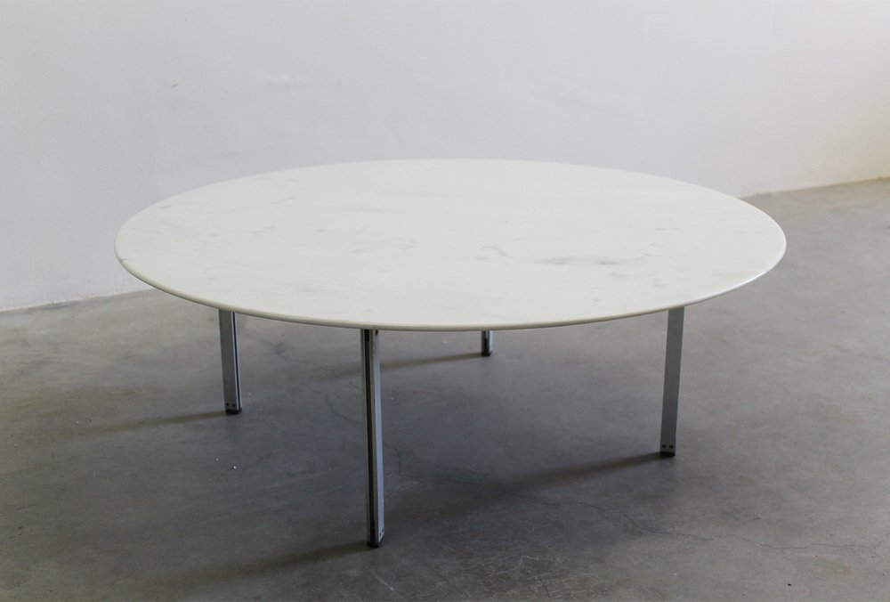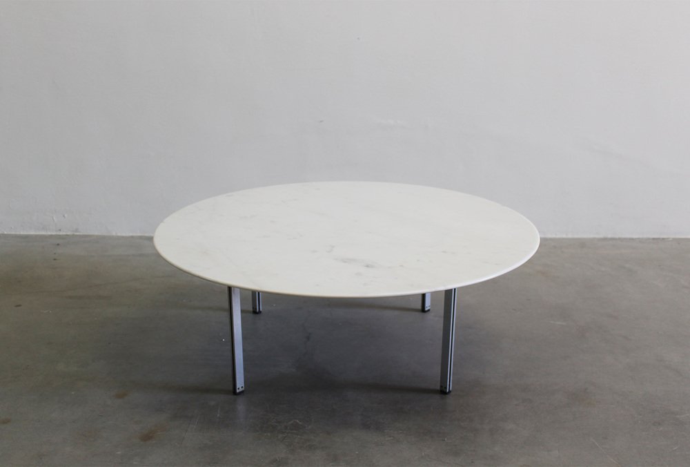 Mesa baja con tablero redondo de mármol blanco y cuatro patas de metal de la serie Parallel Bar, diseñada por Florence Knoll y fabricada por Knoll International durante la década de 1950.