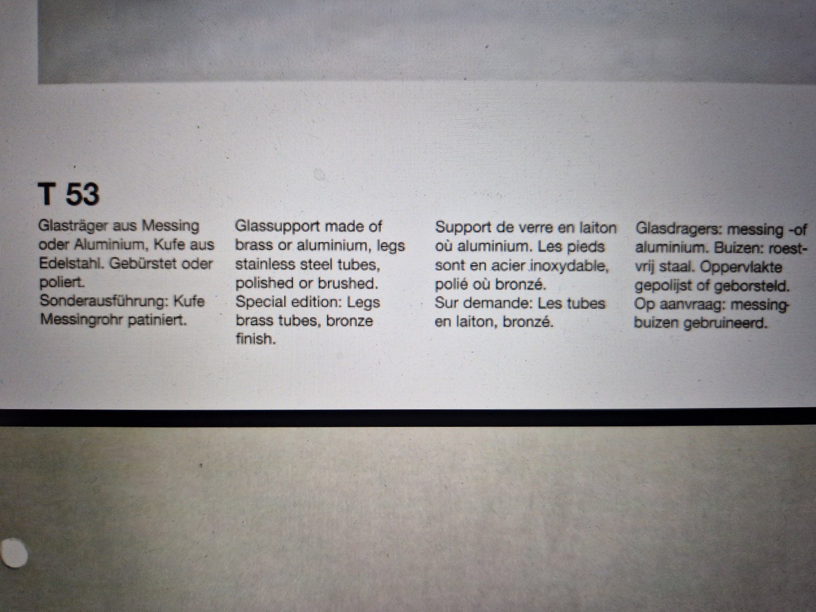 known as the Pioneer Series (1970s). The technique used on the tables has since become Ghyczy’s signature, and is exemplified particularly through the delicate, floating appearance of the frameless glass, which is secured with a single screw. The R03 Shelf uses the same concept, which was patented by Ghyczy in the early 1970s.