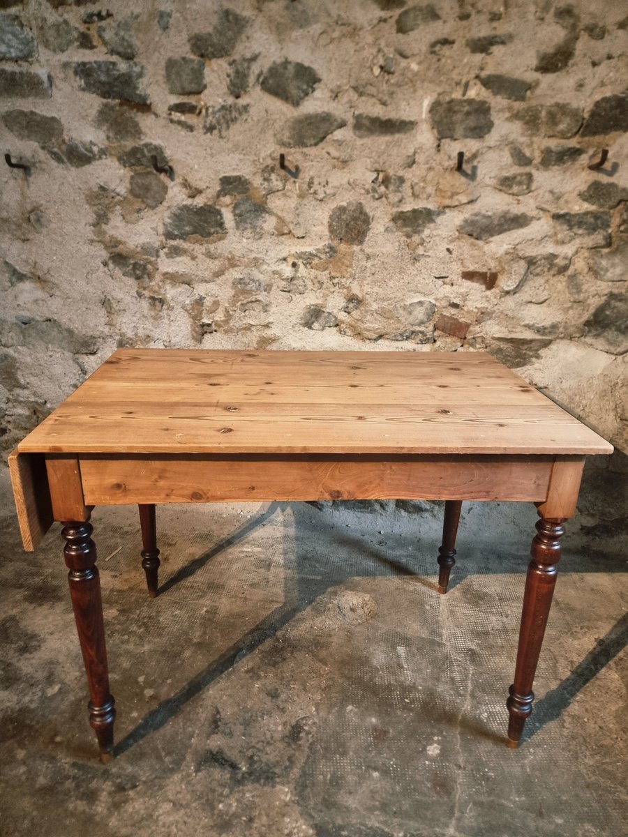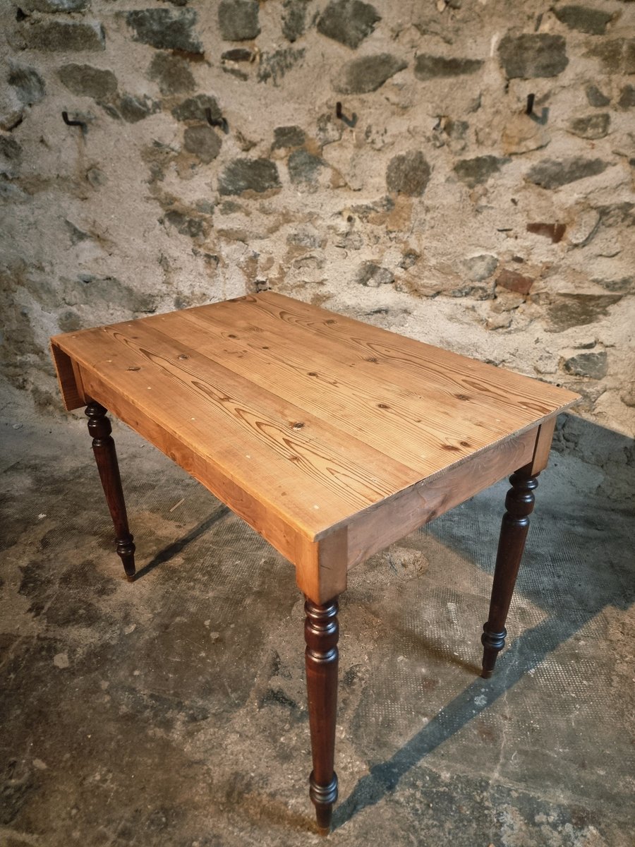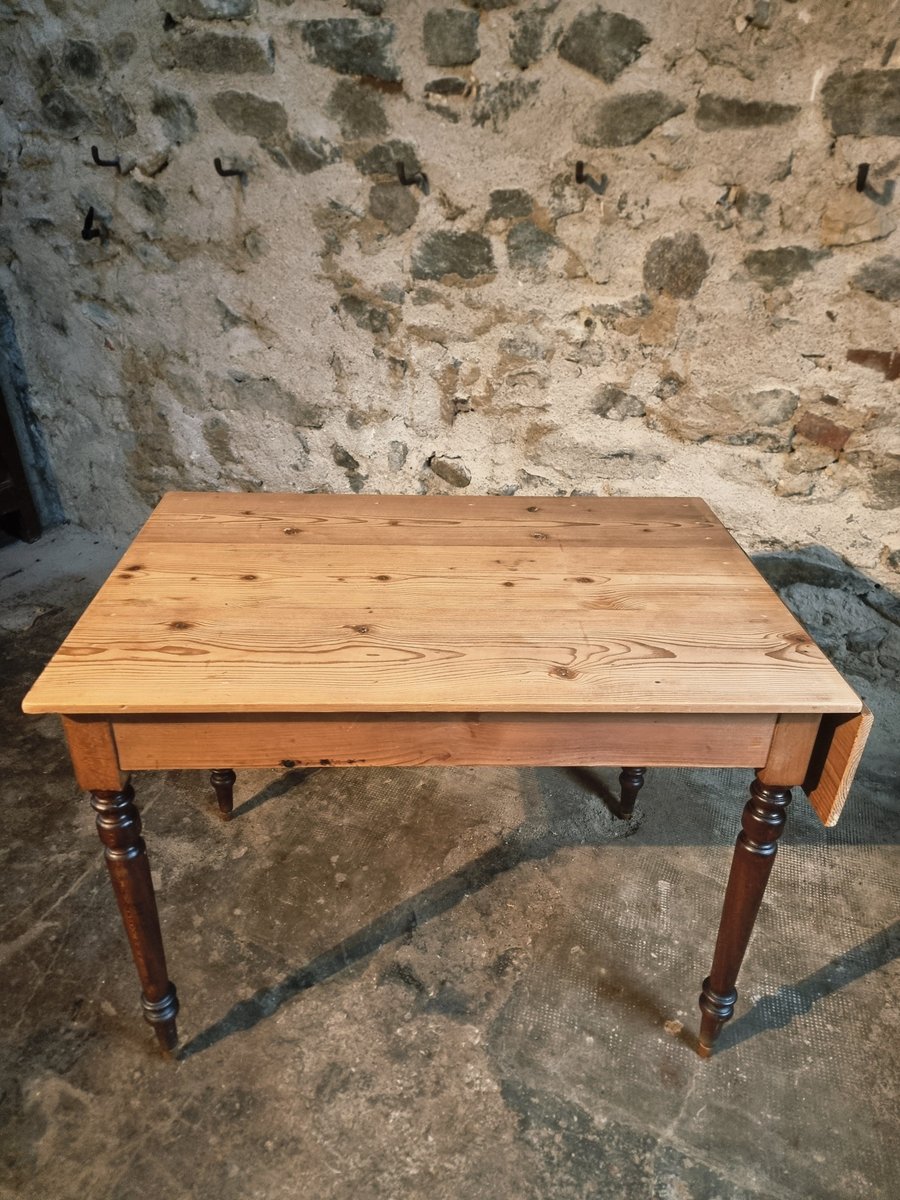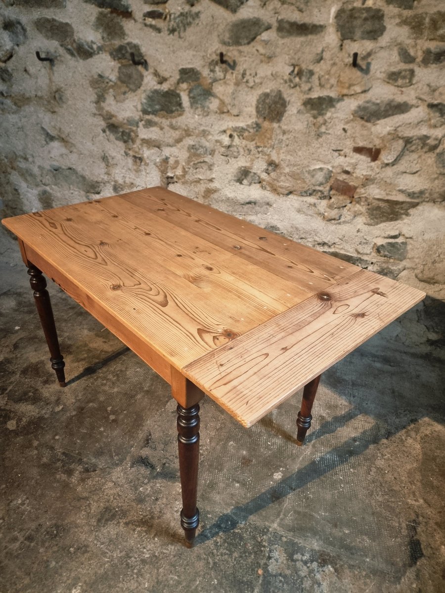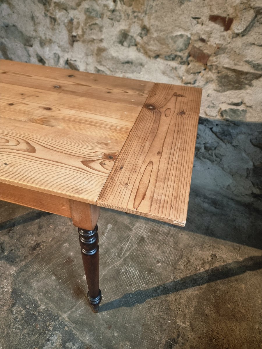 Esta mesa de época procede de la región de Vichy y data de alrededor de 1930. Presenta un tablero de pino macizo combinado con patas torneadas de haya. Un lado corto de la mesa puede ampliarse mediante una hoja abatible, lo que la convierte en una pieza práctica para utilizar como mesa de cocina, escritorio o mesa de comedor compacta.