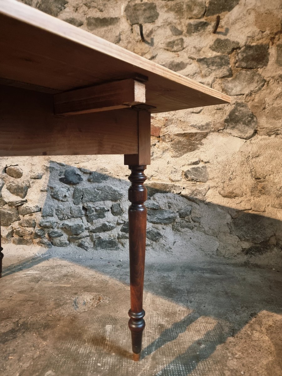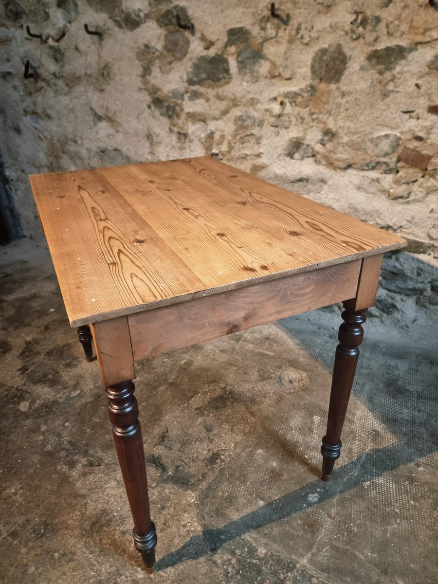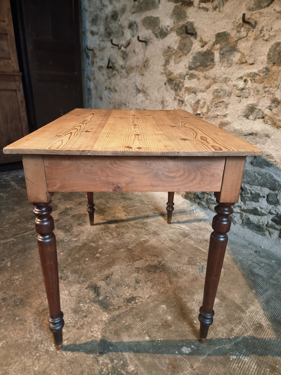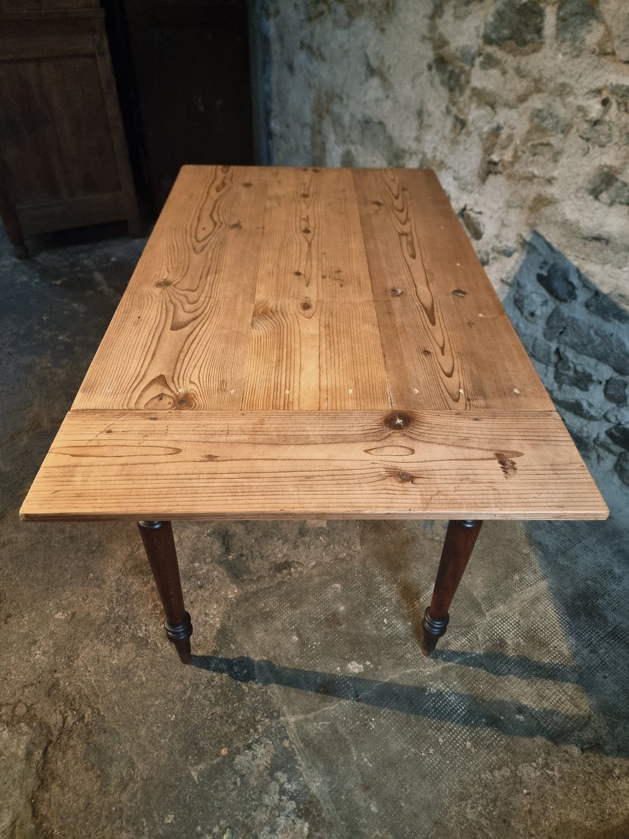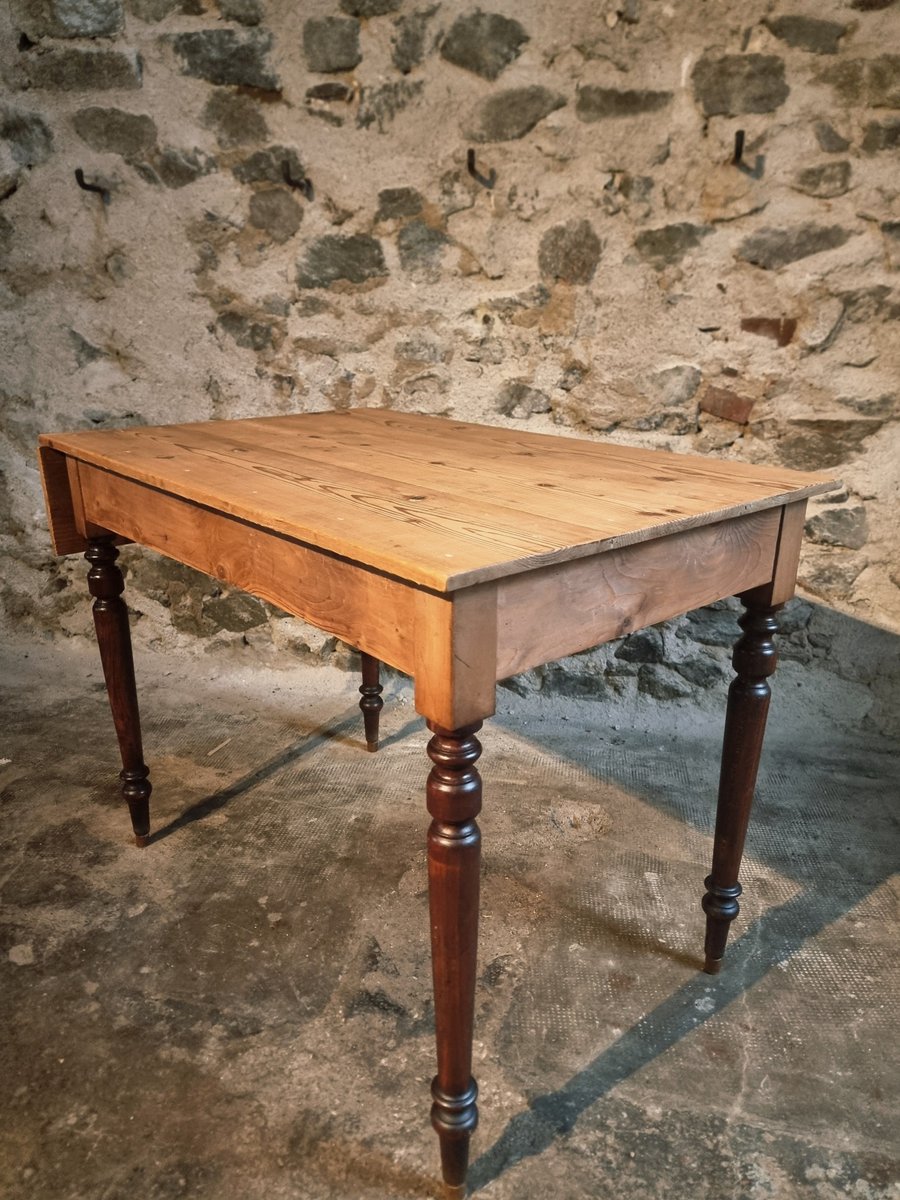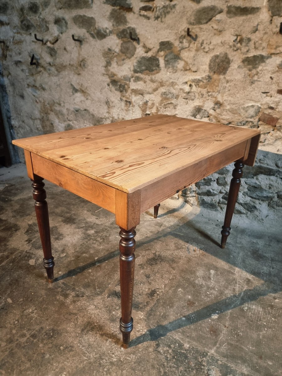 Esta mesa de época procede de la región de Vichy y data de alrededor de 1930. Presenta un tablero de pino macizo combinado con patas torneadas de haya. Un lado corto de la mesa puede ampliarse mediante una hoja abatible, lo que la convierte en una pieza práctica para utilizar como mesa de cocina, escritorio o mesa de comedor compacta.