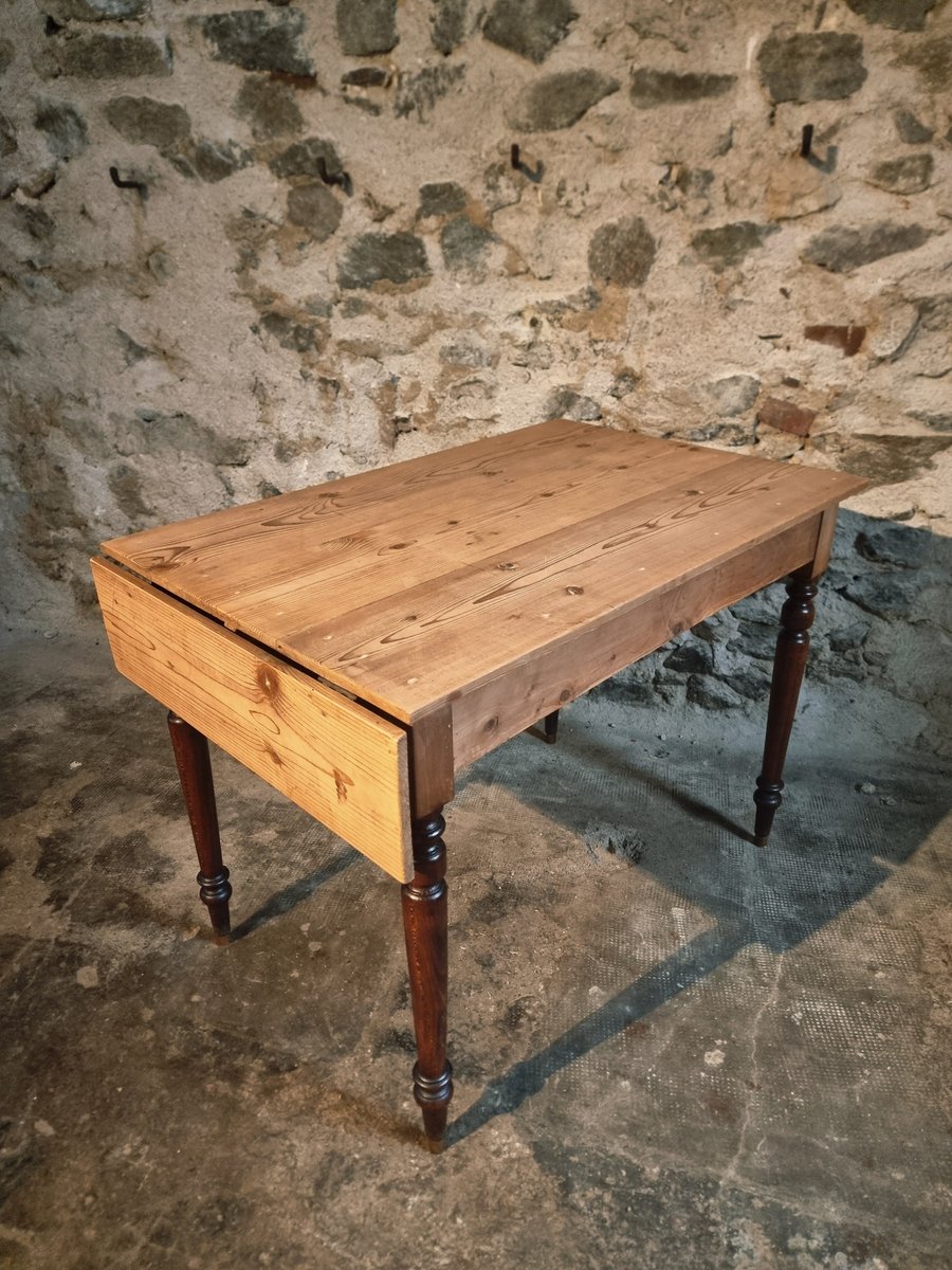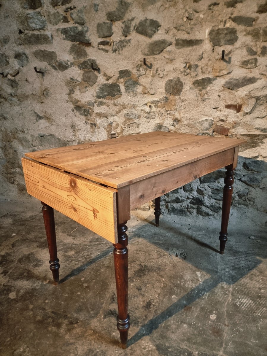 This vintage table originates from the Vichy region and dates from around 1930. It features a solid pine tabletop combined with beech turned legs. One short side of the table can be extended using a hinged leaf, making it a practical piece for use as a kitchen table, writing desk, or compact dining table.