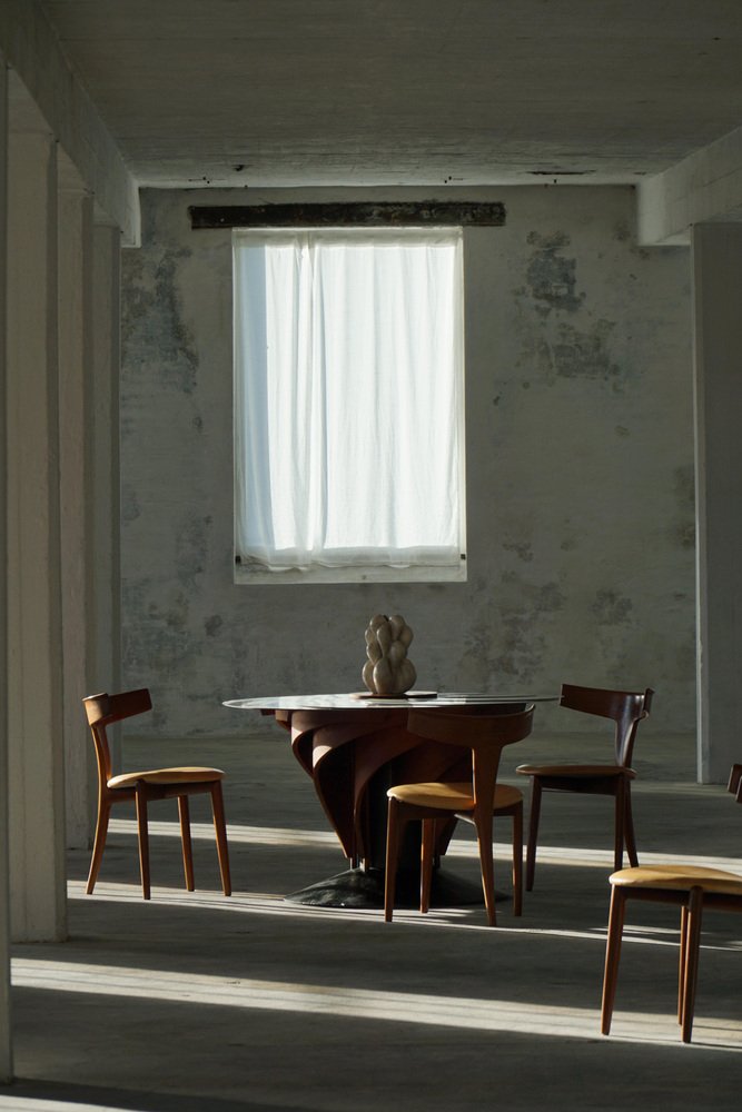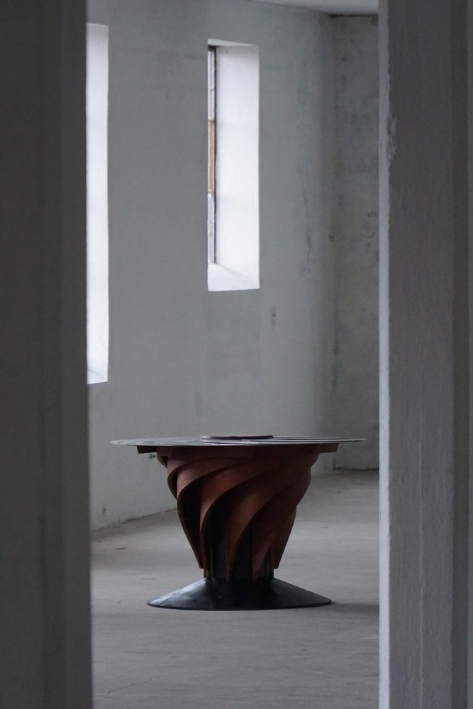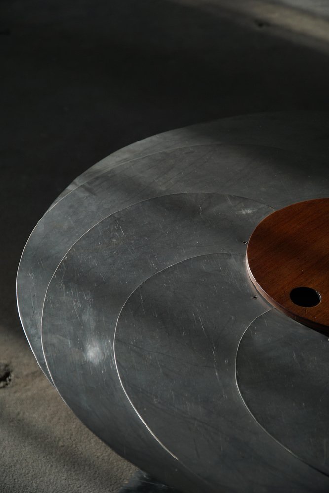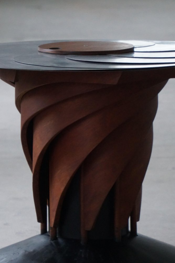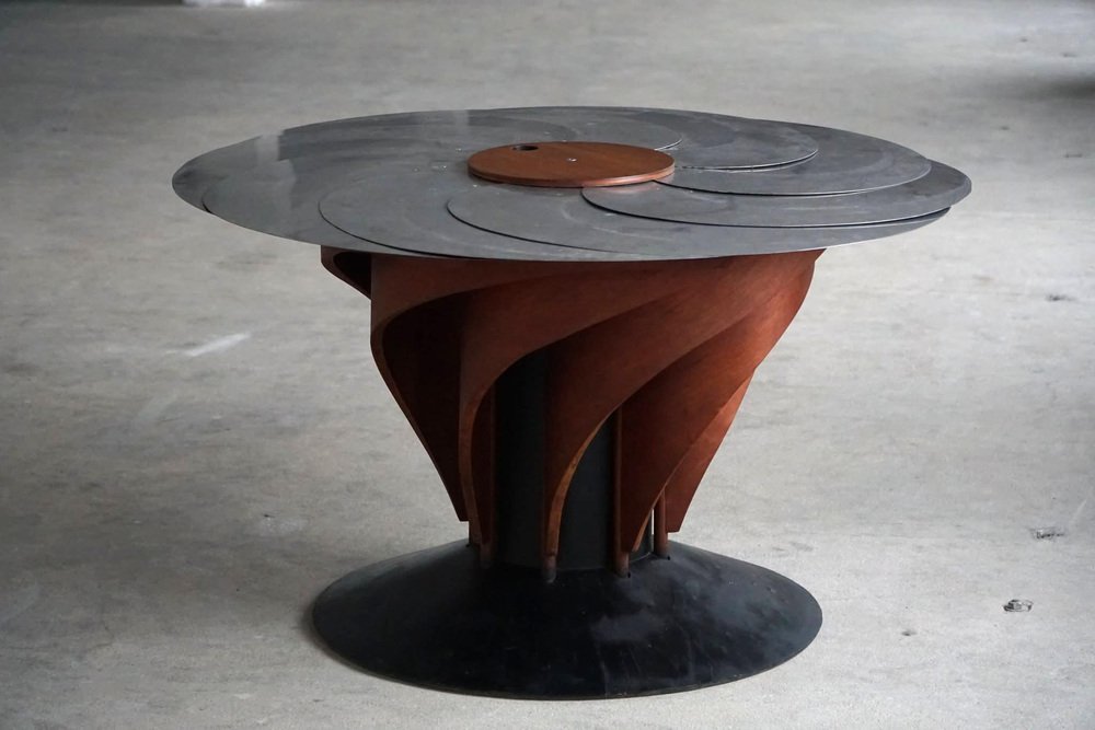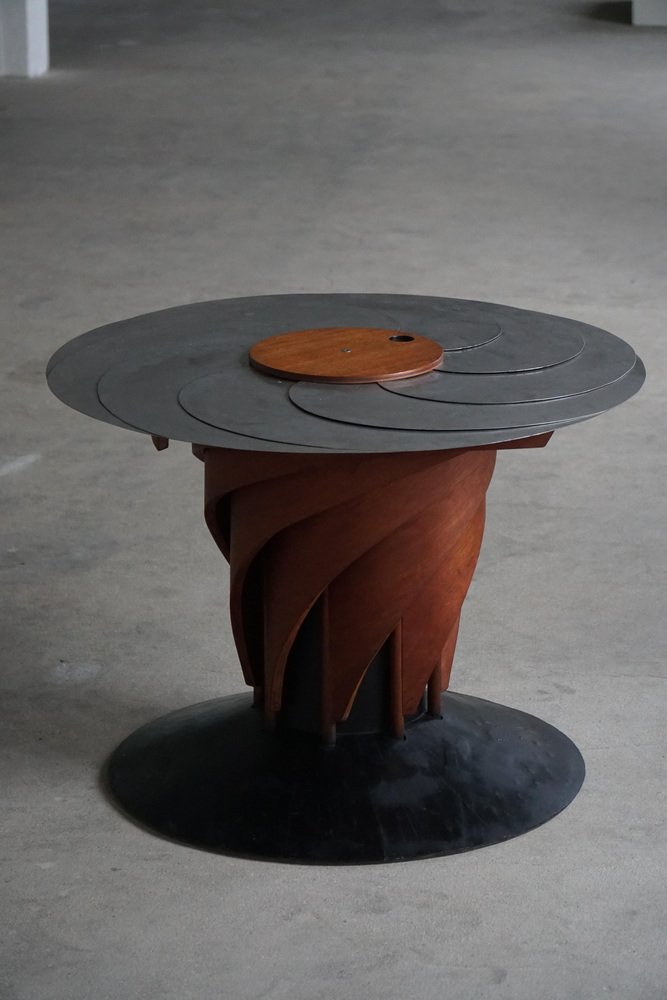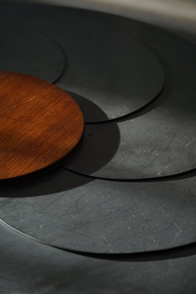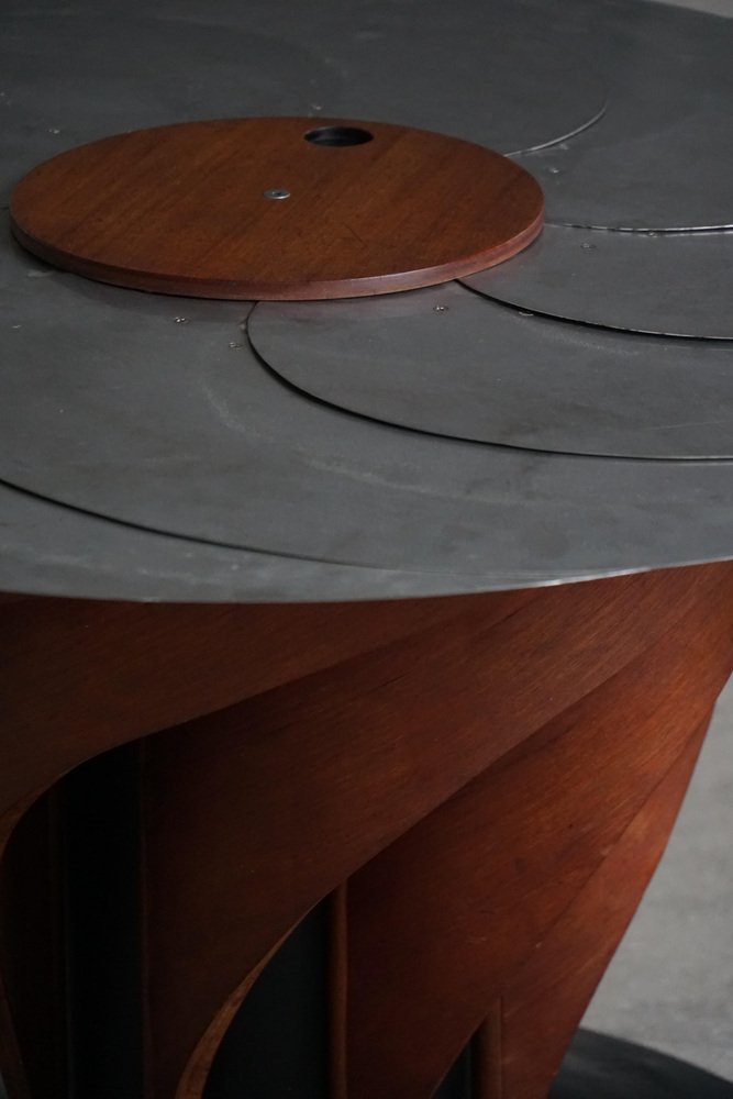 A sculptural and technically sophisticated dining table designed and crafted by Danish designer Nils-Ole Zib in 1990. The model, titled “Iris”, exemplifies Zib’s unique fusion of artistry and engineering. The table features a mahogany frame with black lacquered accents, supporting an adjustable circular top in brushed stainless steel. The tabletop expands seamlessly from 98 to 140 cm in diameter through a continuous, stepless mechanism controlled by a central wooden wheel — a masterful piece of mechanical design rendered as functional sculpture. Both elegant and avant-garde, the “Iris” table embodies the late 20th-century Scandinavian approach to form and innovation — minimalist, material-conscious, and deeply crafted. This beautiful table will complement many interior styles. Such as a Classic, Scandinavian, Modern or Art Deco home decor.