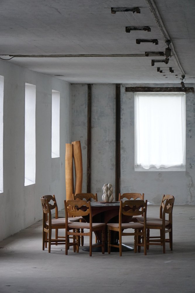 Una mesa de comedor escultural y técnicamente sofisticada diseñada y fabricada por el diseñador danés Nils-Ole Zib en 1990. El modelo, titulado "Iris", ejemplifica la fusión única de arte e ingeniería de Zib. La mesa tiene un armazón de caoba lacado en negro que sostiene un tablero circular ajustable de acero inoxidable cepillado. El tablero se amplía de 98 a 140 cm de diámetro mediante un mecanismo continuo controlado por una rueda central de madera: una obra maestra del diseño mecánico convertida en escultura funcional. Elegante y vanguardista a la vez, la mesa "Iris" encarna el enfoque escandinavo de finales del siglo XX de la forma y la innovación: minimalista, consciente de los materiales y profundamente artesanal. Esta hermosa mesa complementará muchos estilos de interior. Por ejemplo, una decoración clásica, escandinava, moderna o Art Déco.
