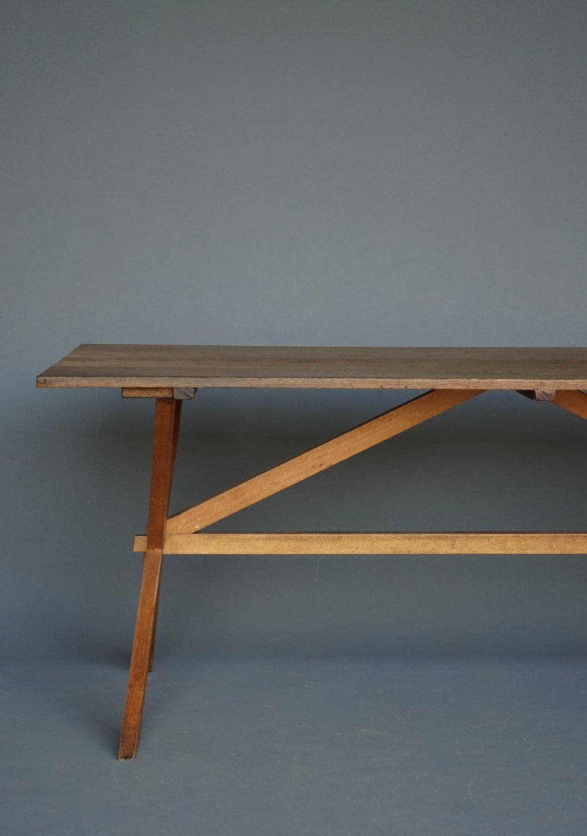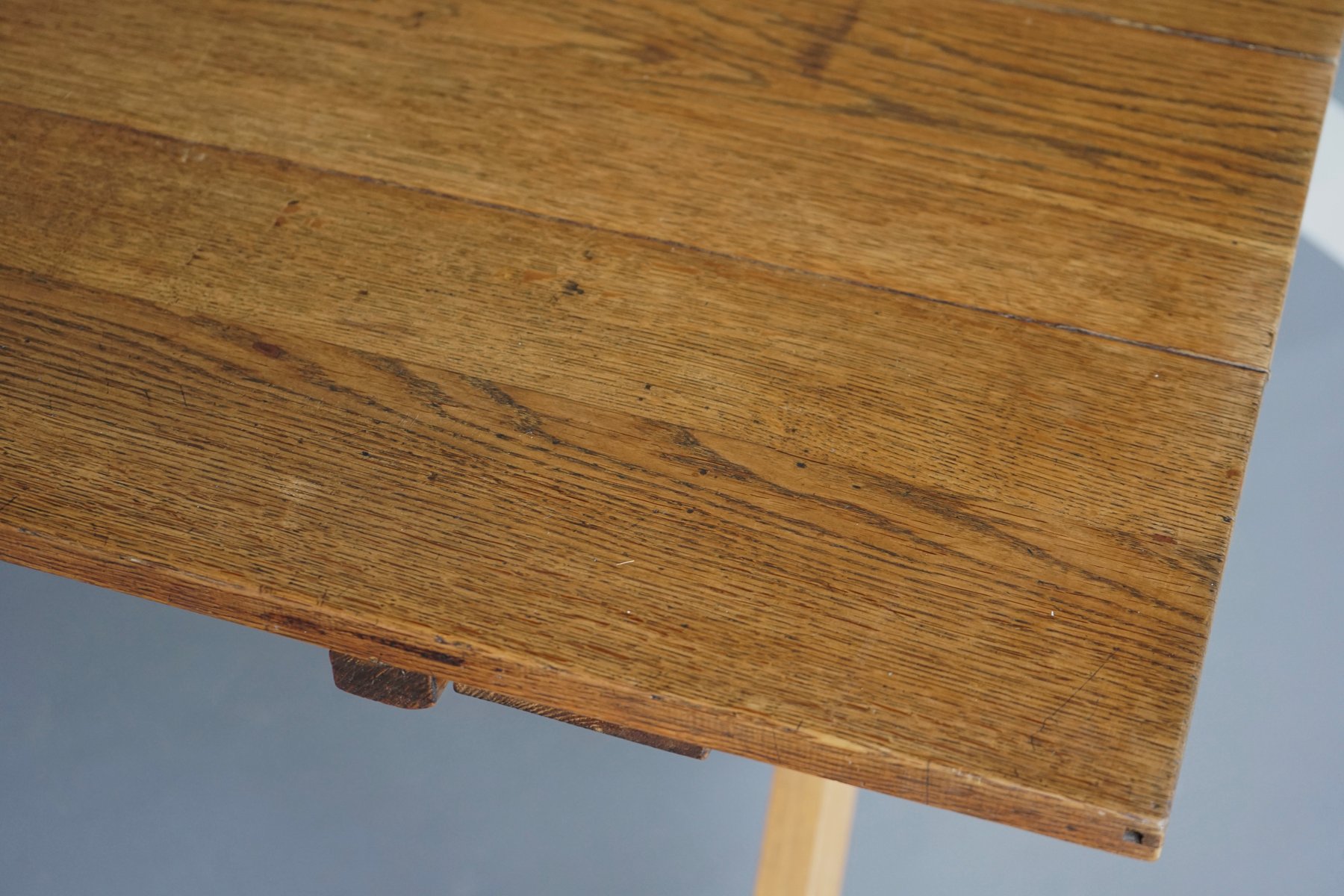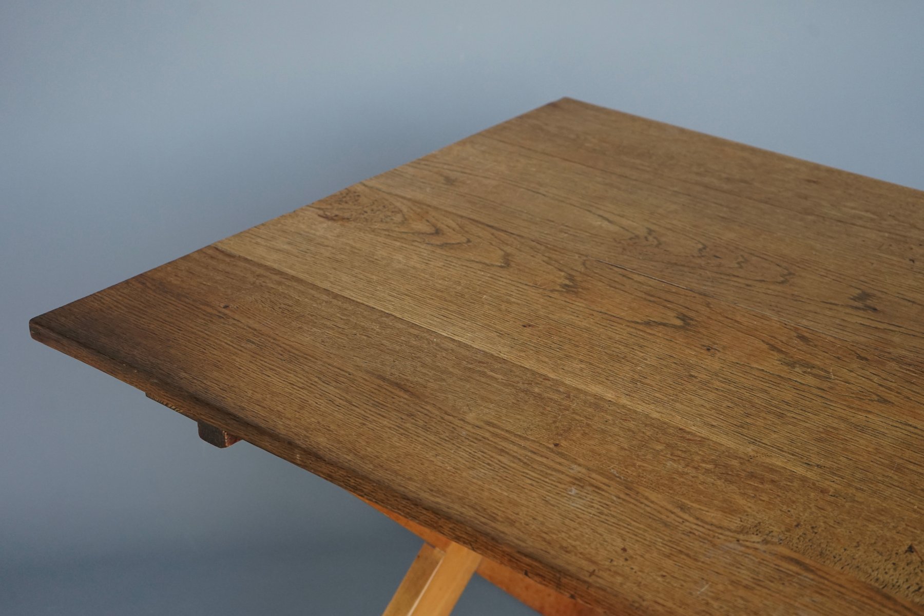 Mesa de comedor de granja rústica de cerezo y roble, años 40