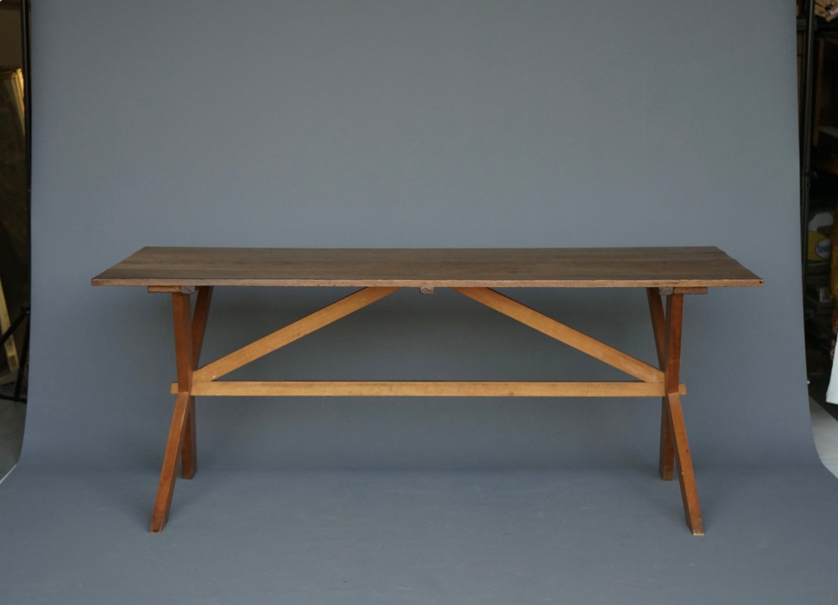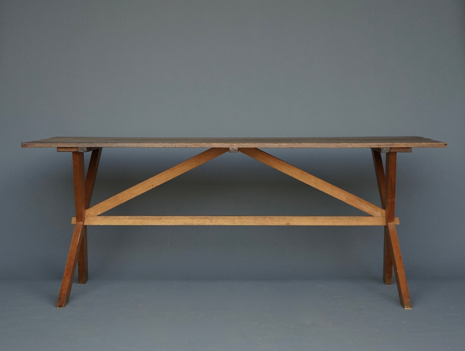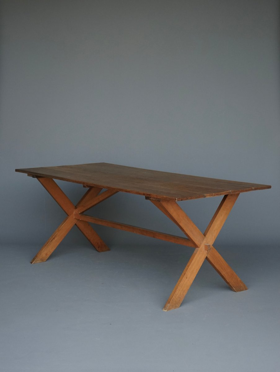 Mesa de comedor de granja rústica de cerezo y roble, años 40