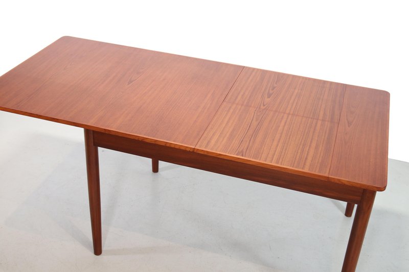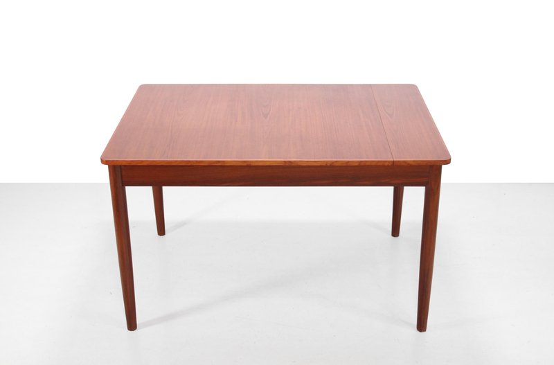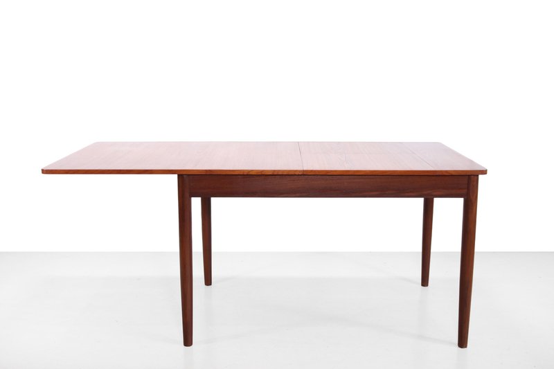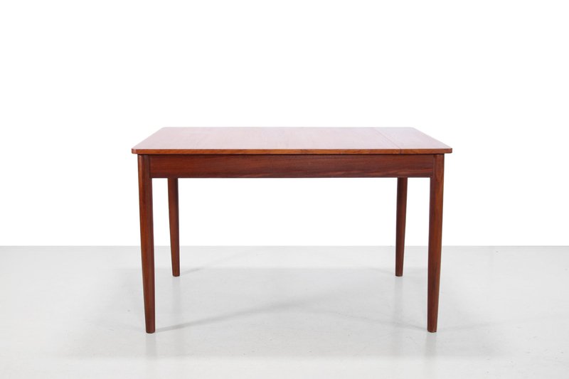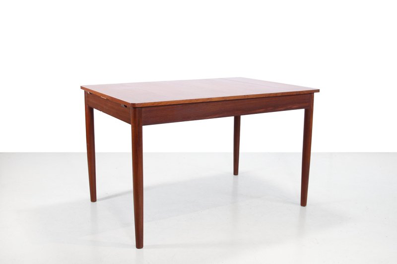 Beautiful extendable dining table from the Dutch manufacturer Topform from the 1960s. Designed with the typical "Dutch extension," a way to extend the table without having to store separate tabletops elsewhere. The table slides apart with a simple action, and an extra piece of tabletop can be easily folded out, extending the table by 50 cm in an instant. Perfect for a space-constrained room, but occasionally need to accommodate six people. The table is 120 cm long, 75 cm wide, and 75 cm high. When extended, the table measures a total of 170 cm.