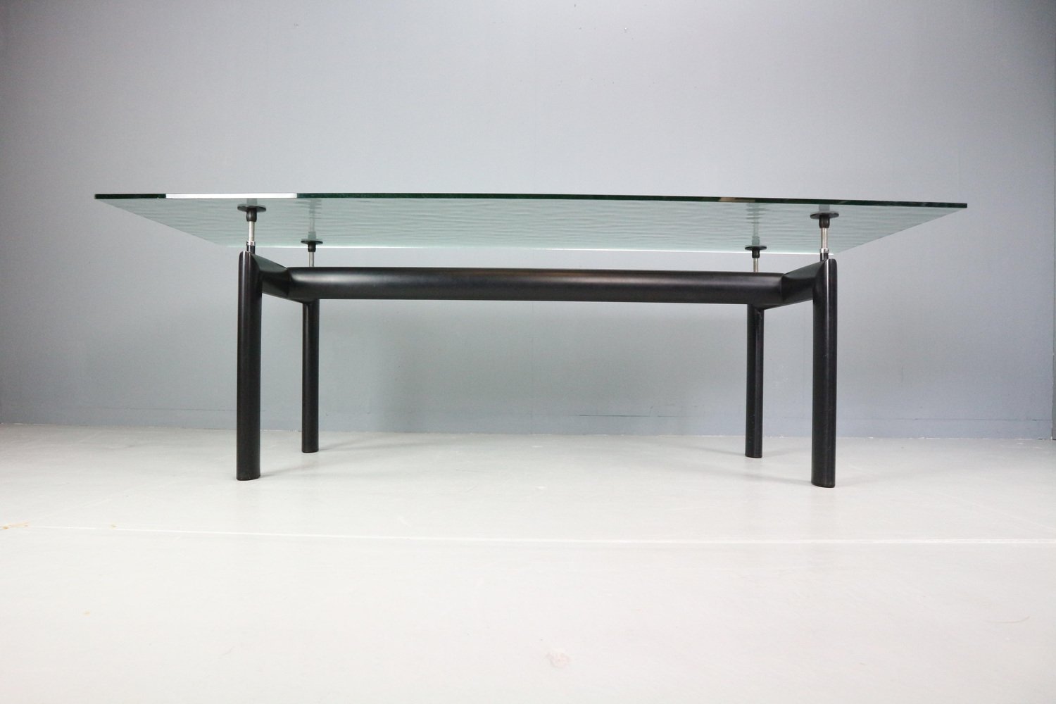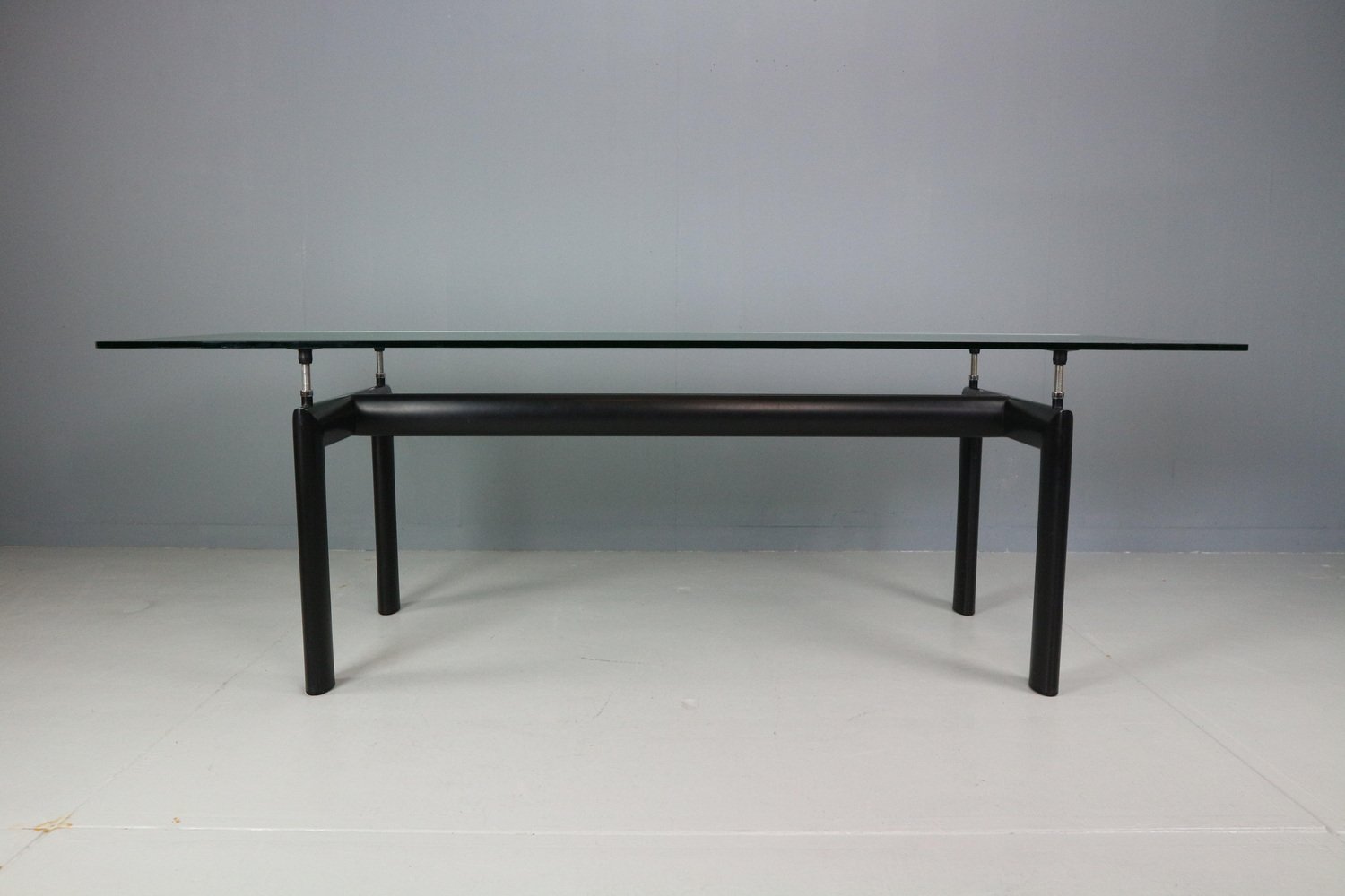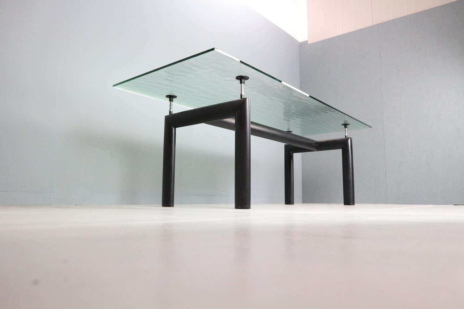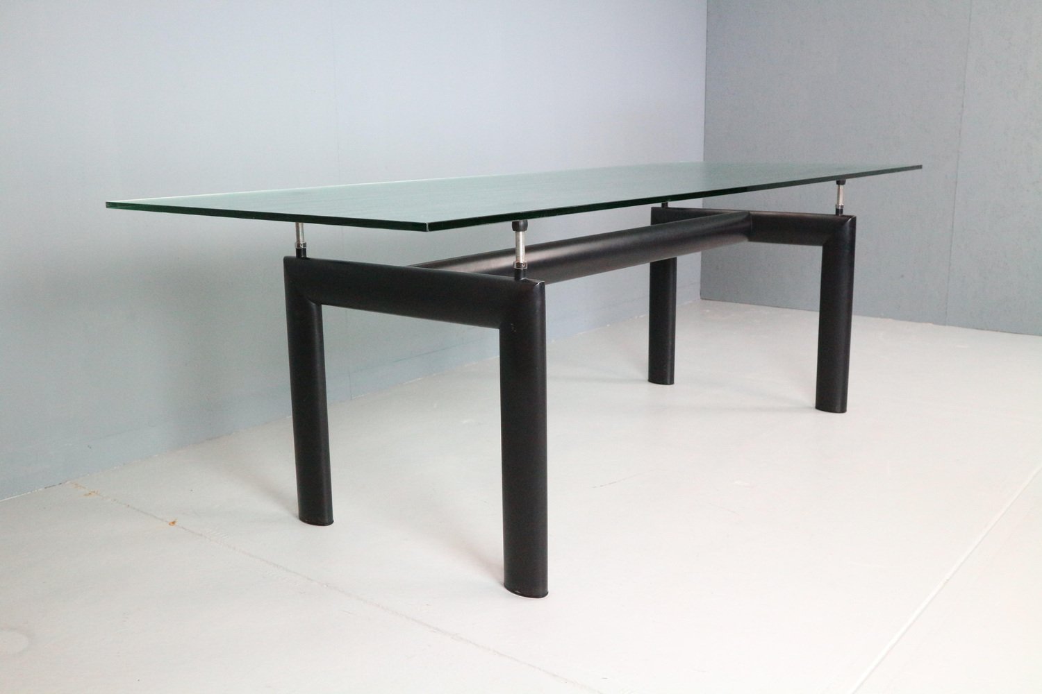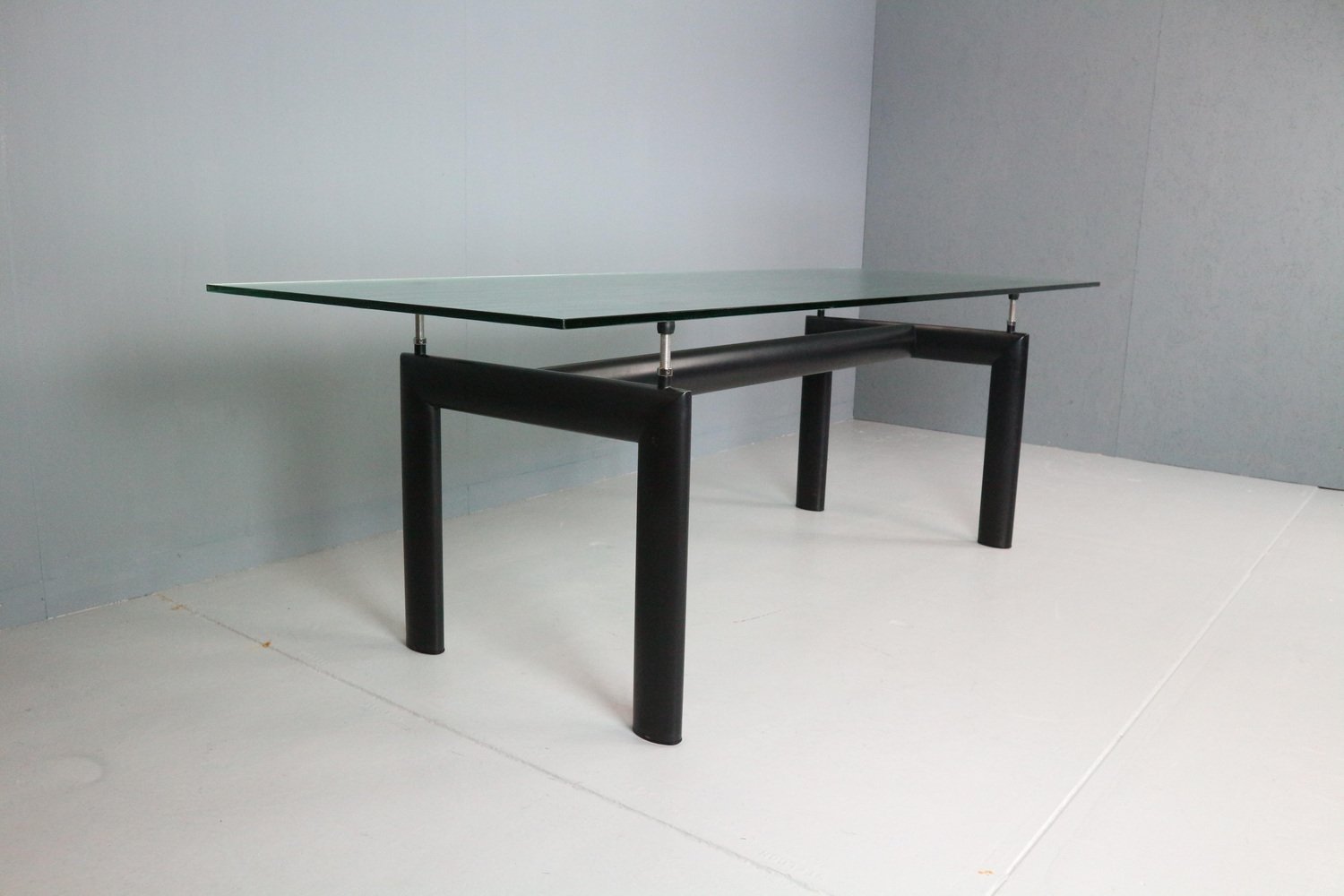 La idea que inspira la mesa LC6, presentada en el Salón de Otoño de París de 1929, reside en la distinción entre el soporte y lo que soporta, es decir, la base y el tablero. Las cuatro estructuras intermedias subrayan la separación entre ambas partes. Éstas regulan la altura y sirven para mantener la debida distancia entre la pesada base y las delicadas líneas del tablero. La base se diseñó en 1928, inspirándose en los perfiles ovalados utilizados en el diseño aeronáutico para mantener la distancia entre las alas de los biplanos. Esta mesa tiene una base de acero pintado en negro y un tablero de cristal texturado. La tapa de cristal tiene una pequeña grieta, que se ve pero no se siente. La mesa está firmada originalmente. Hermosa paz de diseño moderno de mediados de siglo.