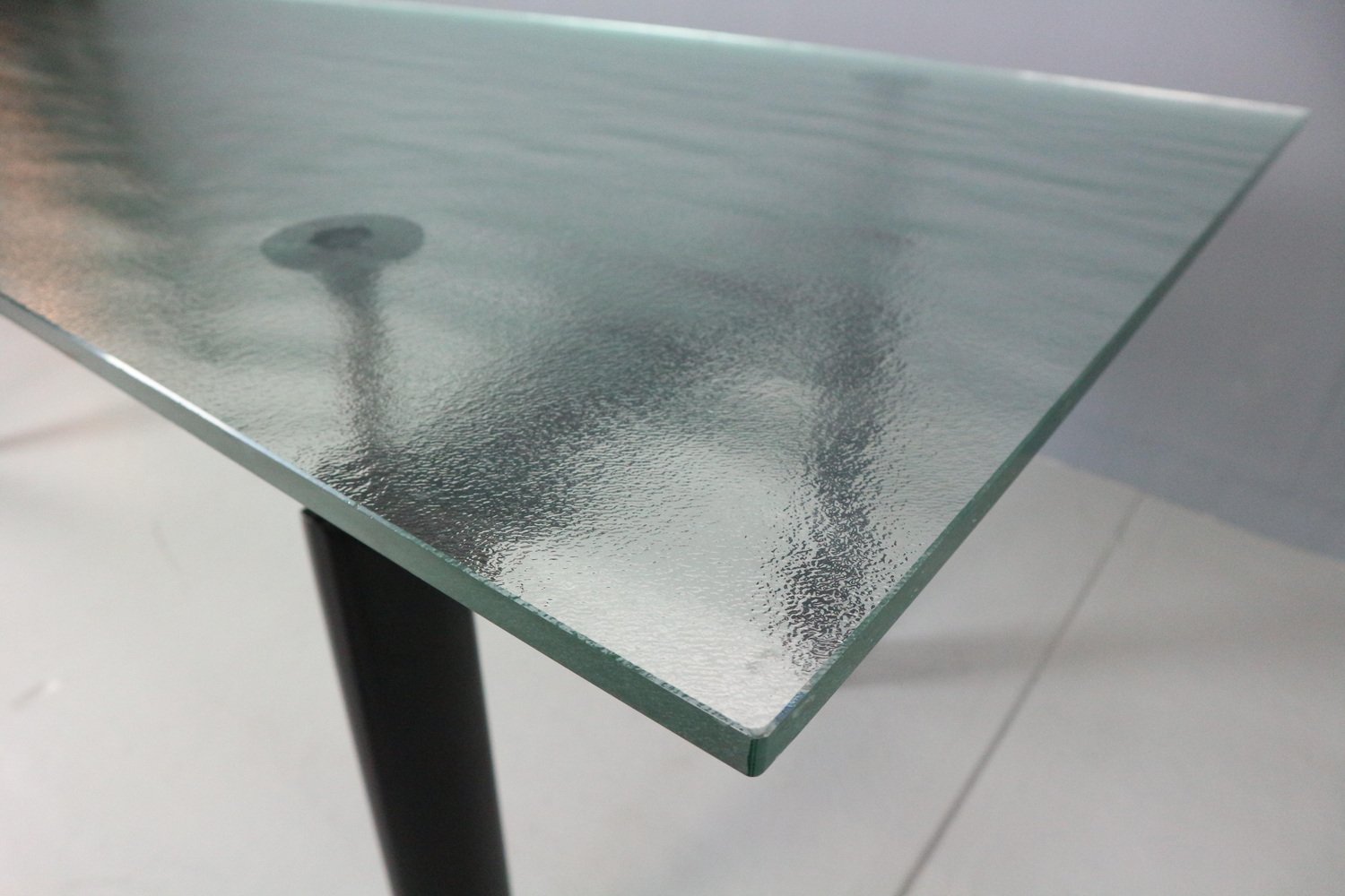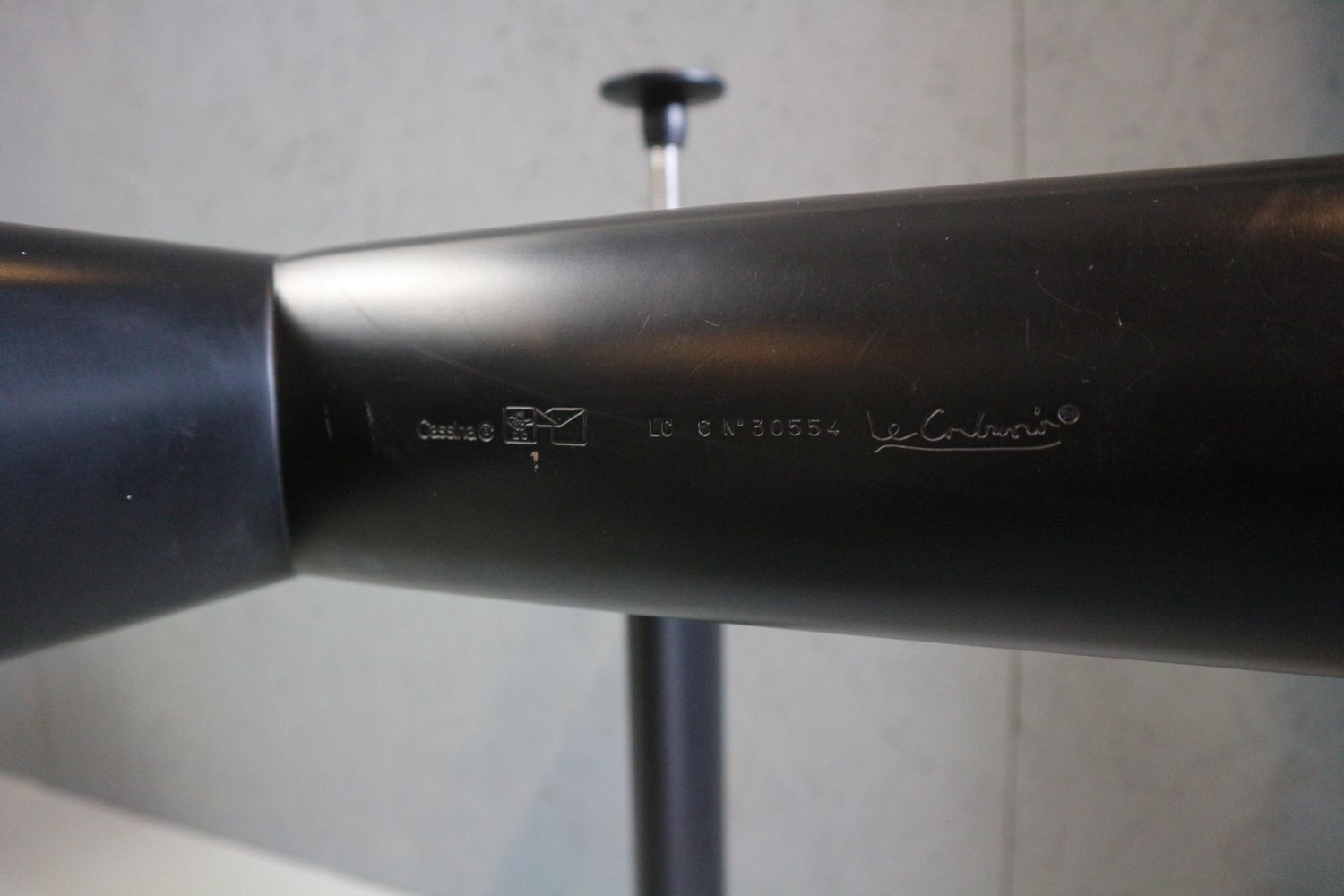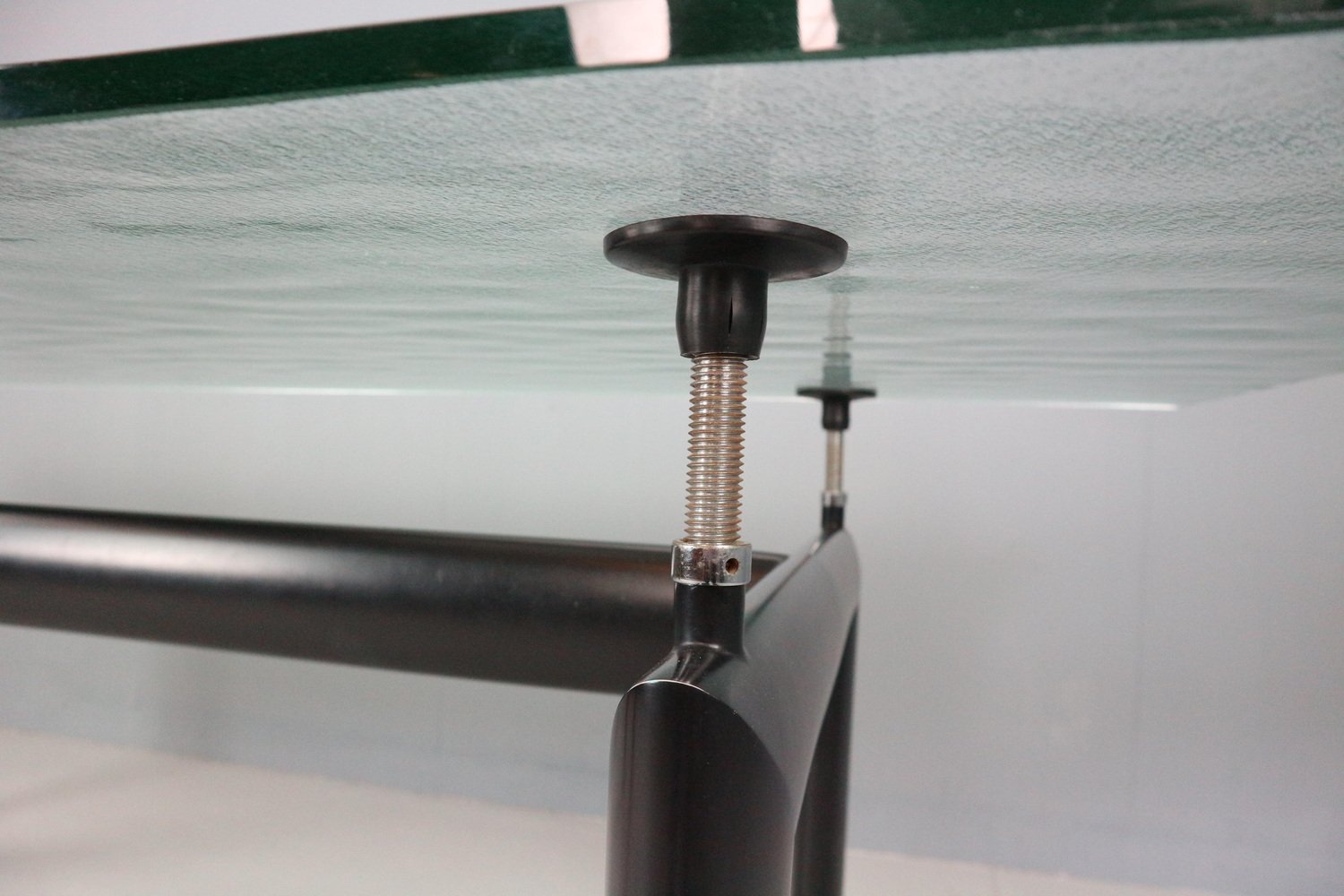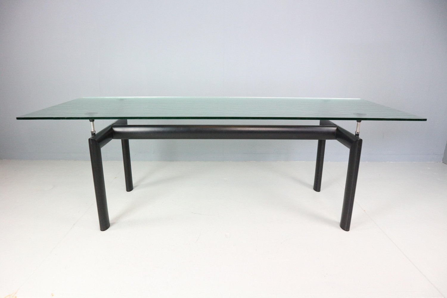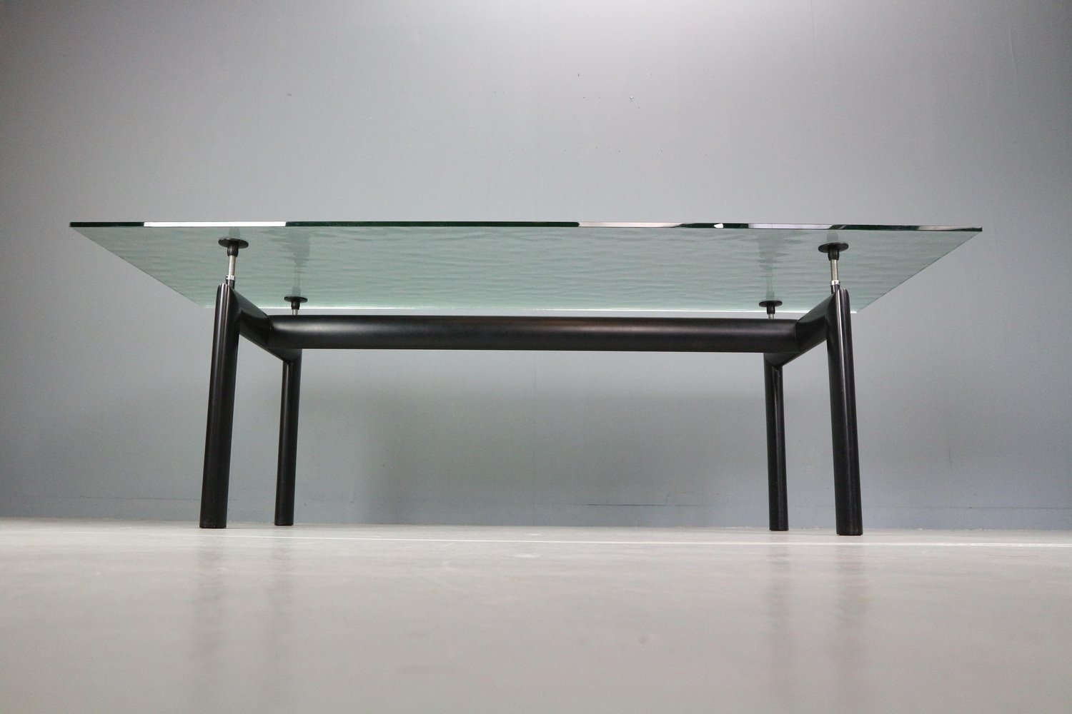 La idea que inspira la mesa LC6, presentada en el Salón de Otoño de París de 1929, reside en la distinción entre el soporte y lo que soporta, es decir, la base y el tablero. Las cuatro estructuras intermedias subrayan la separación entre ambas partes. Éstas regulan la altura y sirven para mantener la debida distancia entre la pesada base y las delicadas líneas del tablero. La base se diseñó en 1928, inspirándose en los perfiles ovalados utilizados en el diseño aeronáutico para mantener la distancia entre las alas de los biplanos. Esta mesa tiene una base de acero pintado en negro y un tablero de cristal texturado. La tapa de cristal tiene una pequeña grieta, que se ve pero no se siente. La mesa está firmada originalmente. Hermosa paz de diseño moderno de mediados de siglo.