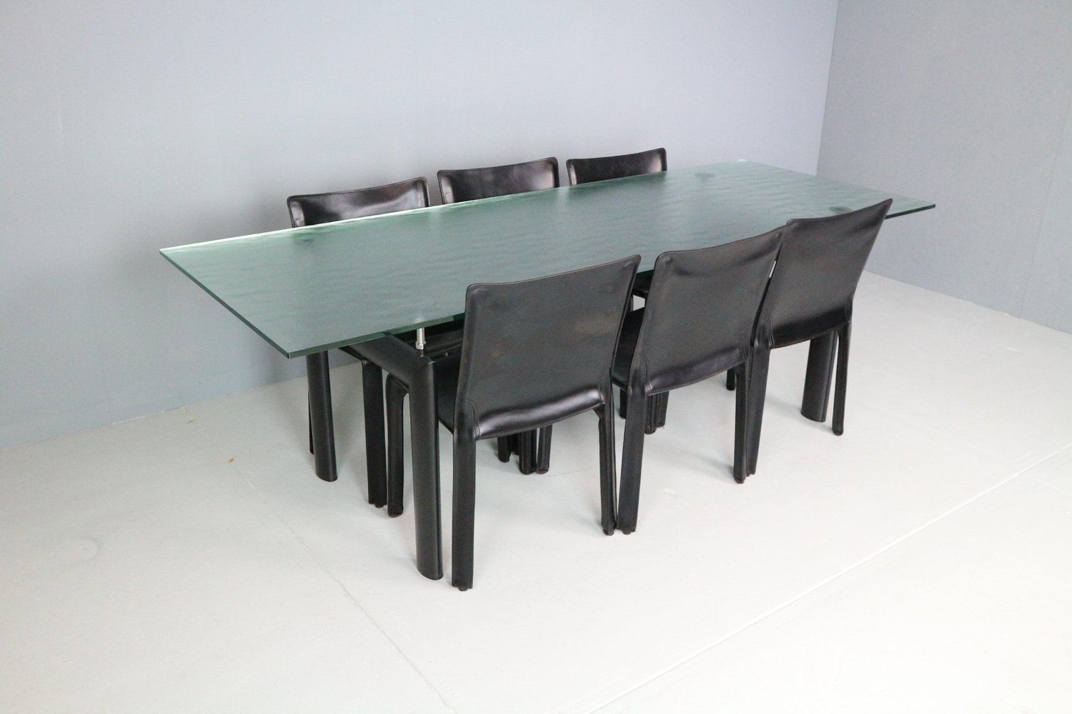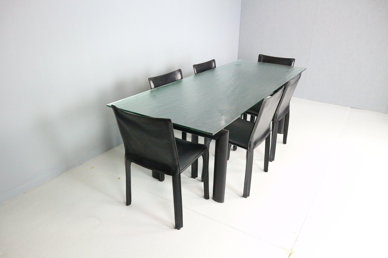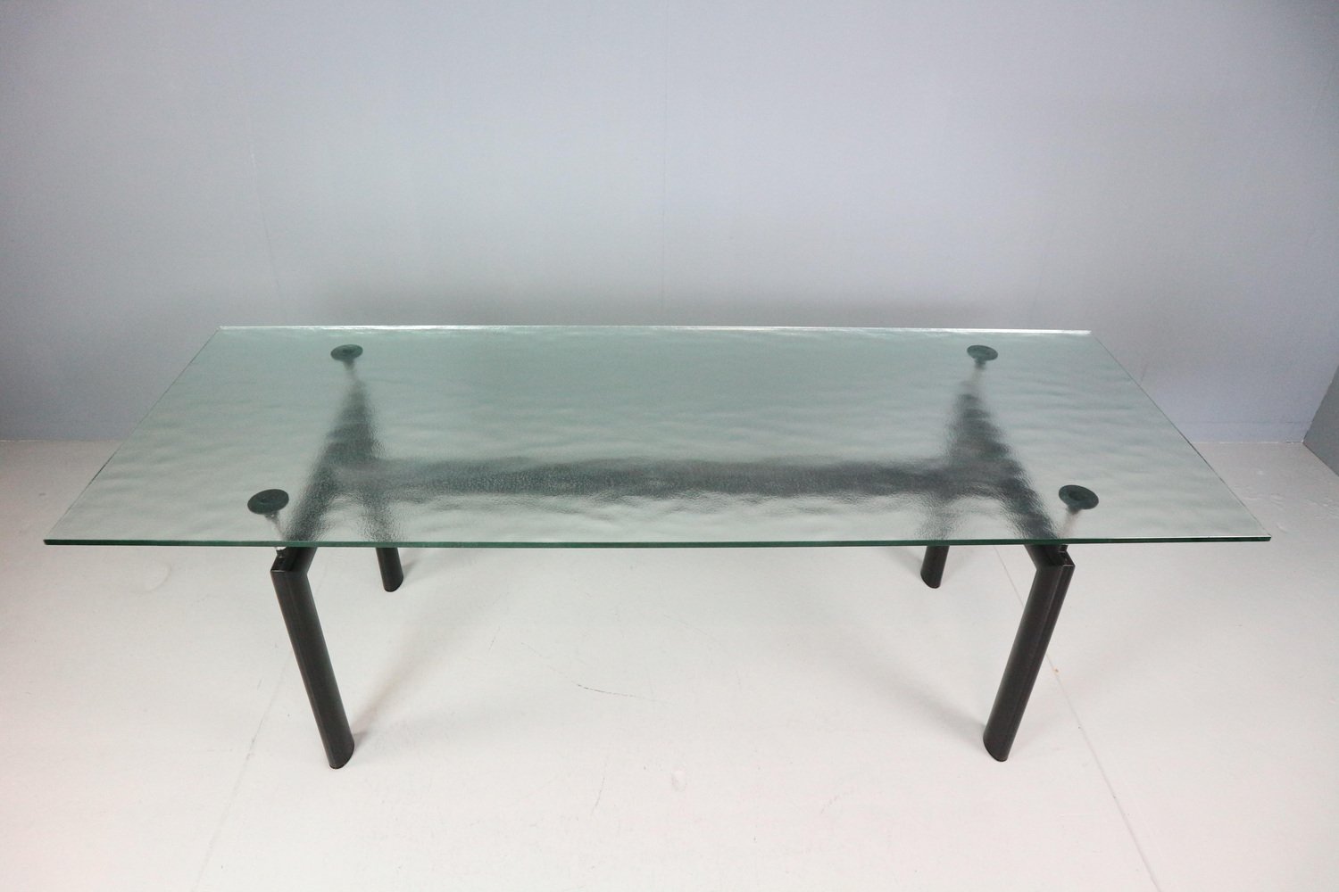 The idea informing the LC6 table, which was launched at the 1929 Salon d’Automne in Paris, lies in the distinction between the support and what is supported, in other words, the base and the table top. The separation of the two parts is highlighted by the four intermediate structures. These both regulate the height and serve to maintain the due distance between the heavy base and delicate lines of the table-top. The base was designed in 1928, taking its cue from the oval profiles used in aeronautical design to maintain the distance between the wings of biplanes. This table features a steel base painted in black and textured glass top. The glass top has a small crack, which you can see, but you can't feel it. The table is originally signed. Beautiful Mid-Century Modern design peace.