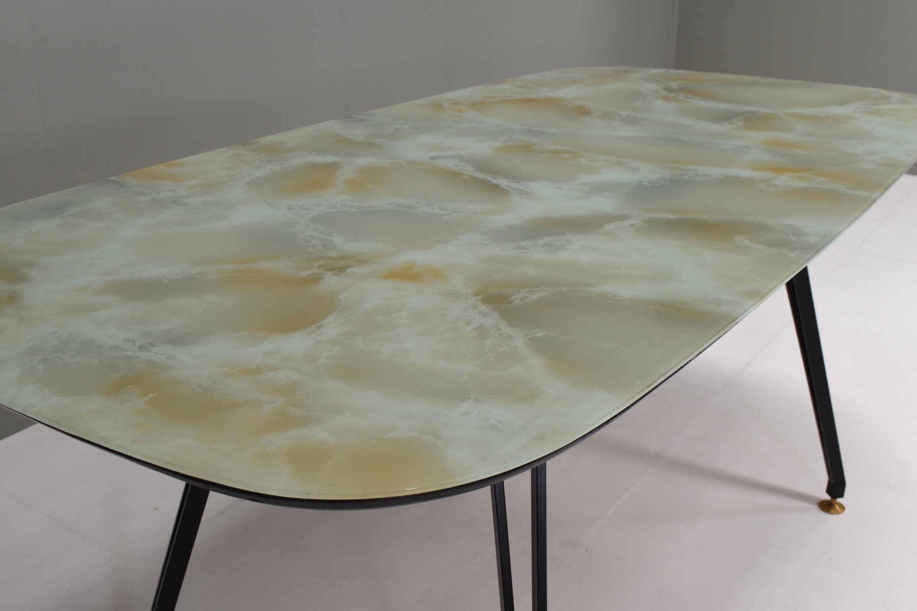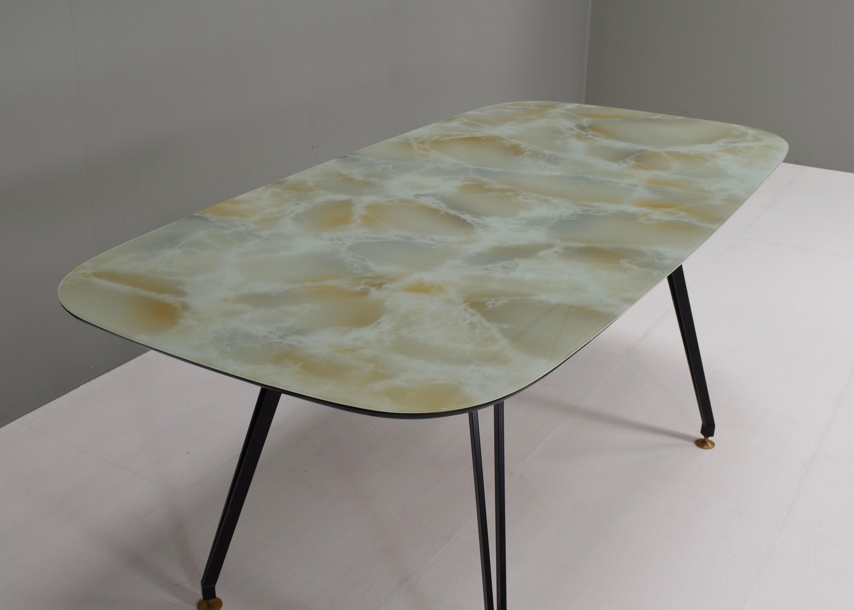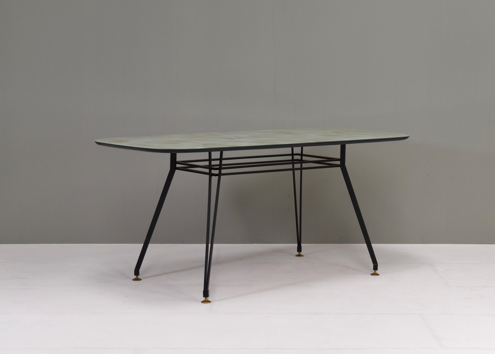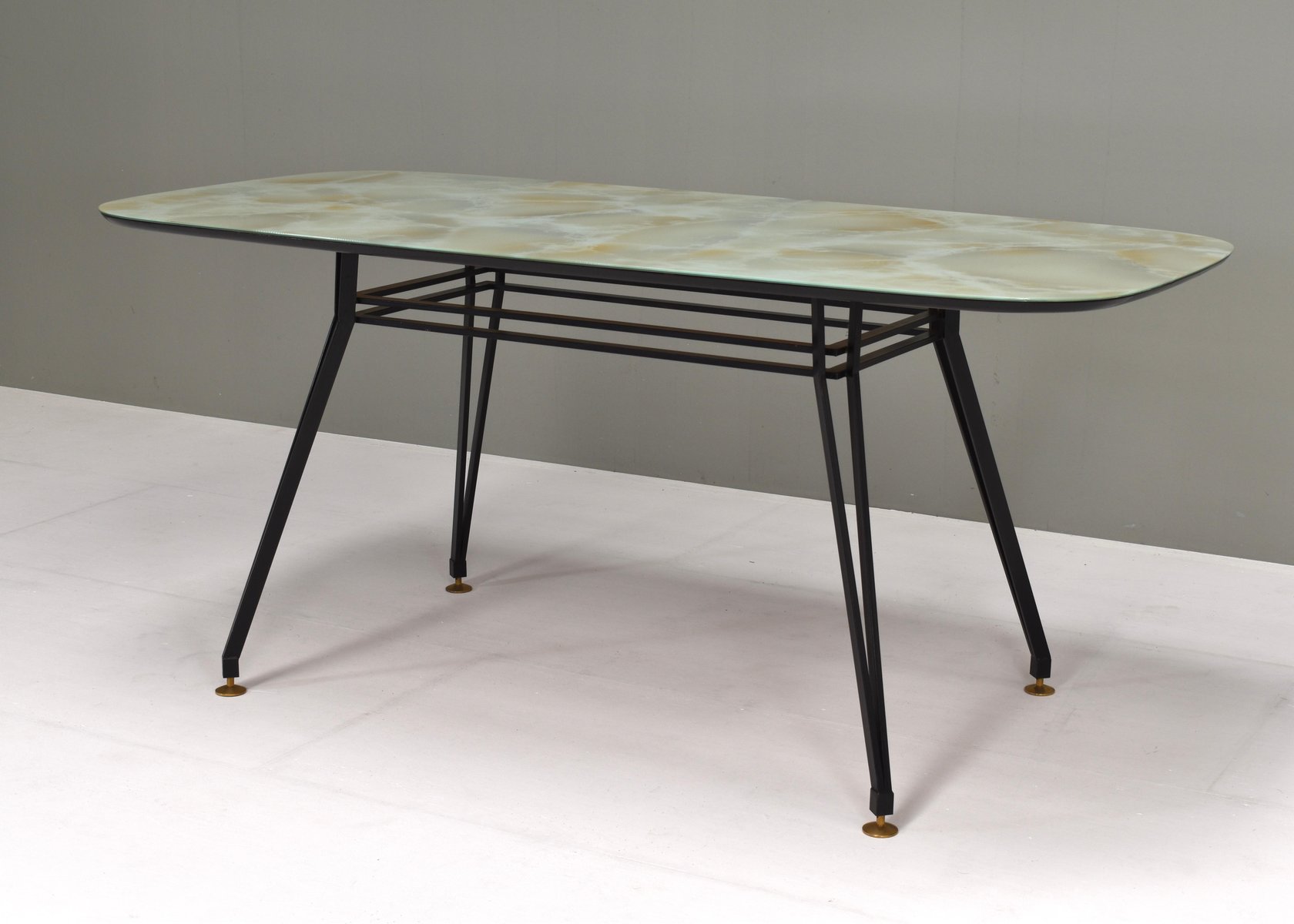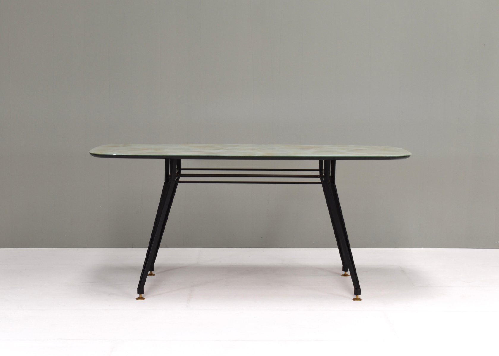 Mesa de comedor italiana con base de metal y tablero de vidrio y latón, años 50