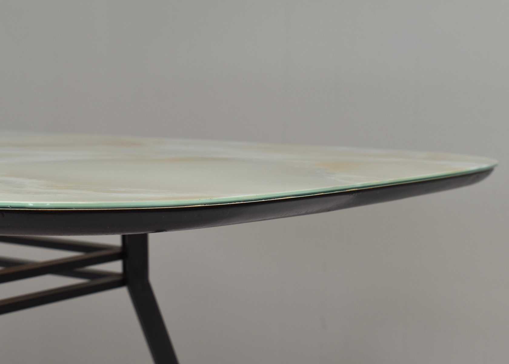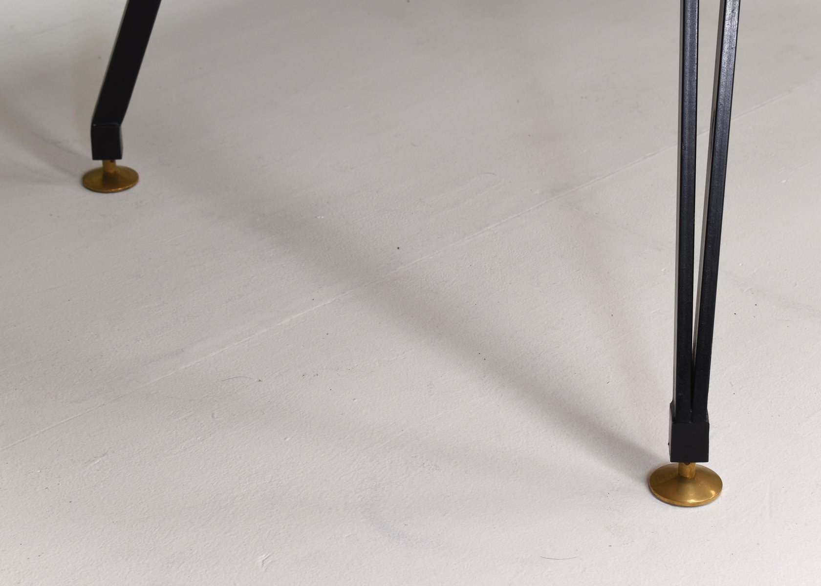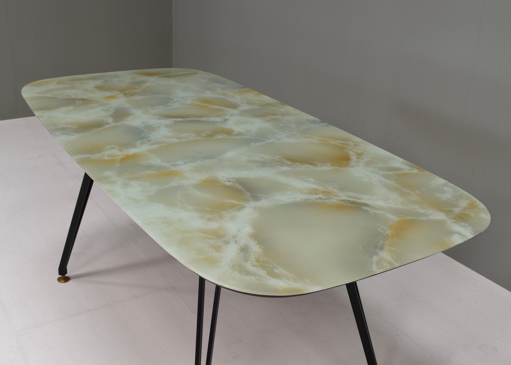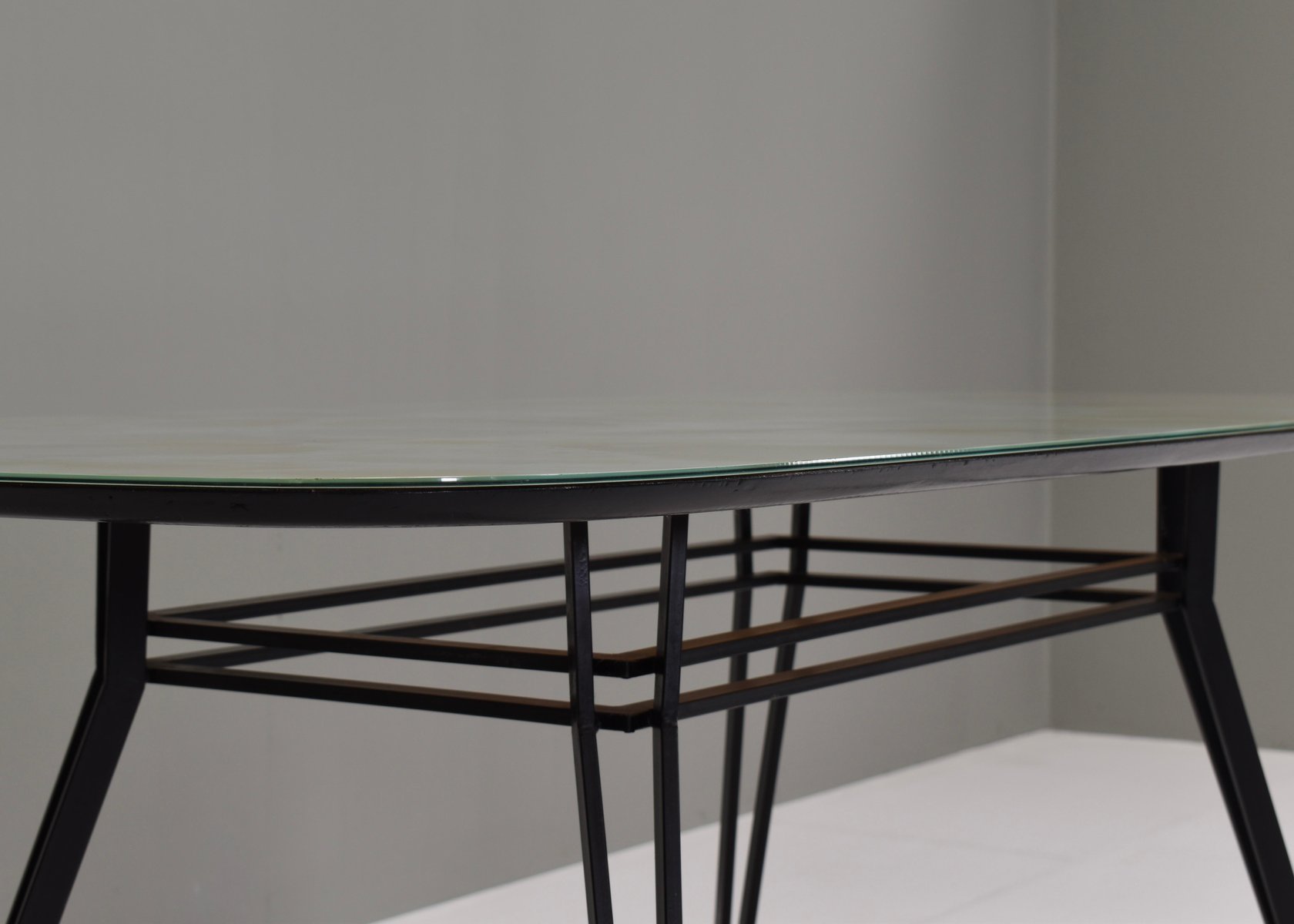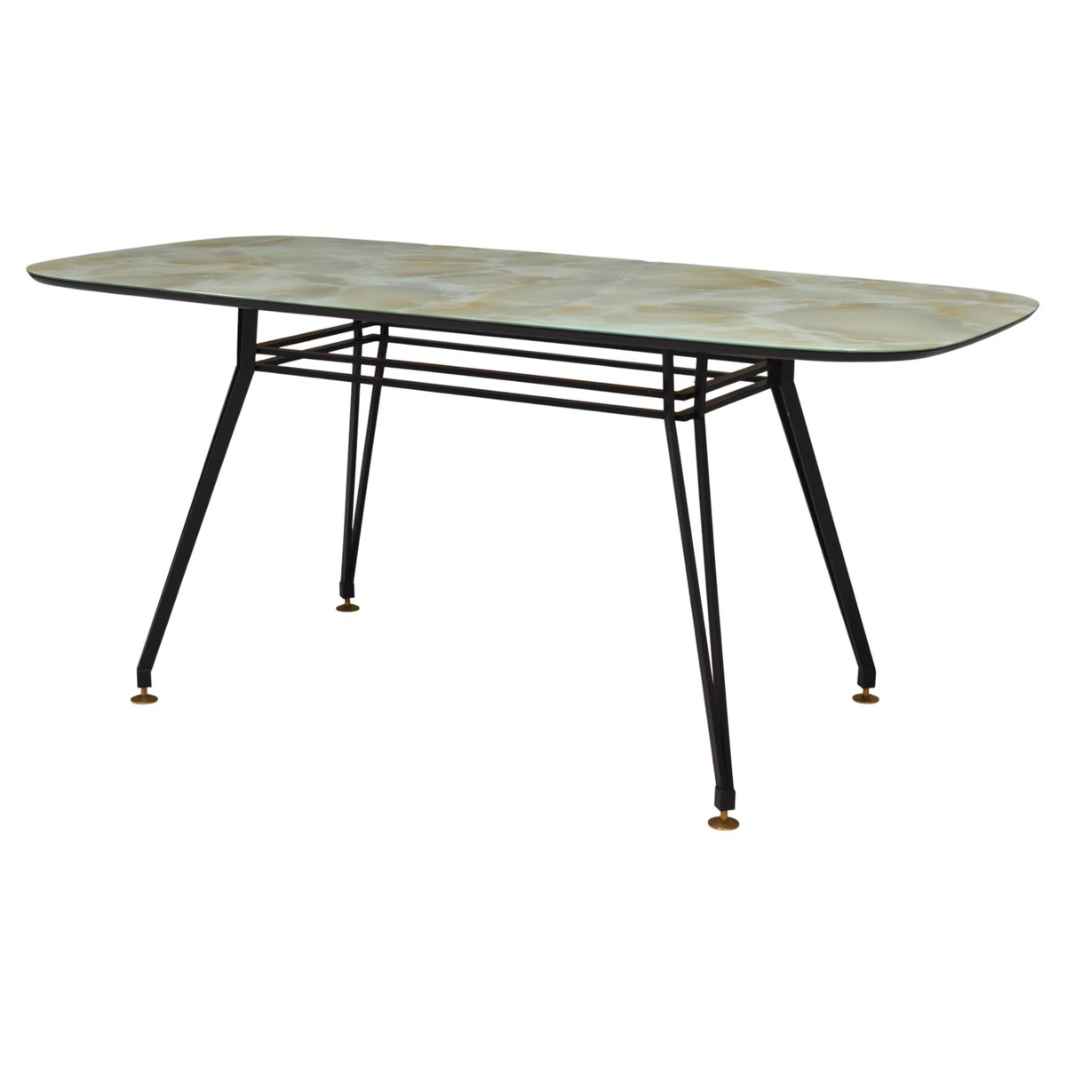 Mesa de comedor italiana con base de metal y tablero de vidrio y latón, años 50