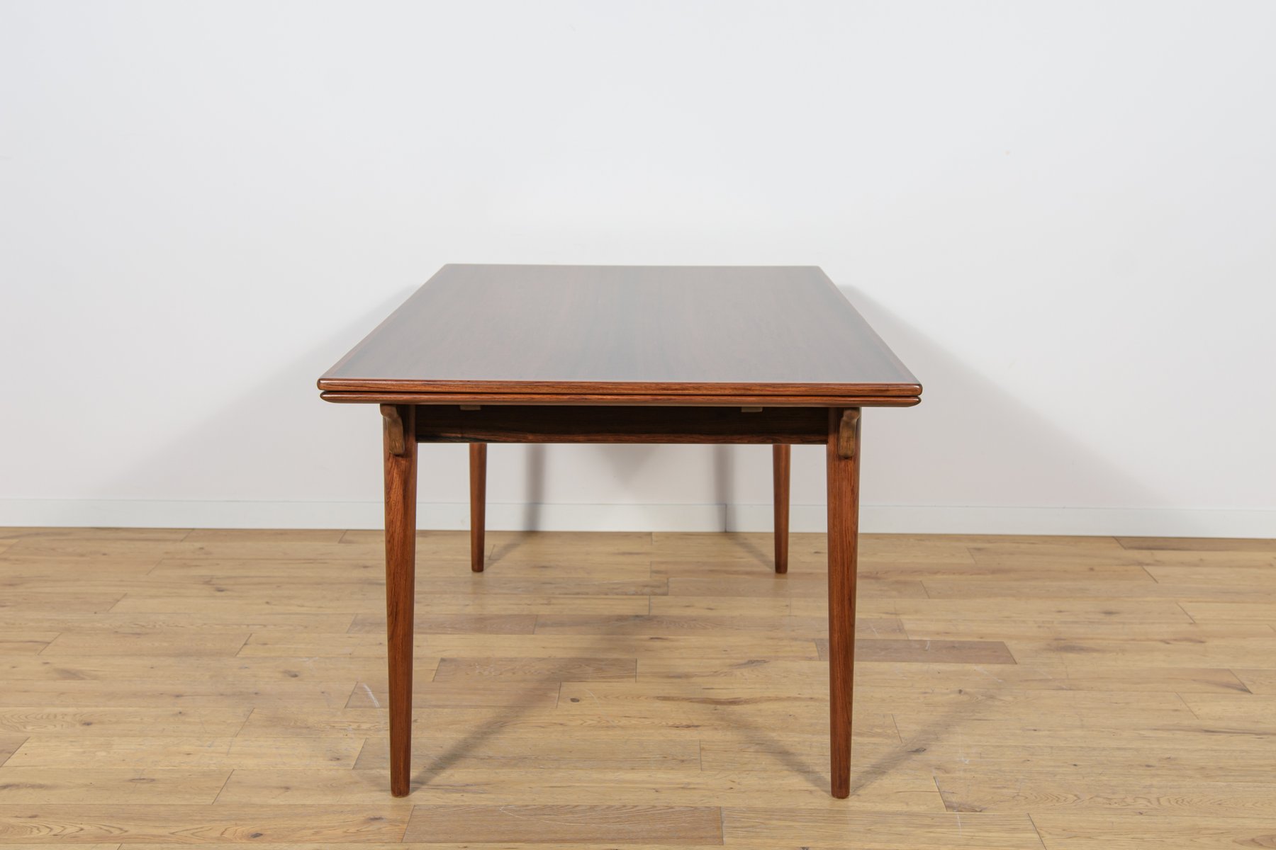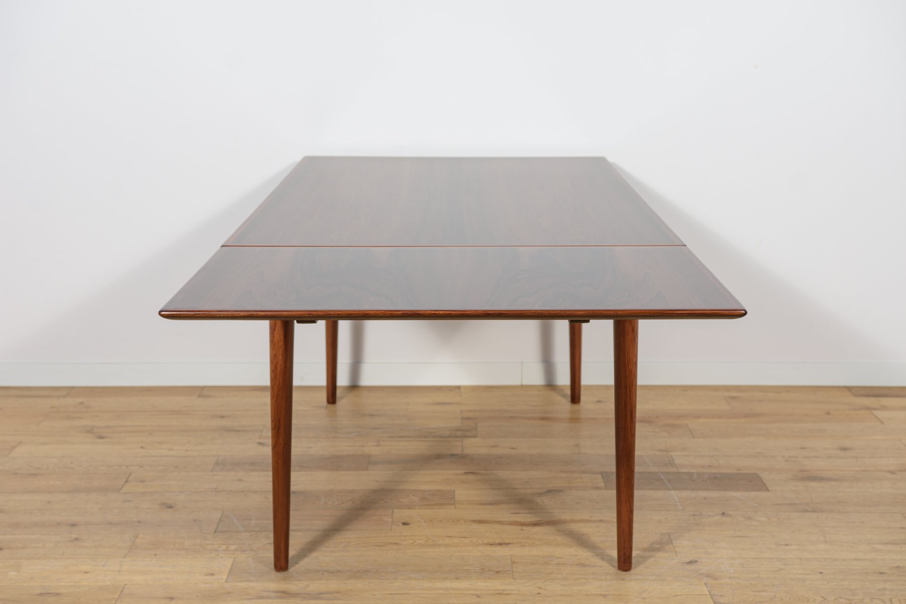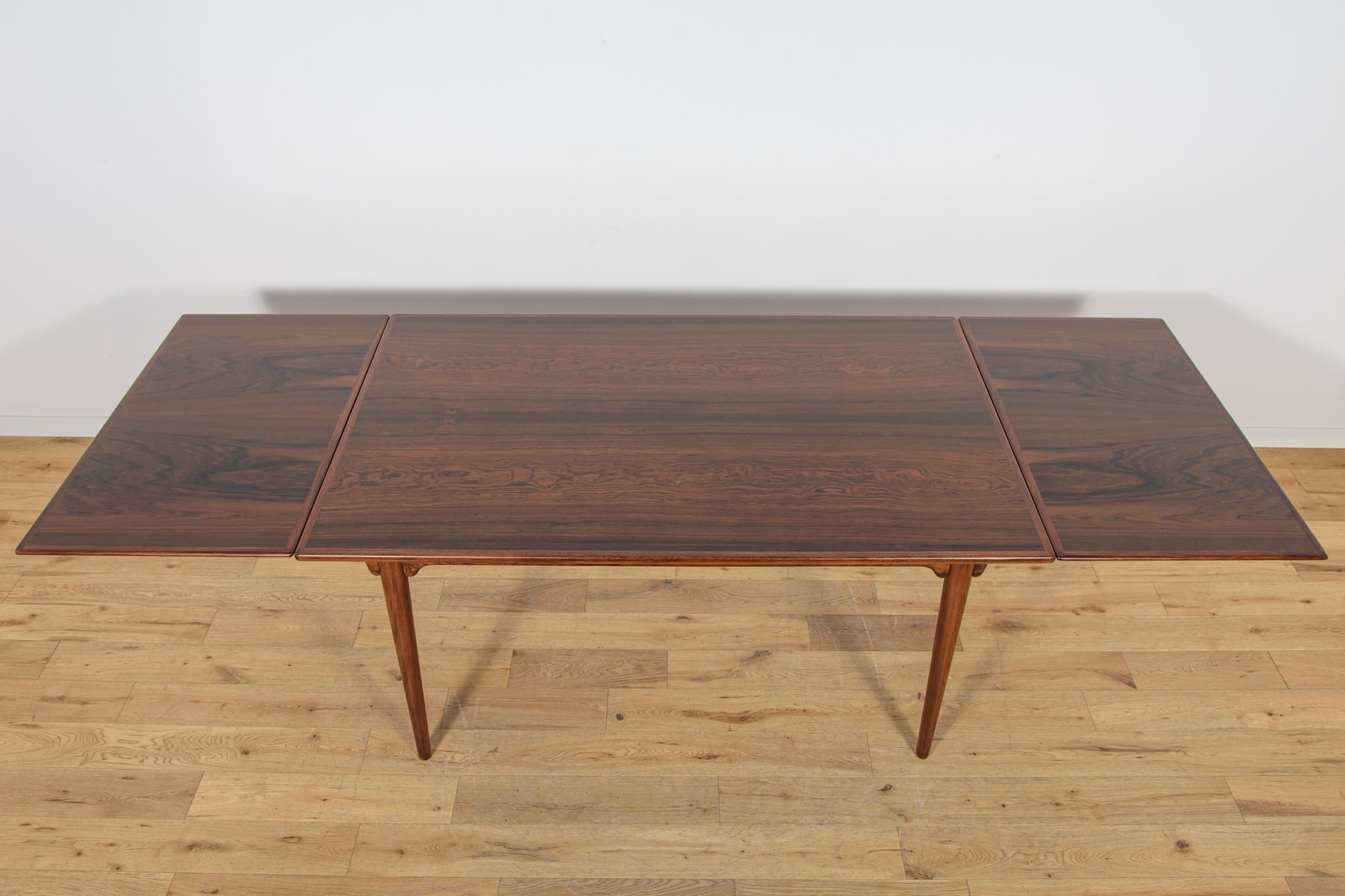 The table can be extended using two Dutch-style leaves, when pulled, they slide out. You can use either one or both leaves, depending on your needs. Each extension leaf measures 54 cm. This makes the width of the table 254 cm.This piece of furniture has a unique shape. The tabletop has reinforced solid edges. The piece, with its interesting grain, has been professionally restored. The rosewood has been cleaned of its old surface, painted with rosewood stain, and finished with a strong semi-matte varnish.