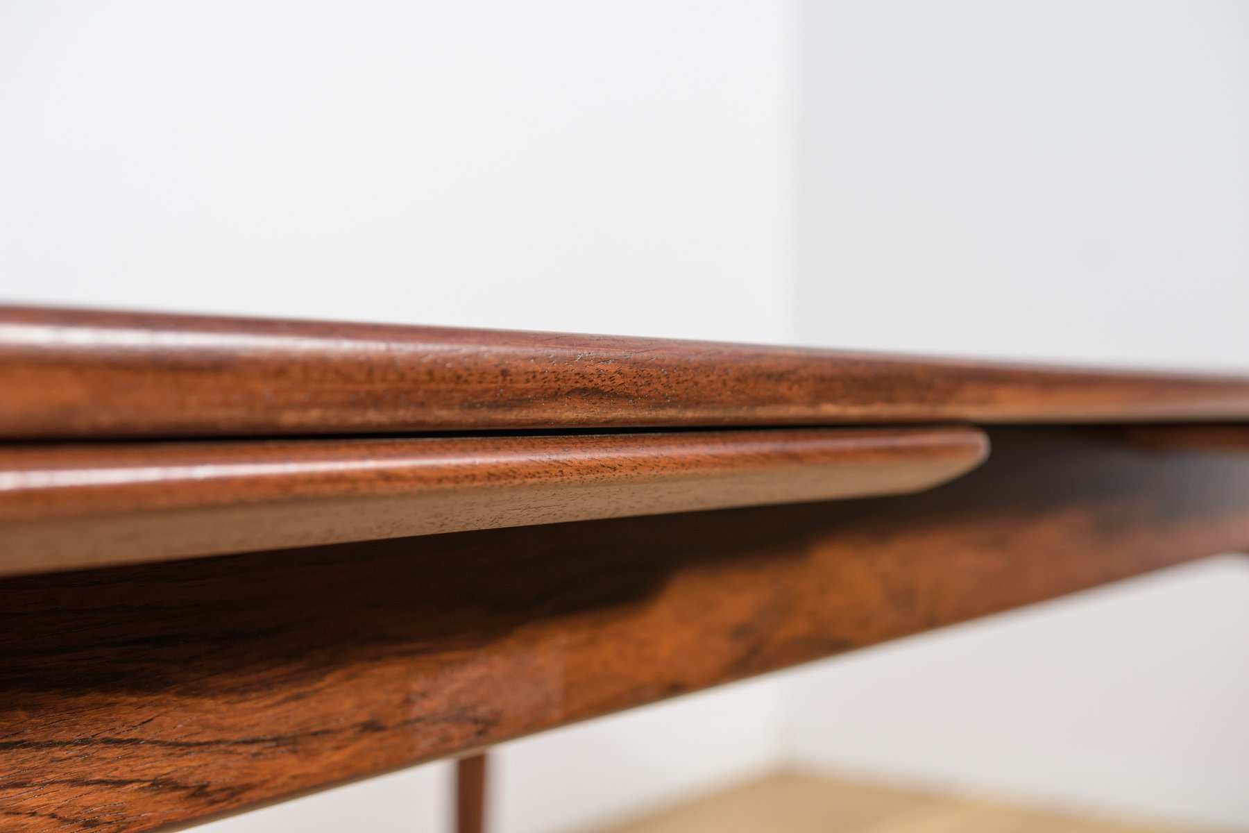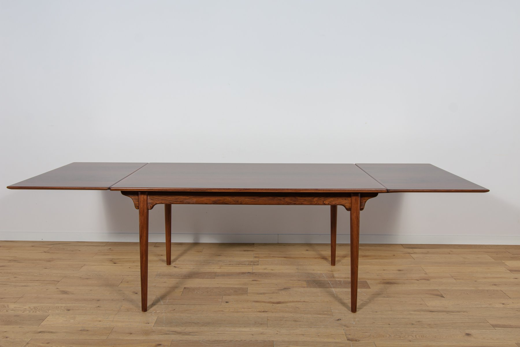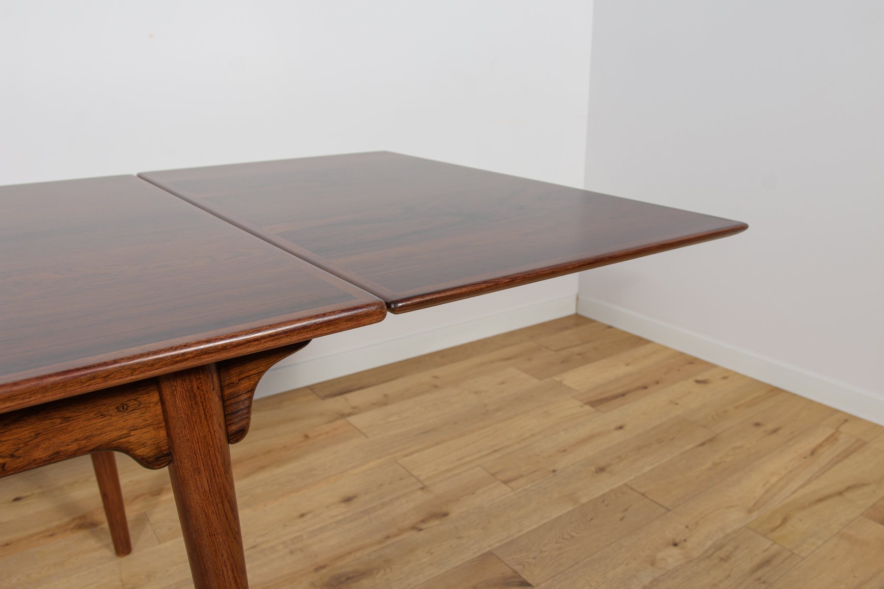 The table can be extended using two Dutch-style leaves, when pulled, they slide out. You can use either one or both leaves, depending on your needs. Each extension leaf measures 54 cm. This makes the width of the table 254 cm.This piece of furniture has a unique shape. The tabletop has reinforced solid edges. The piece, with its interesting grain, has been professionally restored. The rosewood has been cleaned of its old surface, painted with rosewood stain, and finished with a strong semi-matte varnish.