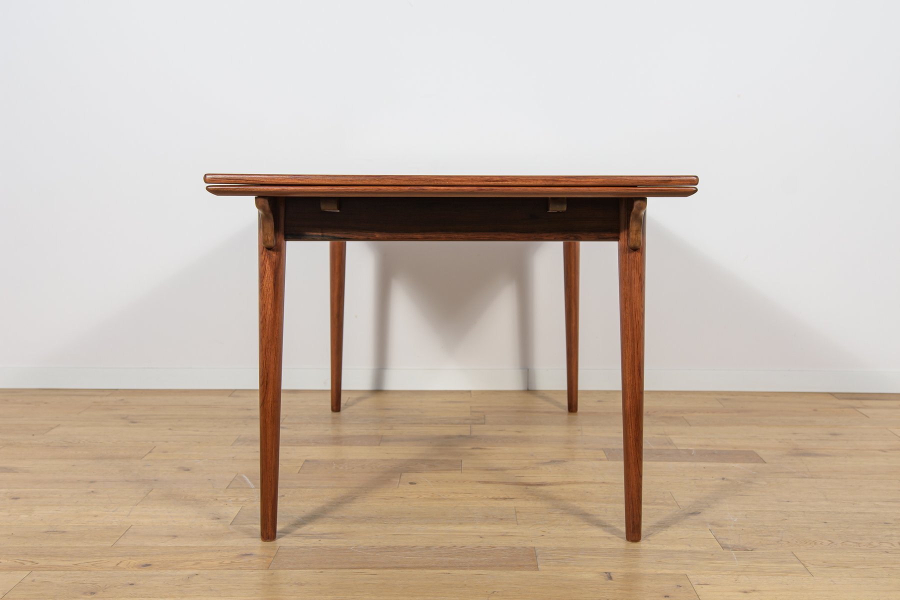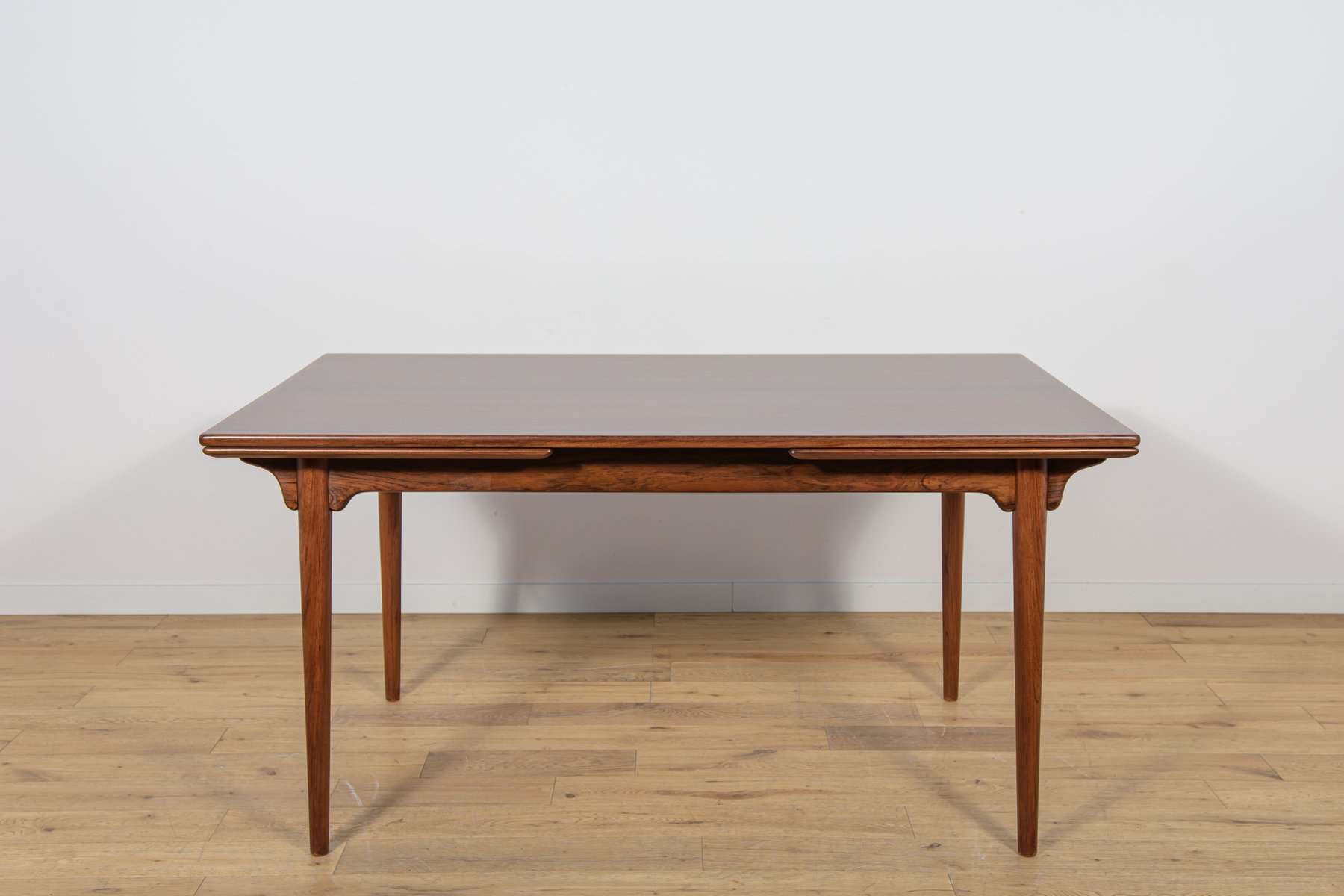 Mesa de comedor extensible modelo 54 en madera de palisandro, diseñada por Gunni Omann en 1959. Fue fabricada por la empresa familiar danesa Omann Jun Møbelfabrik.